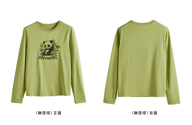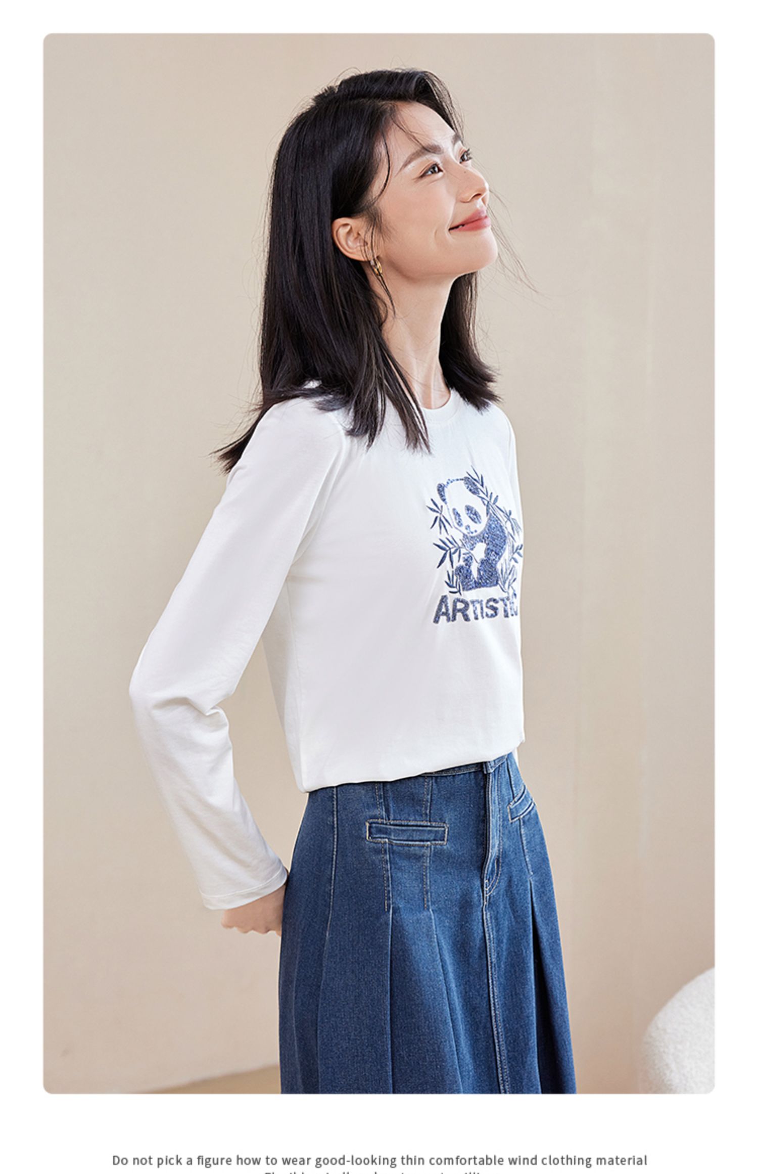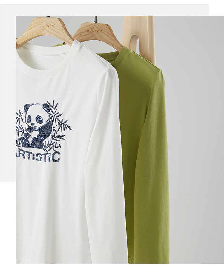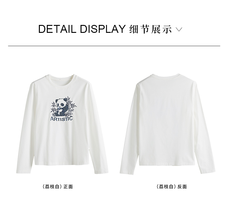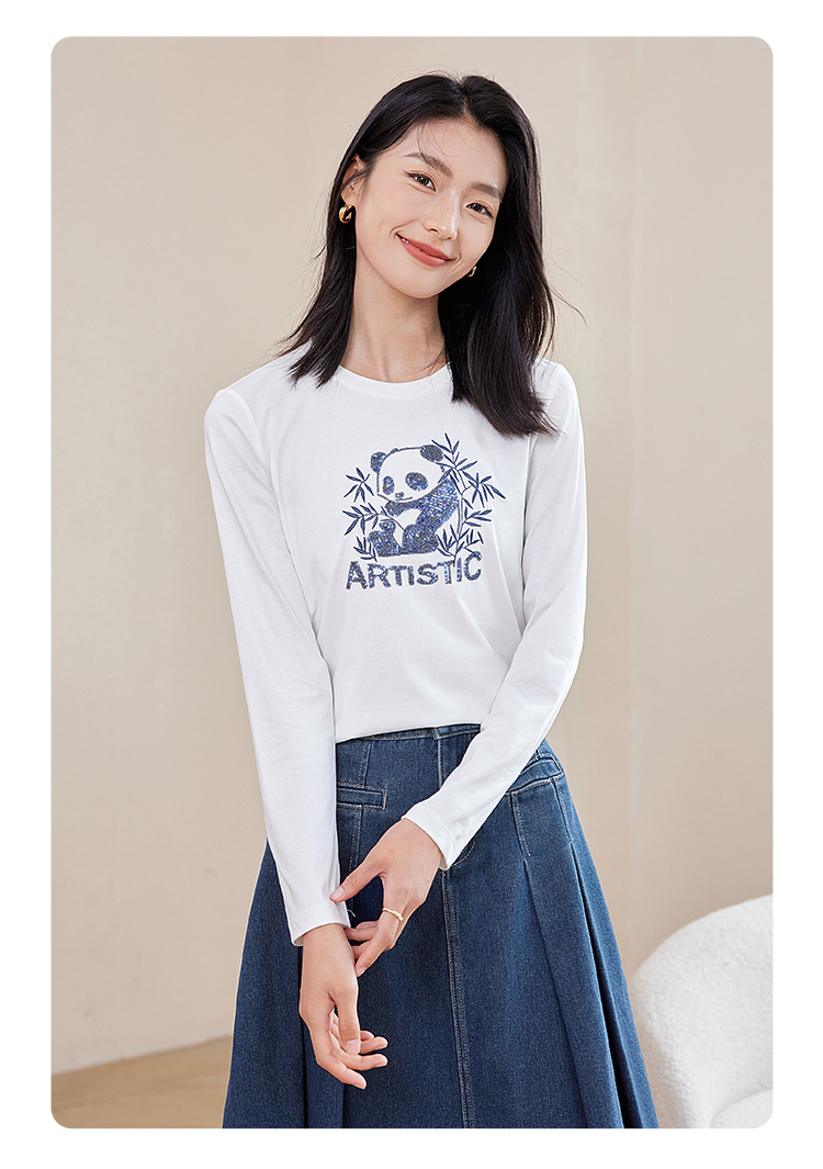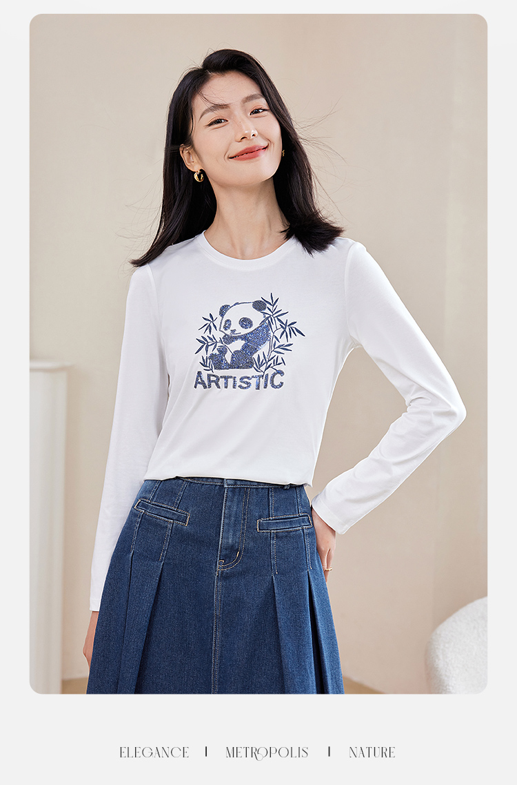 【年终特卖】熙世界2025春秋新款国潮熊猫珠片白色T恤长袖休闲圆领体恤上衣
