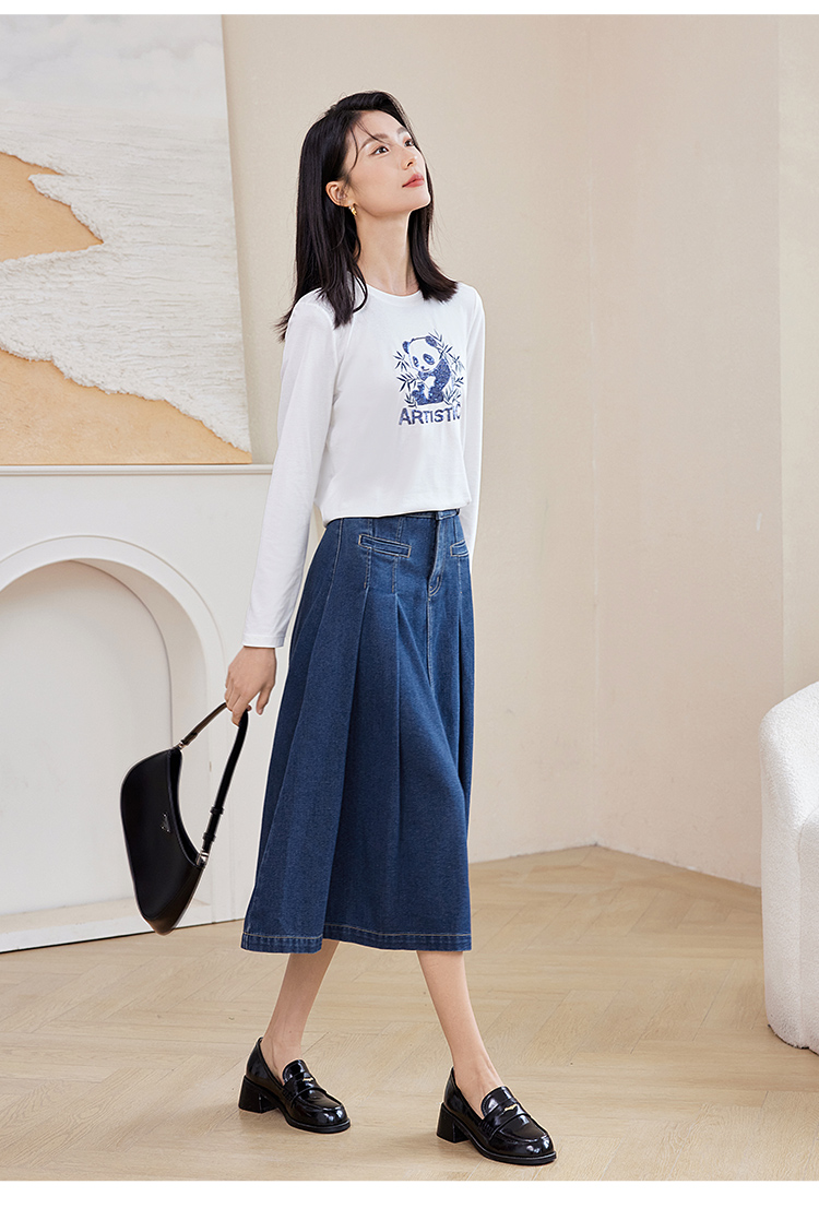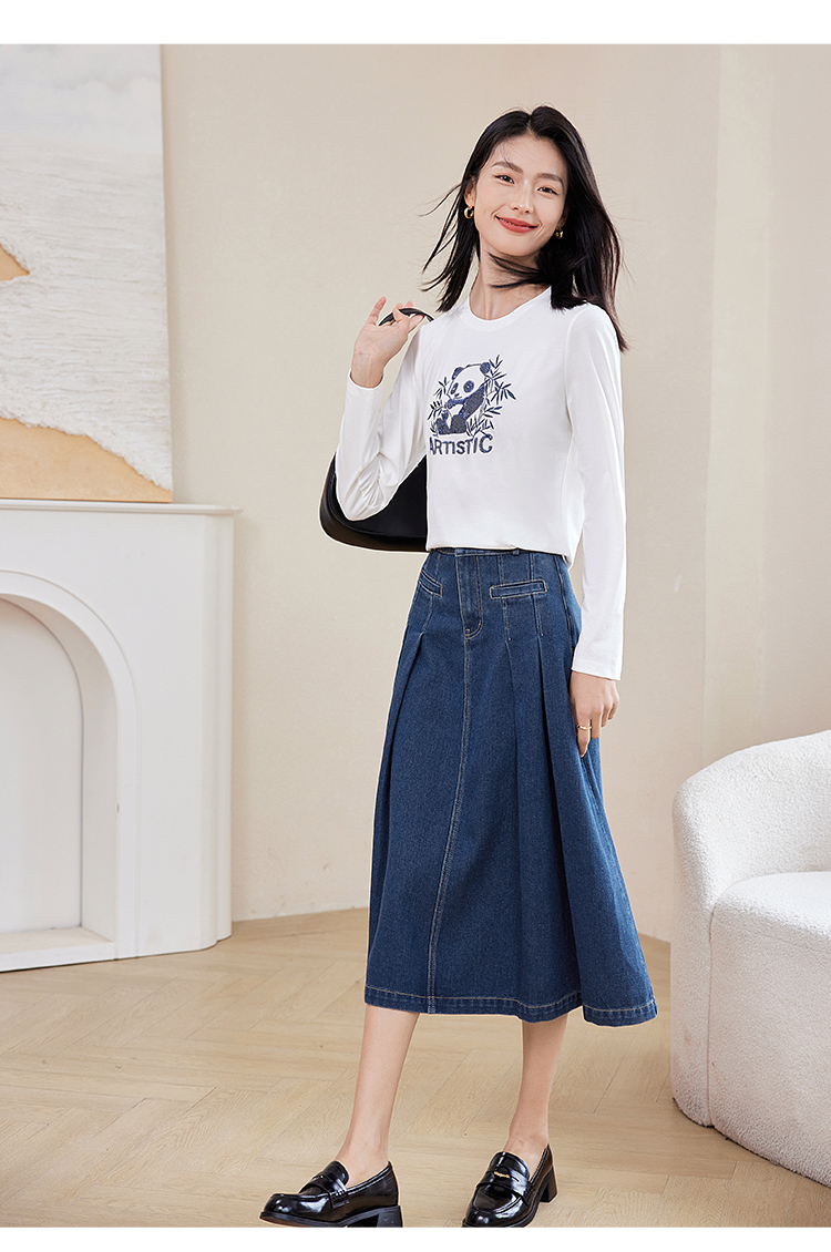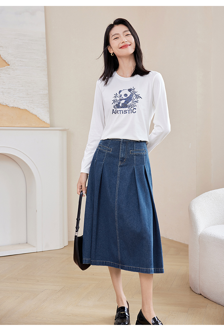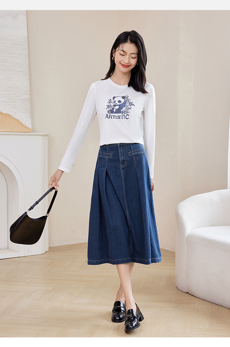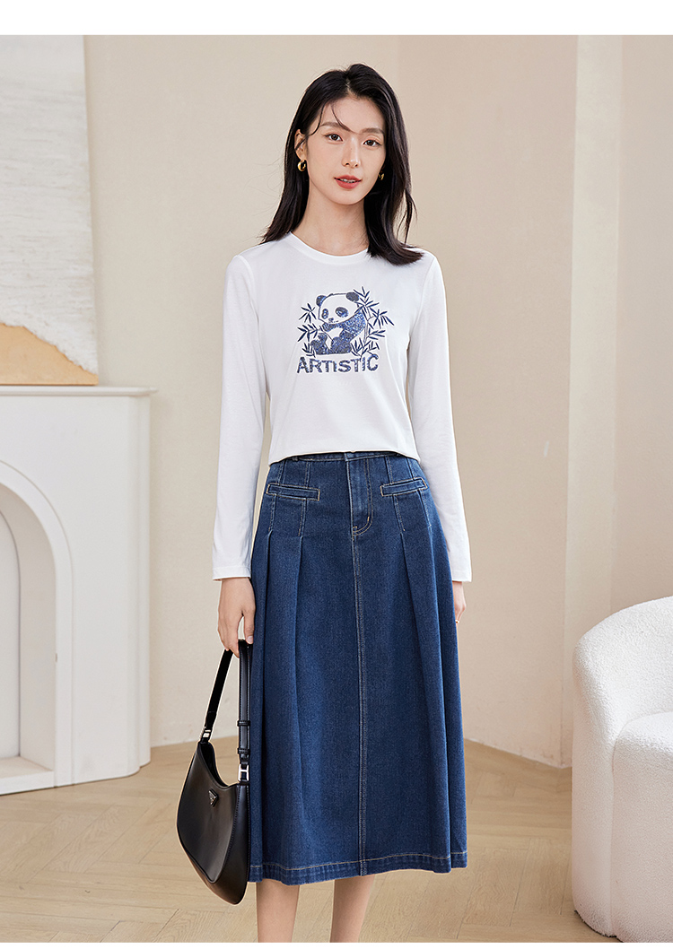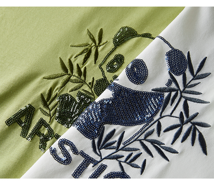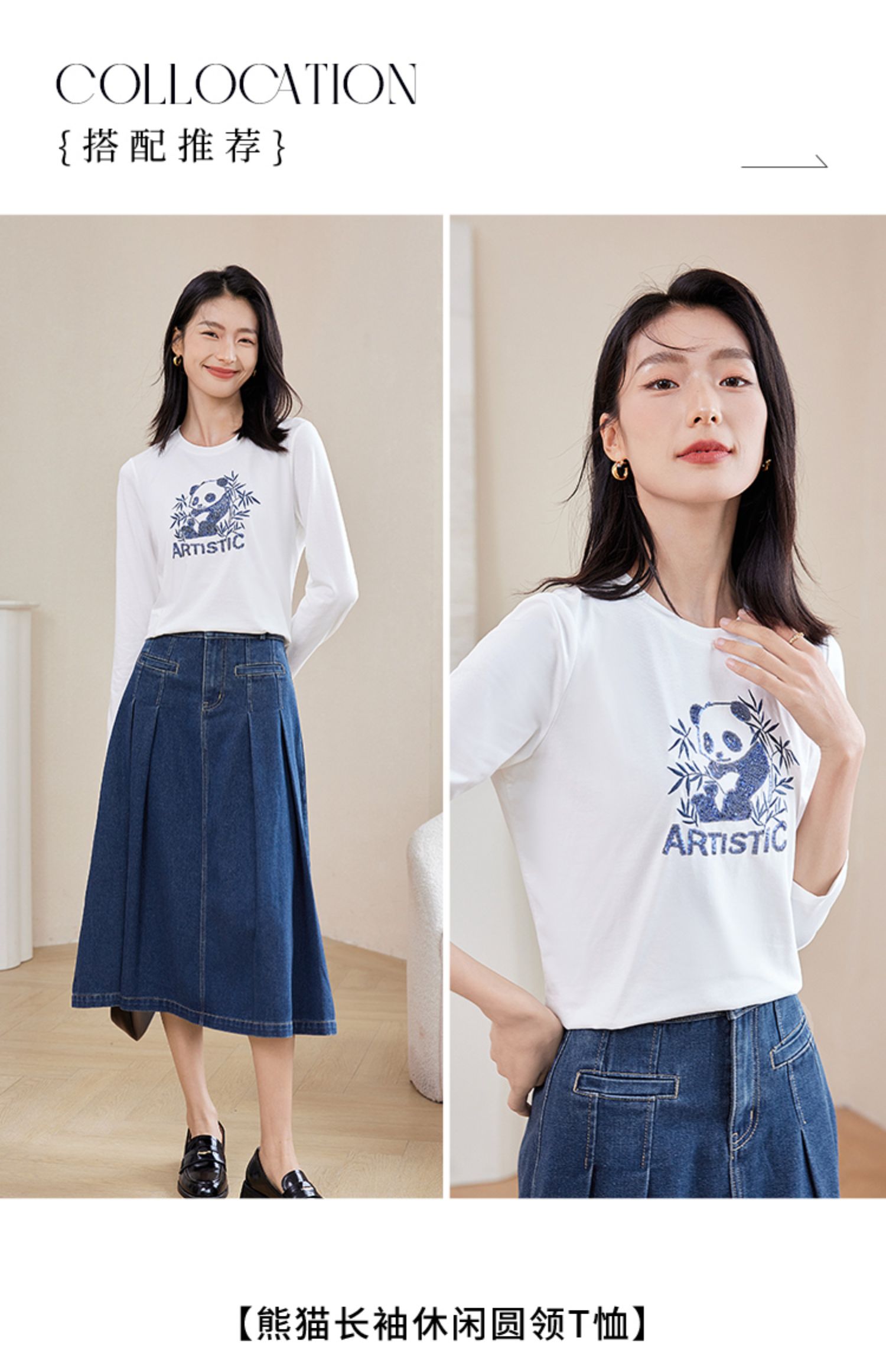 【年终特卖】熙世界2025春秋新款国潮熊猫珠片白色T恤长袖休闲圆领体恤上衣