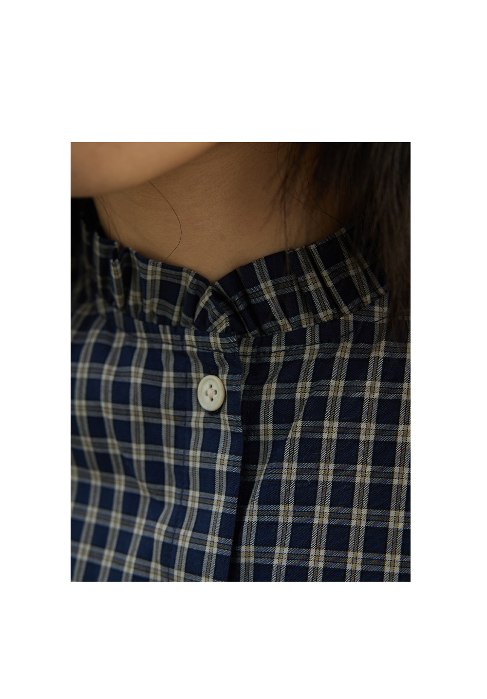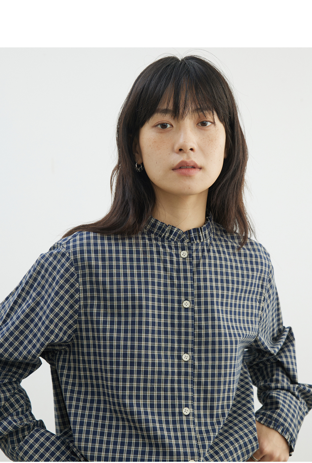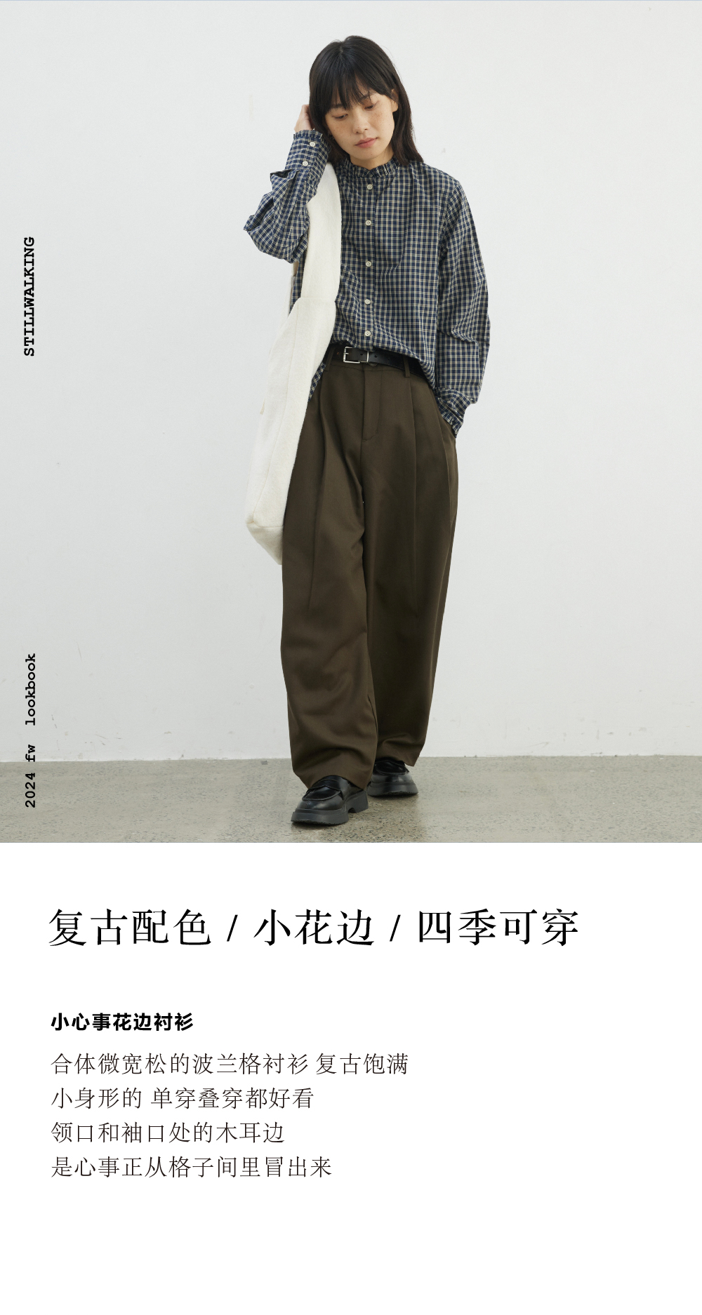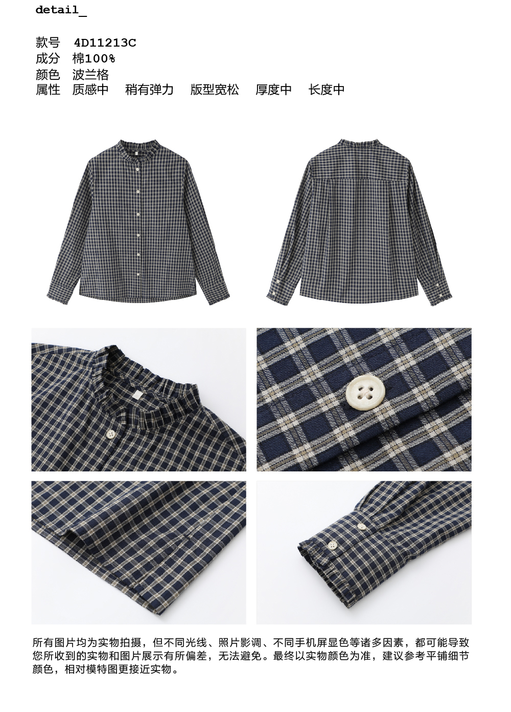 步履不停/4D11213C/复古文艺风花边小立领纯棉格子衬衫