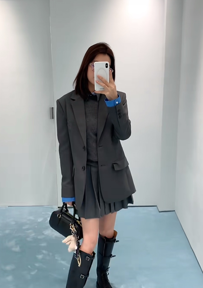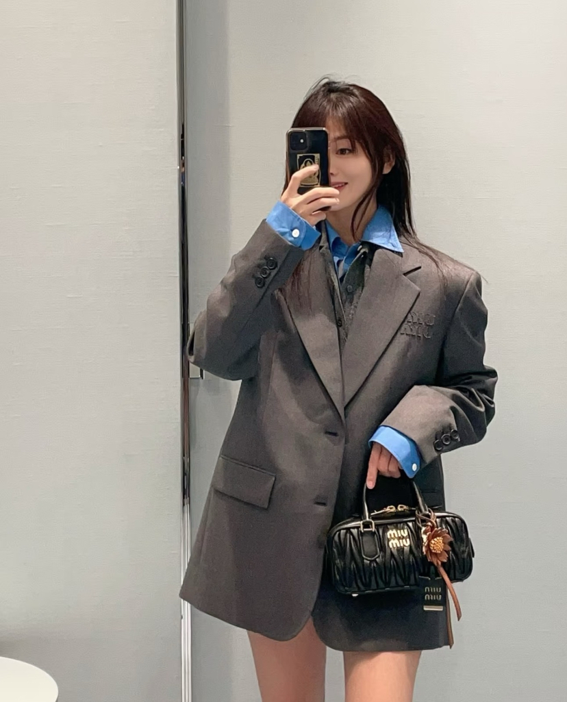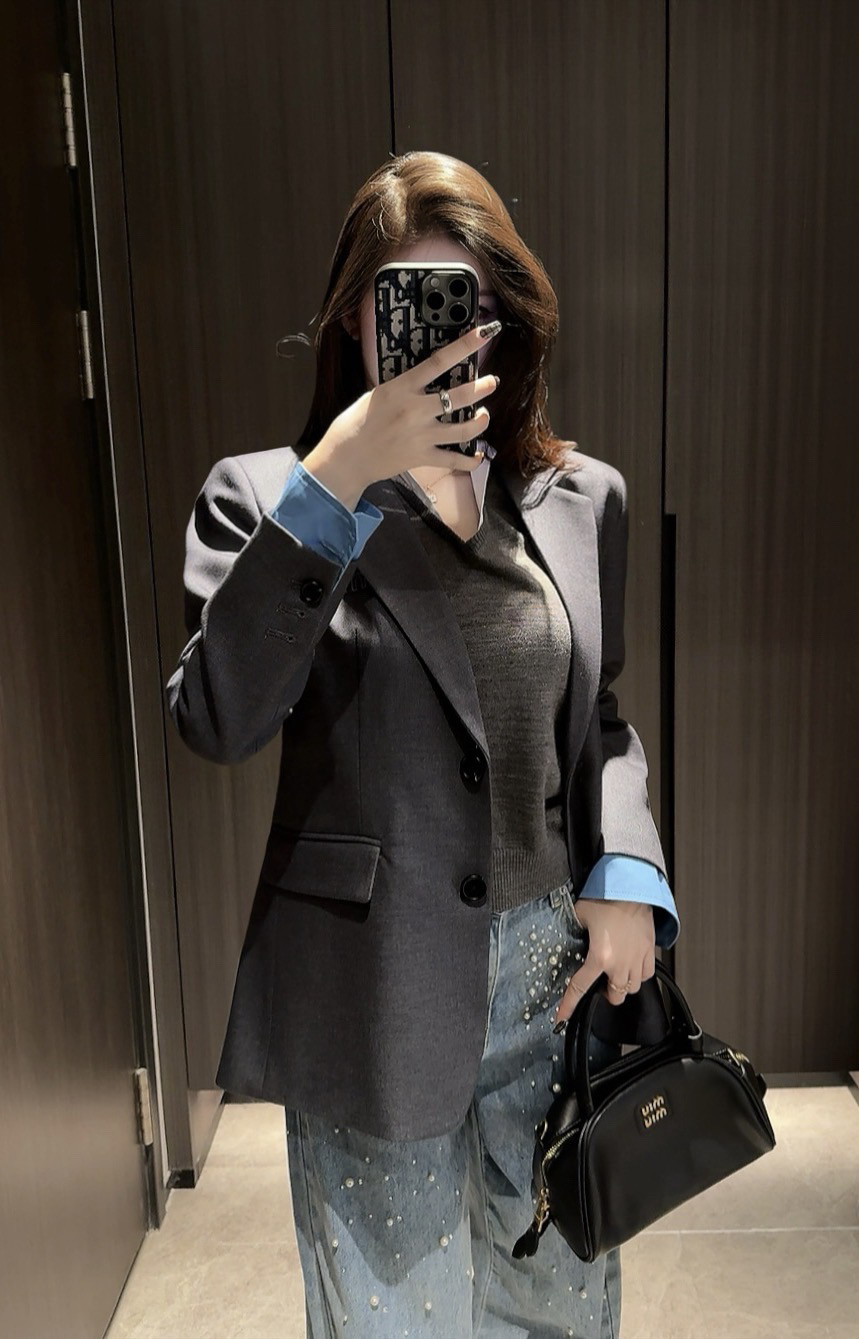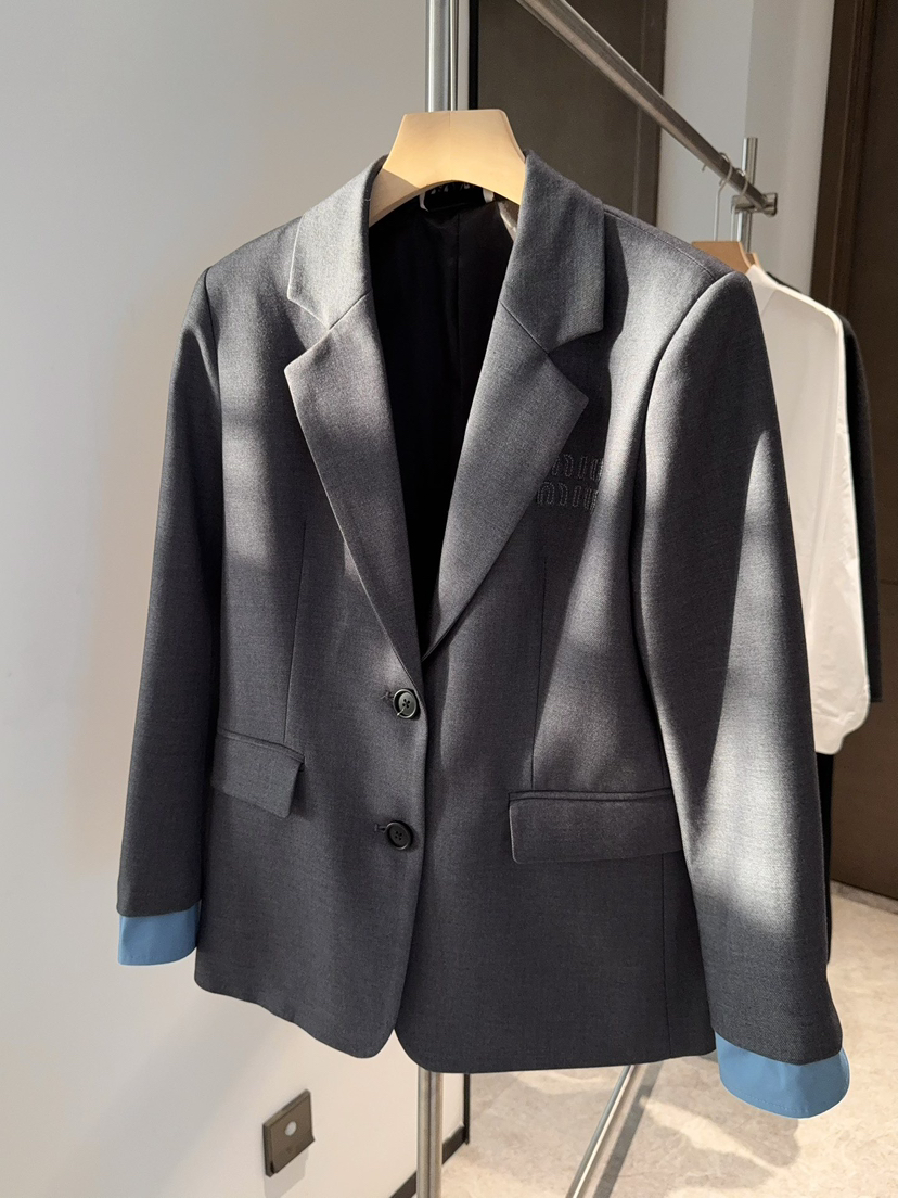 314-1大爆款 miu女士撞色拼接西服 深灰/蓝色袖口西装