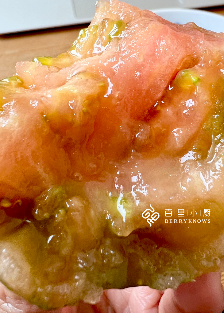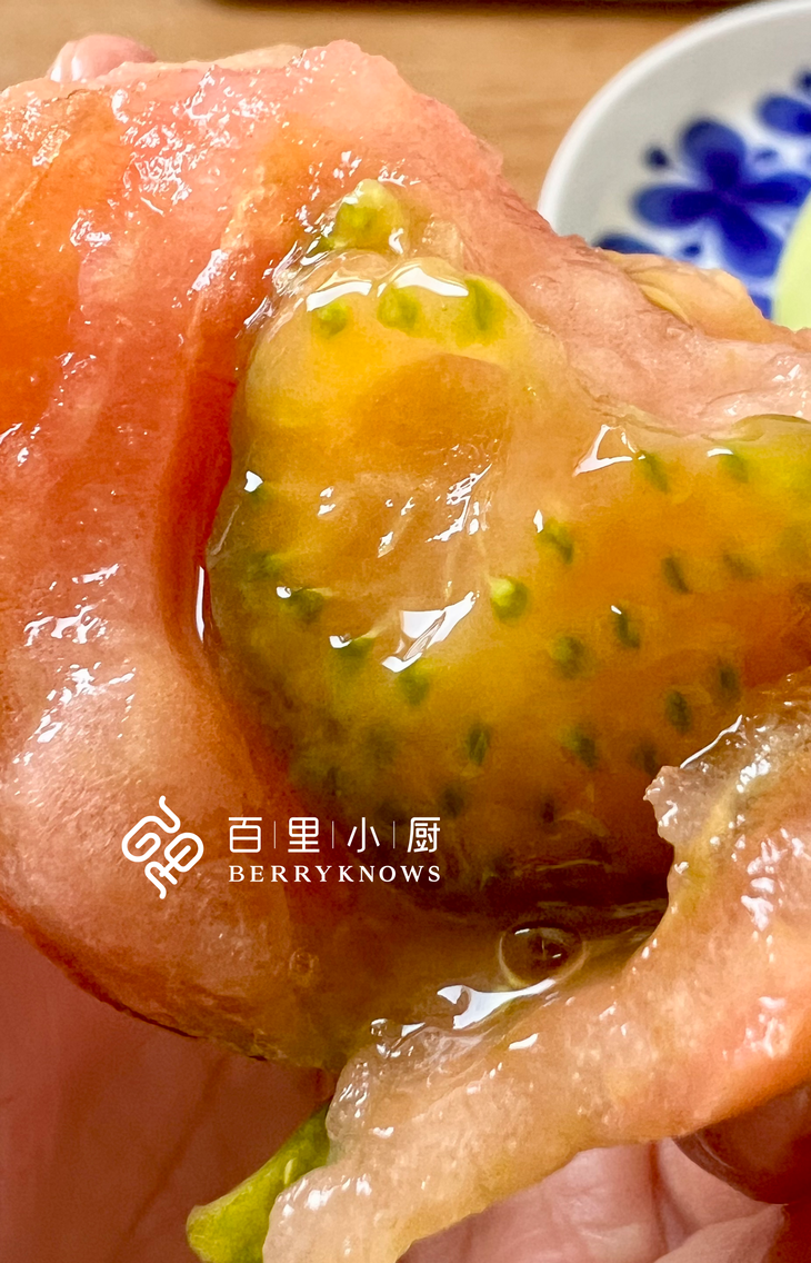 说话的间隙, 随手摘了两个泛红的洋柿子说:你们尝尝,小心翼翼的掰开,还是洒了一手的汁水,籽粒饱满,没有膨大的空心,沙瓤的质感,由于在生长过程中细胞相互之间的黏附,也由于酶的作用而逐渐弱化,使得的果肉变得松软,吮吸着溢出的汁液,伴着满口的香甜,一口回到小时候。