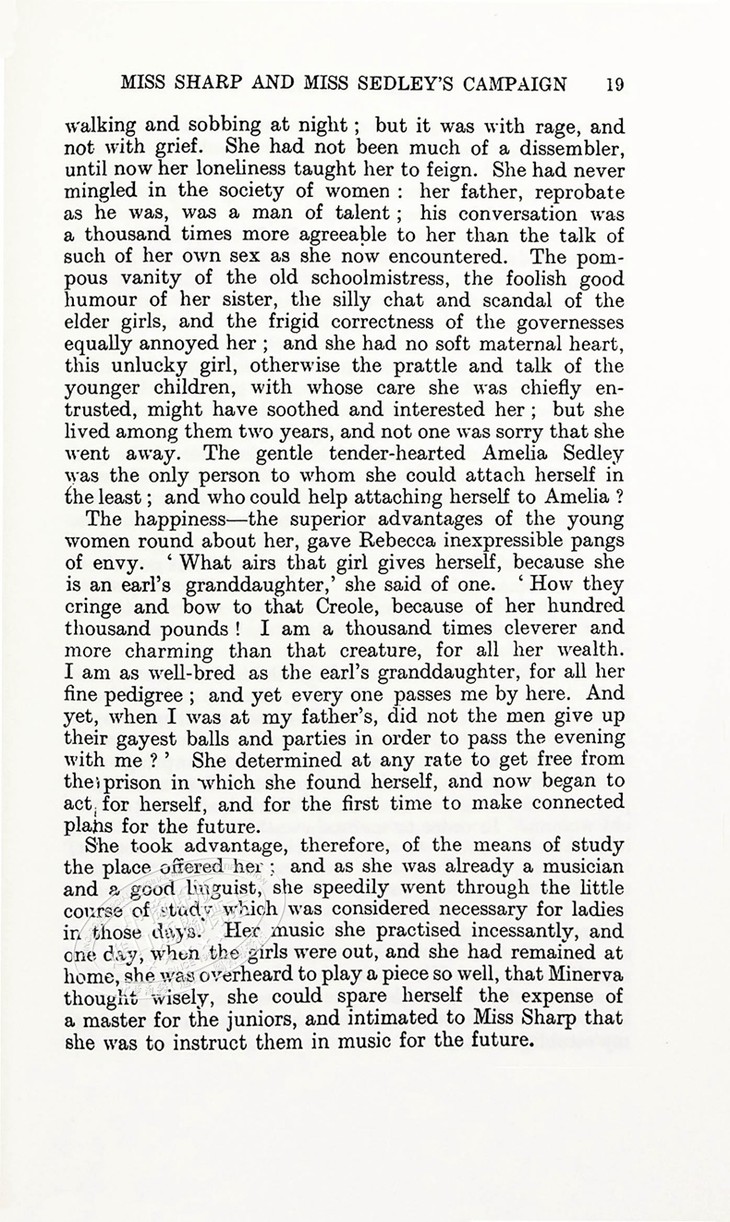Becky Sharp is sharp, calculating, and determined to succeed. Craving wealth and a position in society, she charms, hoodwinks, manipulates everyone she meets, rising in the world as she attaches herself to a succession of rich men. Becky's fortunes are contrasted with those of her best friend Amelia, who has none of Becky's wit and vitality but whose gentle-heartedness attracts the devotion of the loyal Dobbin.