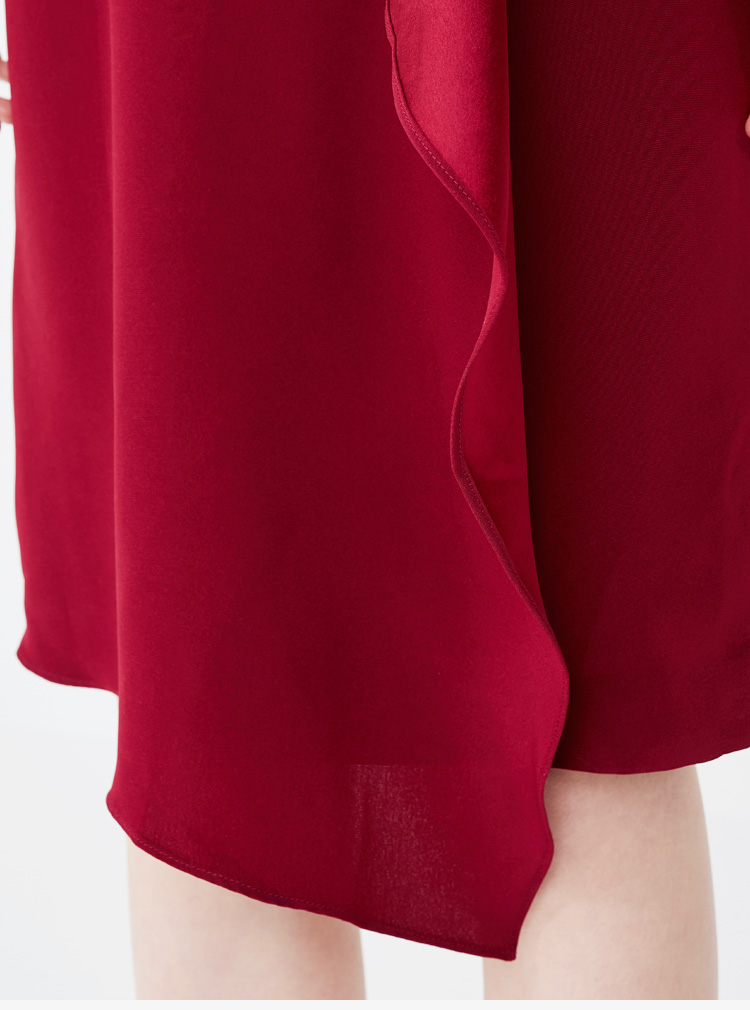 皮尔卡丹大牌女装酒红色短袖圆领连衣裙时尚中长款不规则裙子女