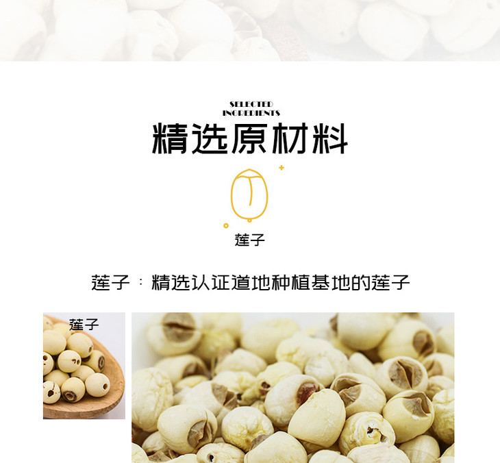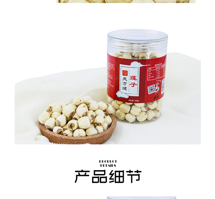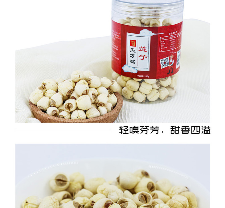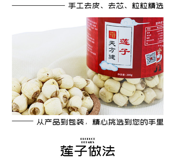 莲子瓶装200克,源自道地产区湖南基地,颗颗精选,手工去皮、去芯。无需浸泡