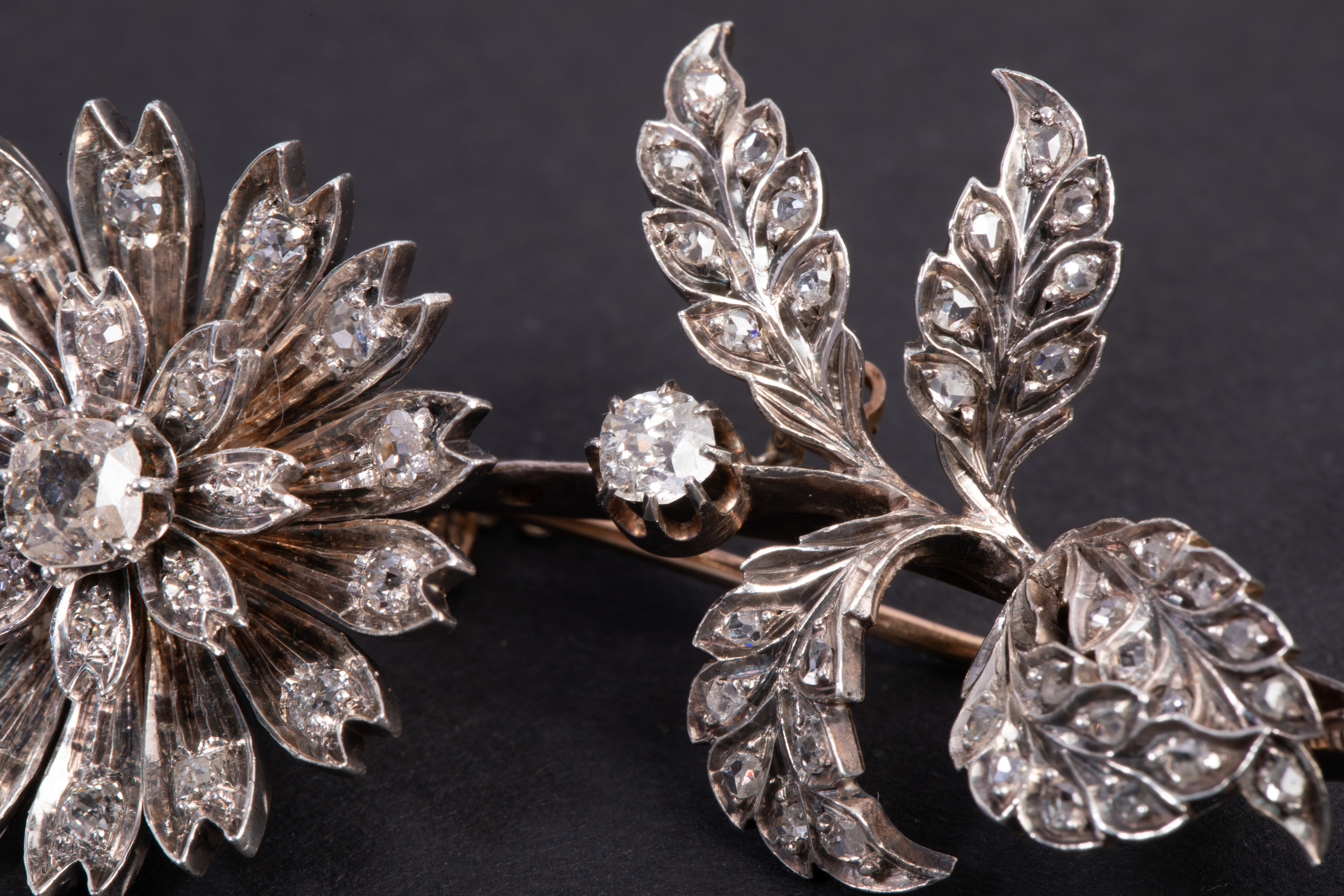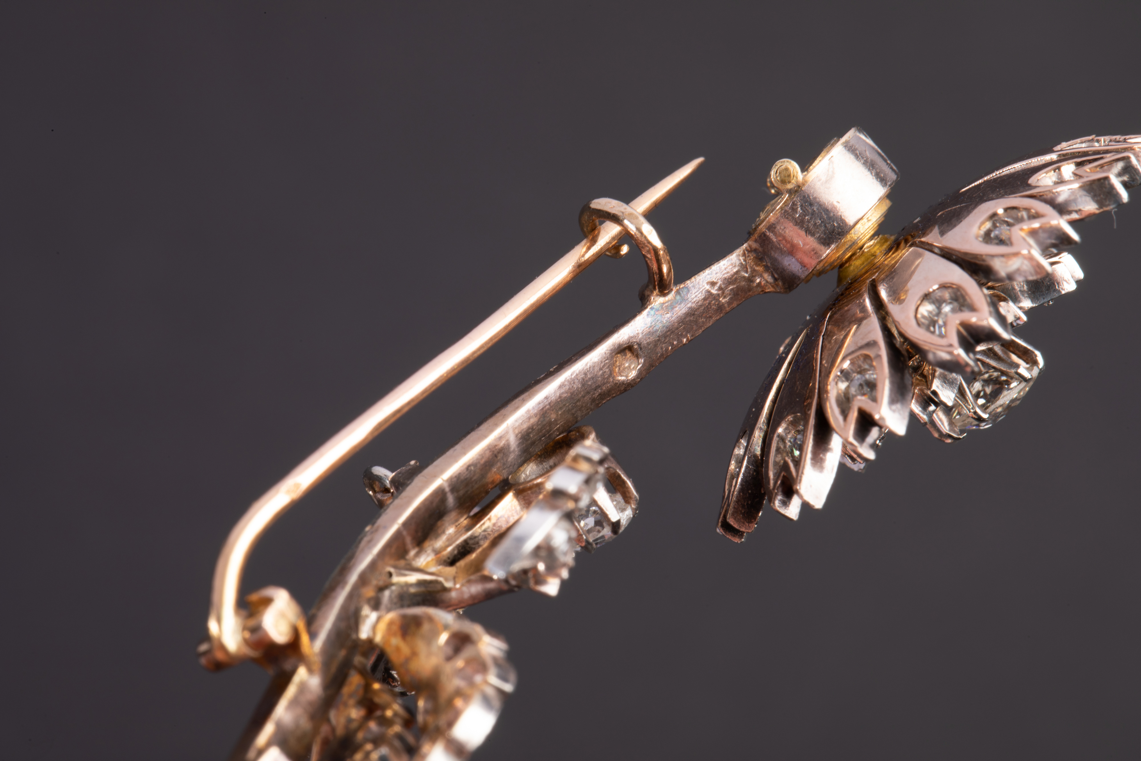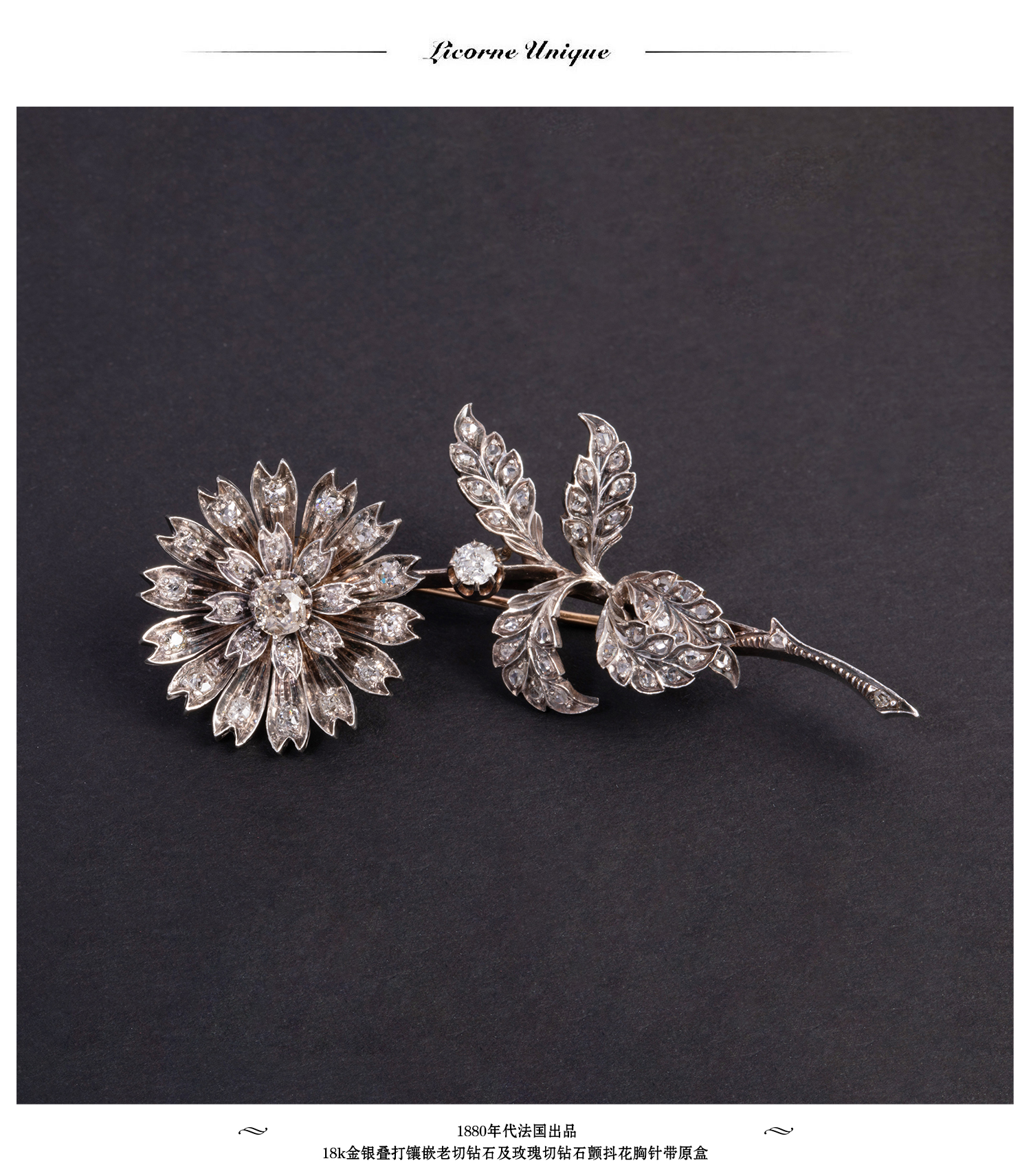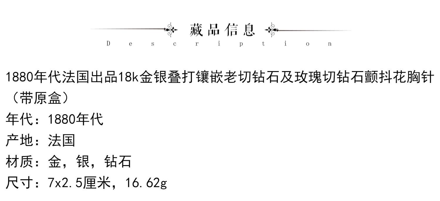 独角鹿西洋古董珠宝首法国18k金银镶嵌钻石玫瑰切钻石颤抖花胸针