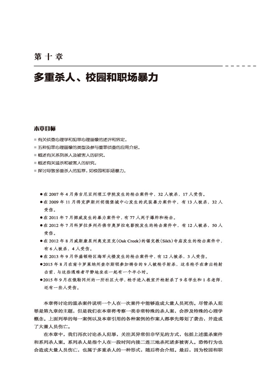 在过去的20多年间,本书的两位作者对本书不断进行着修订与完善。和第七版相比,第十一版在章节结构上发生了巨大的变化,新增并扩展了未成年人违法犯罪、人格异常与犯罪、校园暴力与职场暴力、现代恐怖主义、对儿童的性侵害等大量的内容;反映了最新的犯罪学及与犯罪有关专题的心理学理论与模型等成果;根据DSM-5进行了更新。