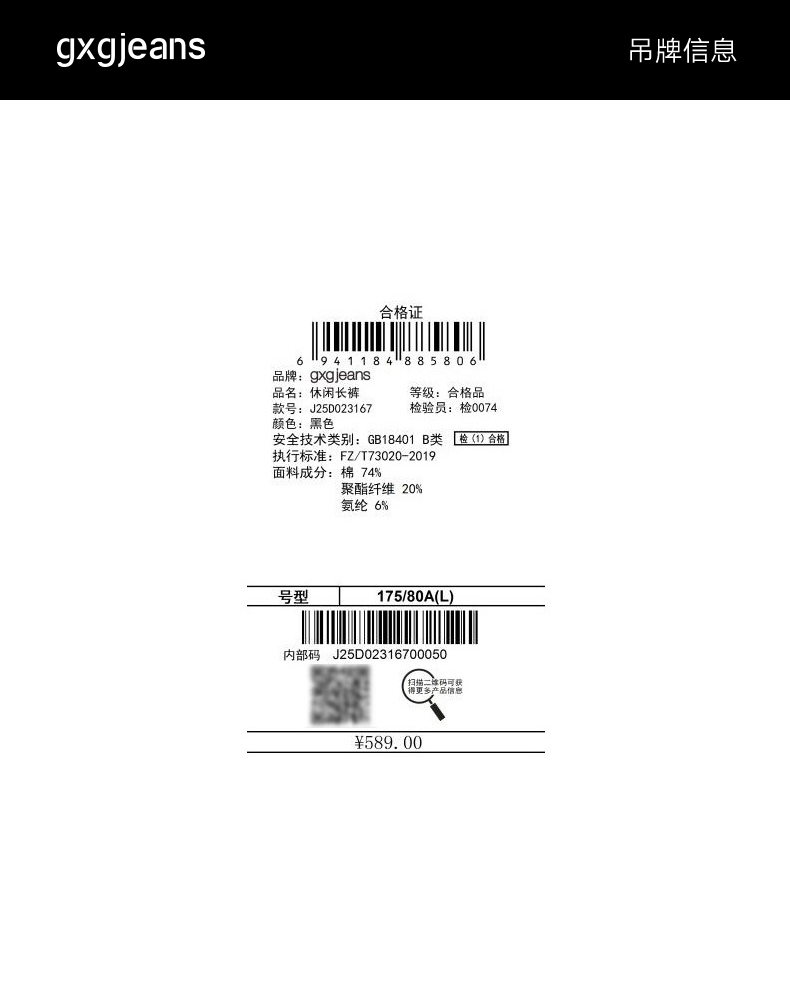 gxg.jeans男装 黑色铆钉装饰潮流基础休闲直筒长裤男 25秋季