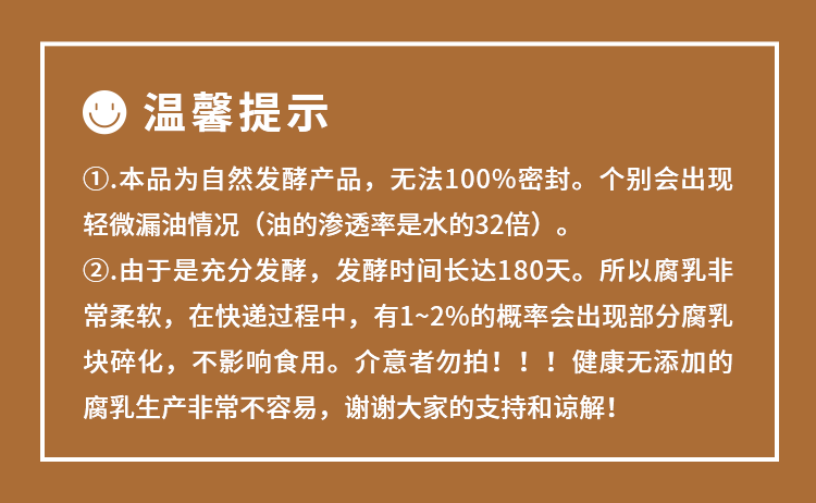 出现轻微漏油和腐乳碎化是正常现象,不属于质量问题,可以正常食用。介意者勿拍!商品是不退不换,不做赔付处理!