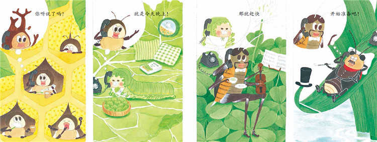 一大早,小昆虫们就开始忙忙碌碌起来:蜜蜂妹妹“嗡嗡,嗡嗡”采蜜,青虫宝宝“嗨哟,嗨哟”摘菜,金钟儿大哥“唧唧唧 ”练习小提琴……它们都在为今天晚上要发生的“大事儿”做准备呢!
