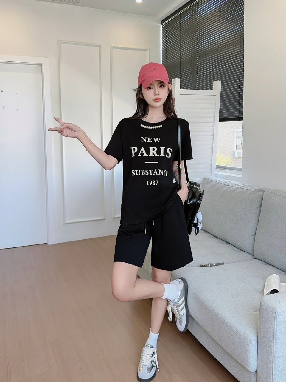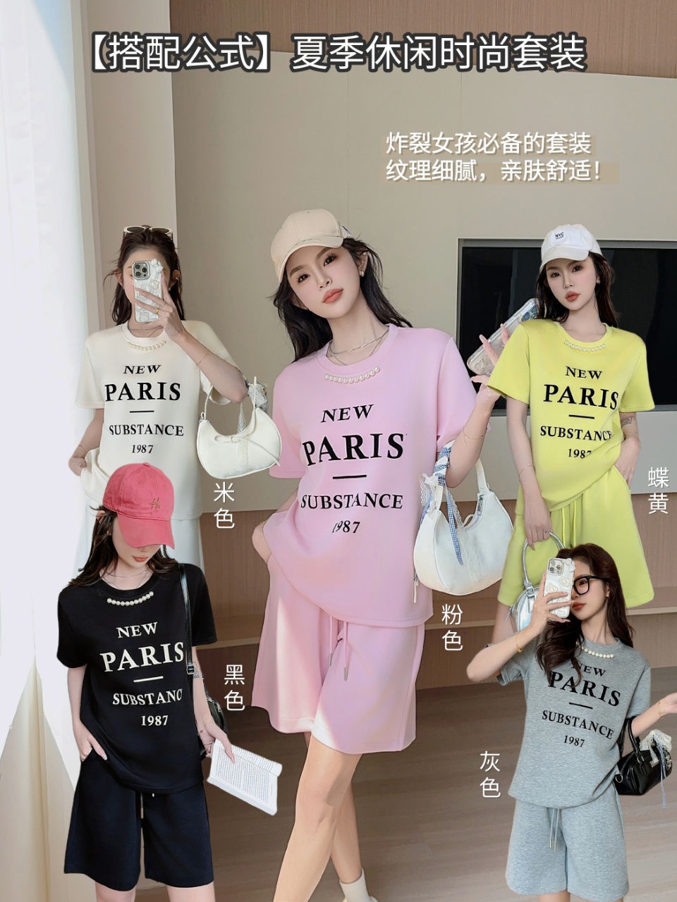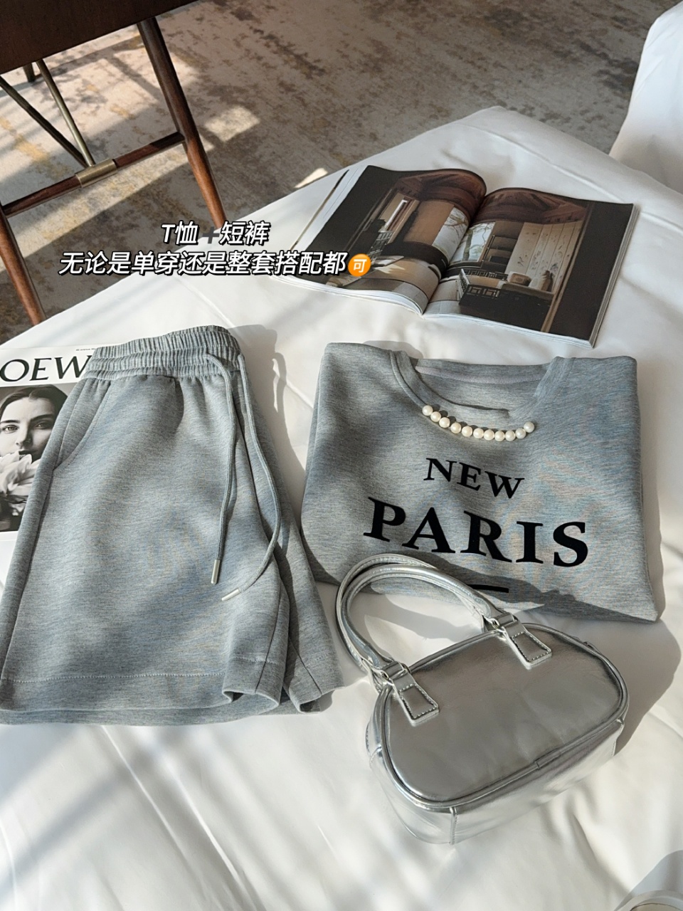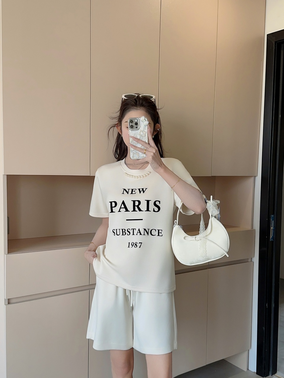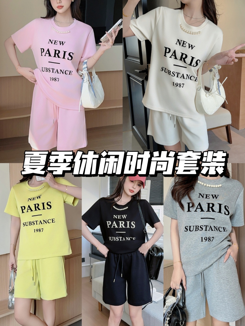 【YW】无忧购“清仓大促”美式复古字母印花钉珠圆领短袖T+休闲短裤套装X2560(截单后3-5天发货)