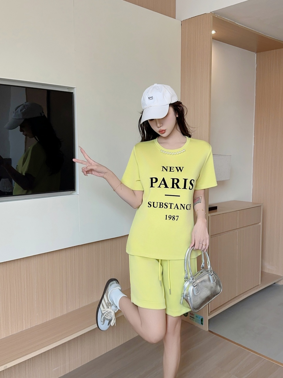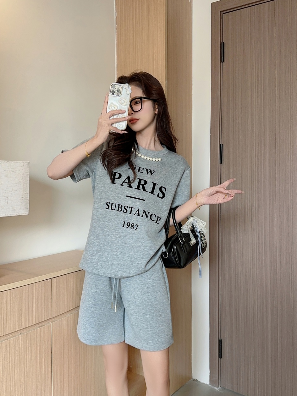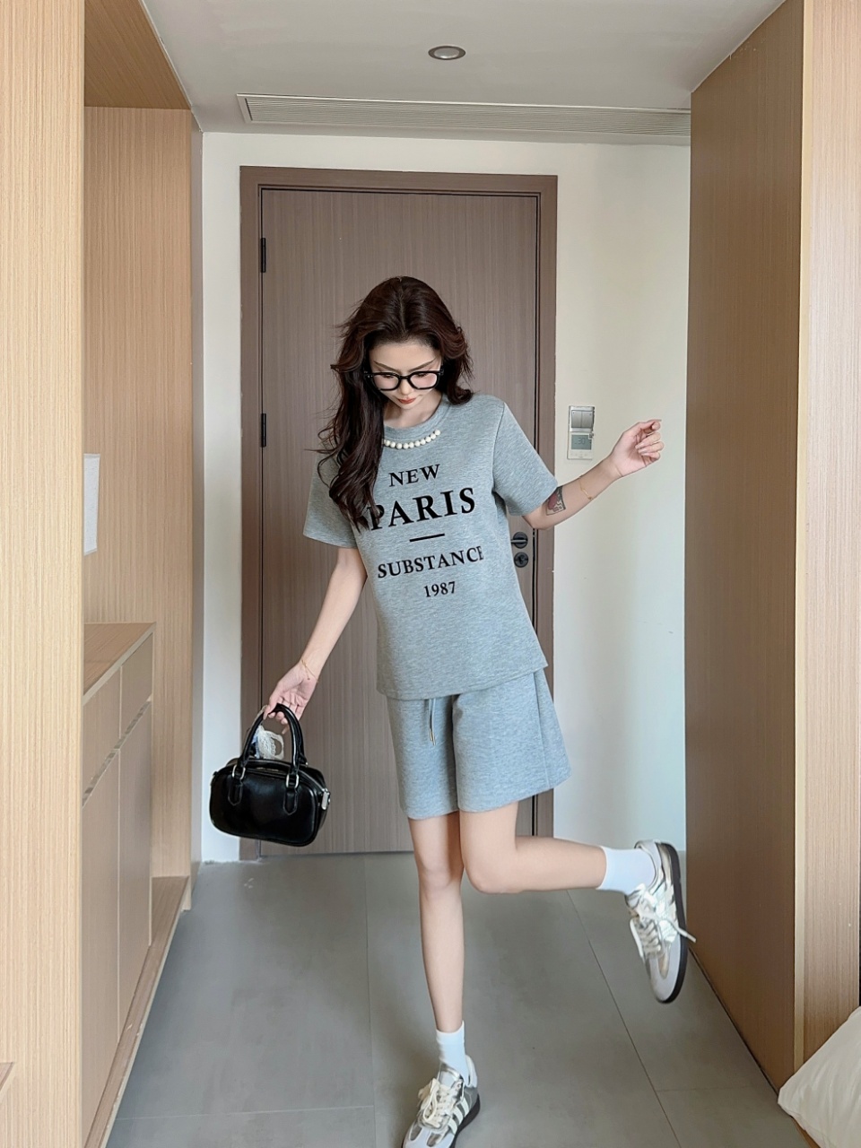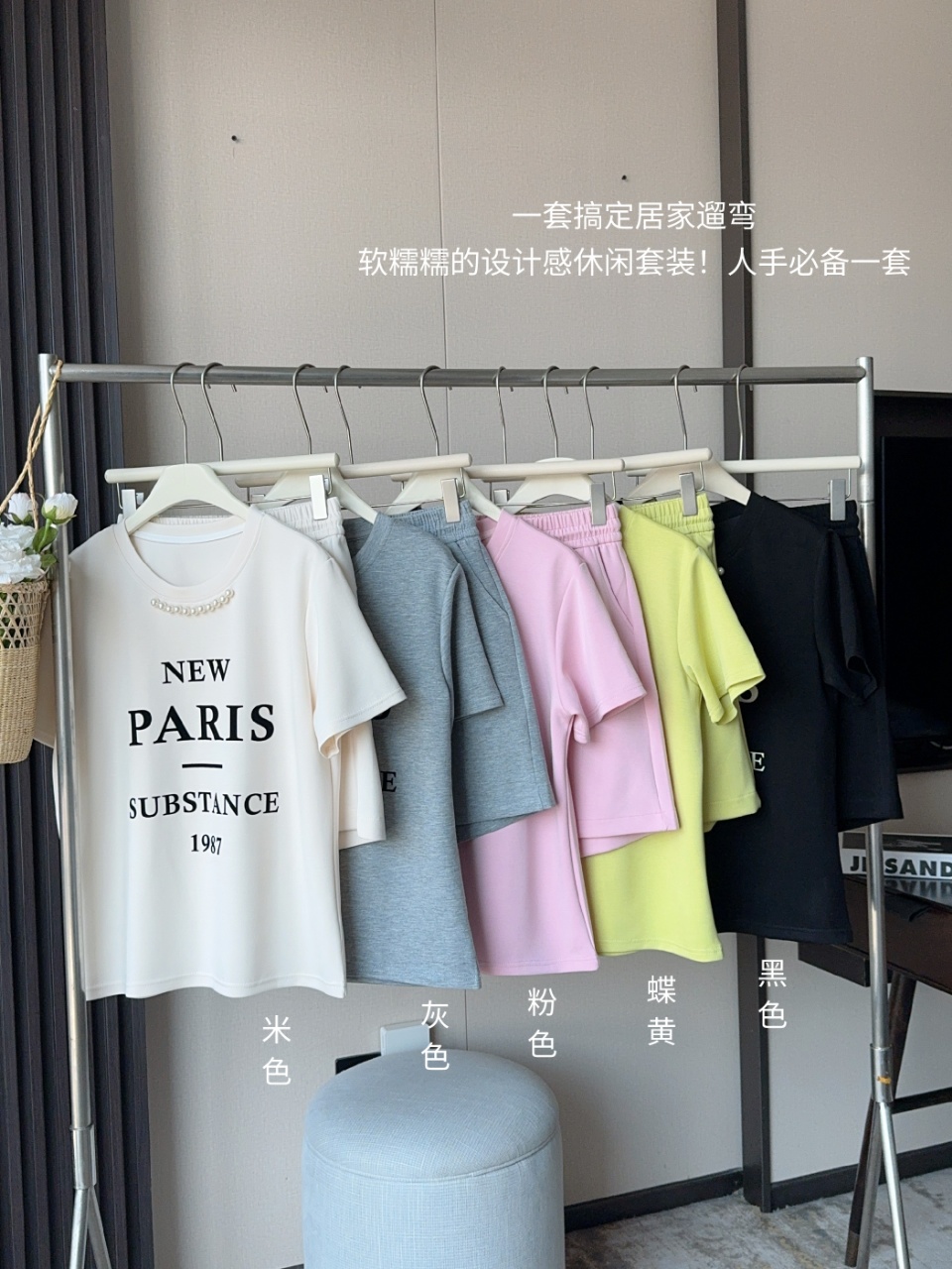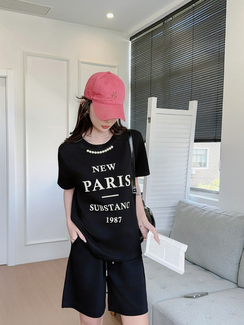 【YW】无忧购“清仓大促”美式复古字母印花钉珠圆领短袖T+休闲短裤套装X2560(截单后3-5天发货)