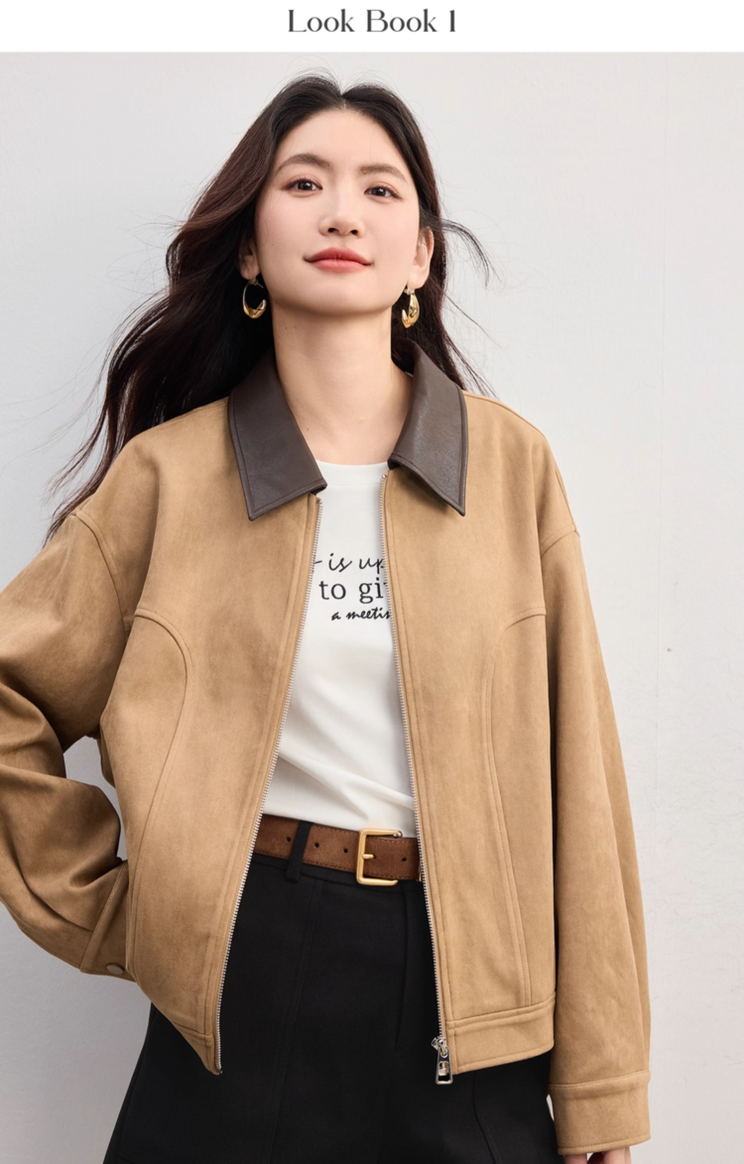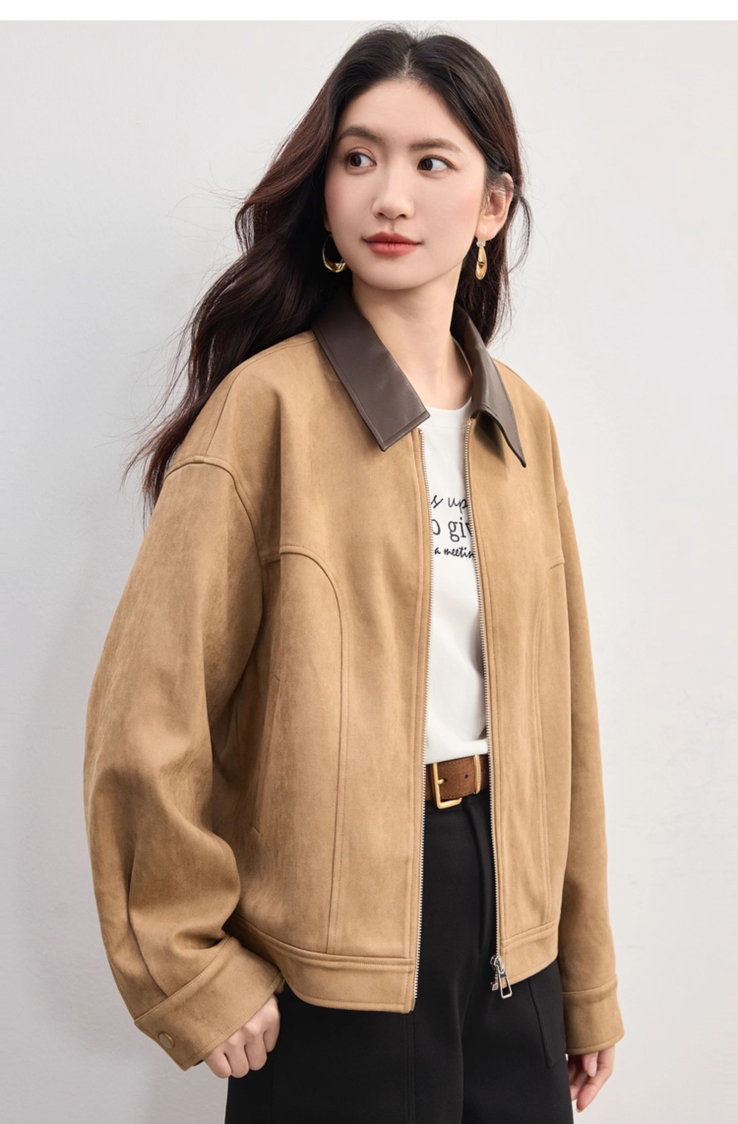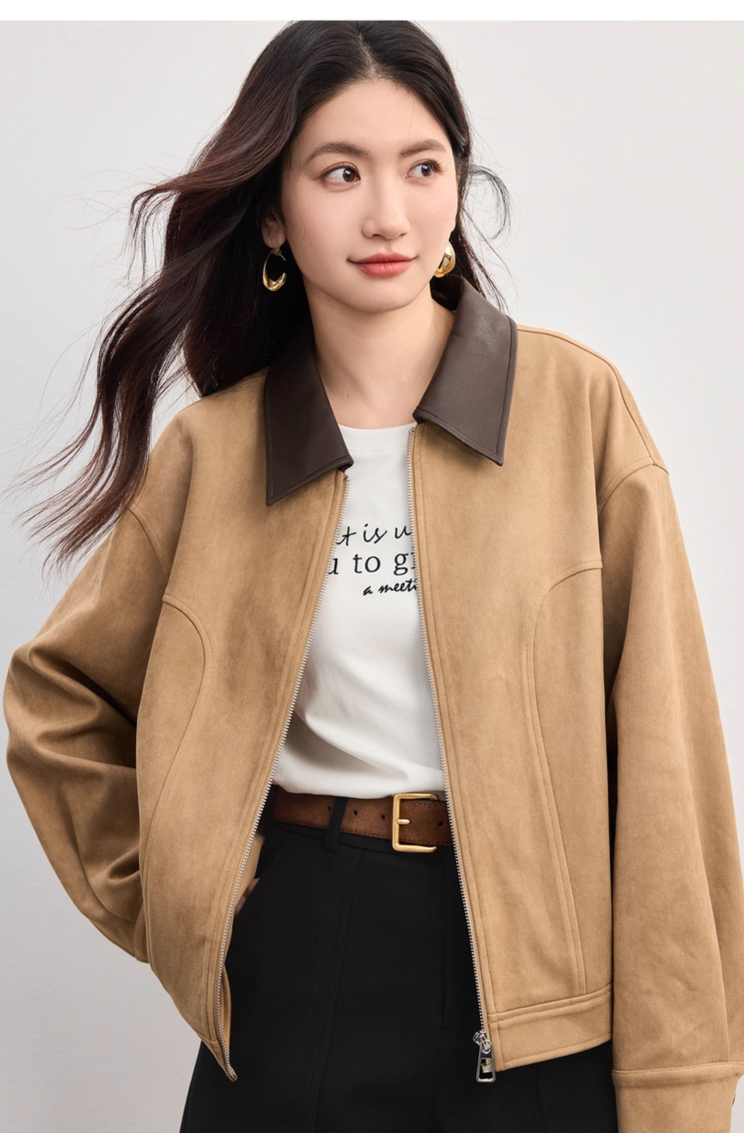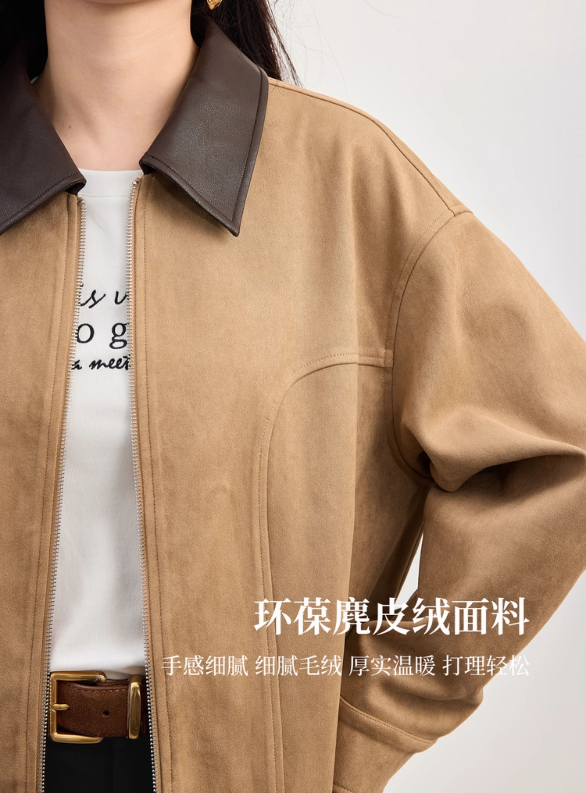 【年货节】熙世界环葆麂皮绒女士短外套秋季休闲复古撞色翻领夹克巴恩风上衣