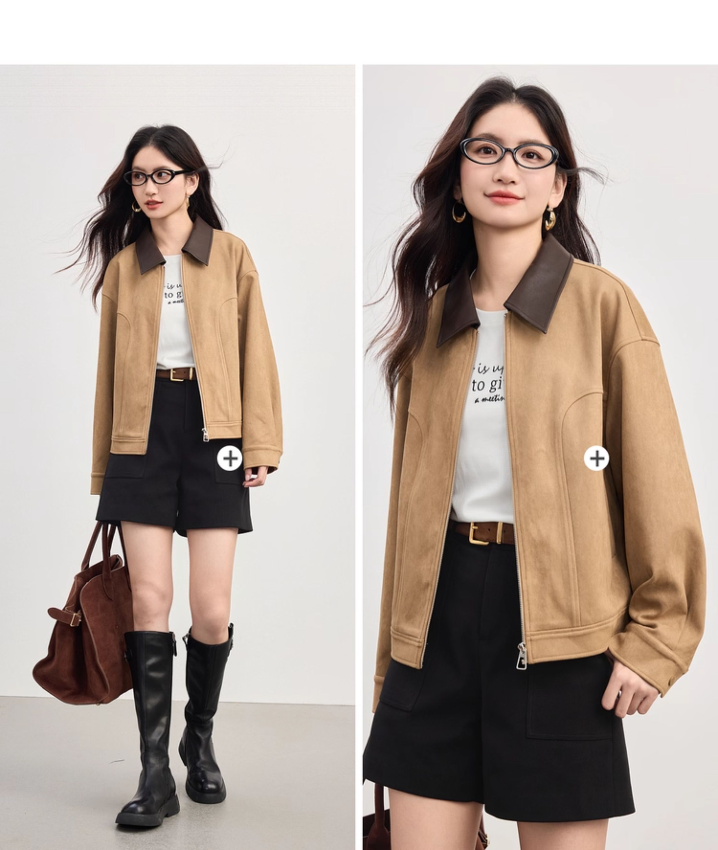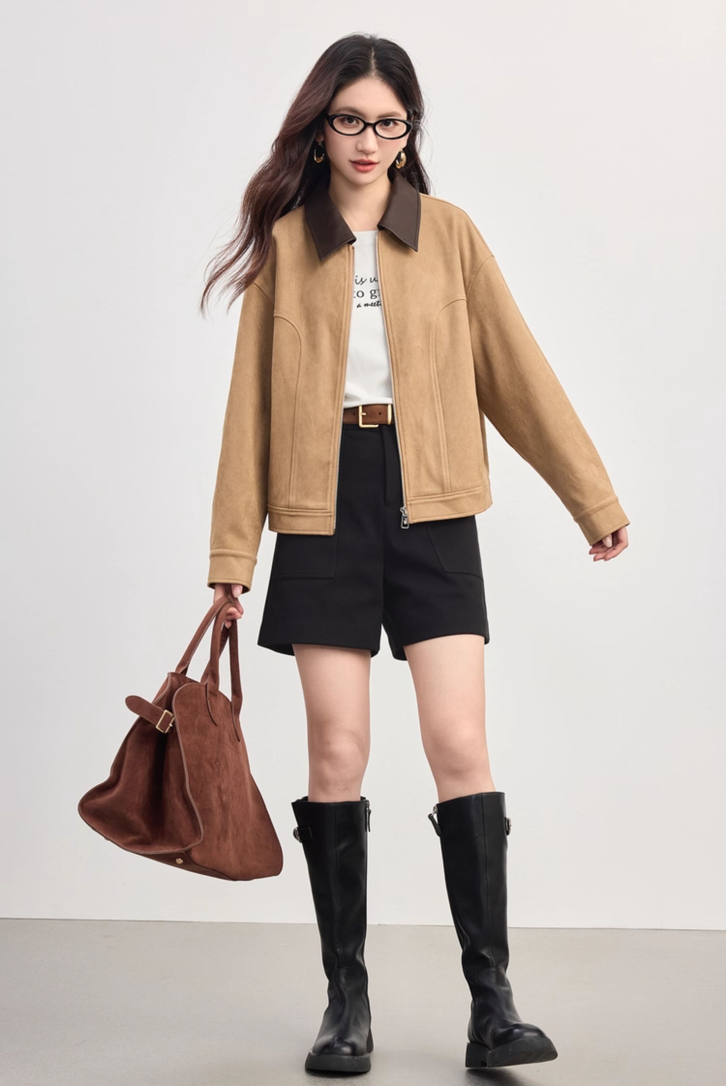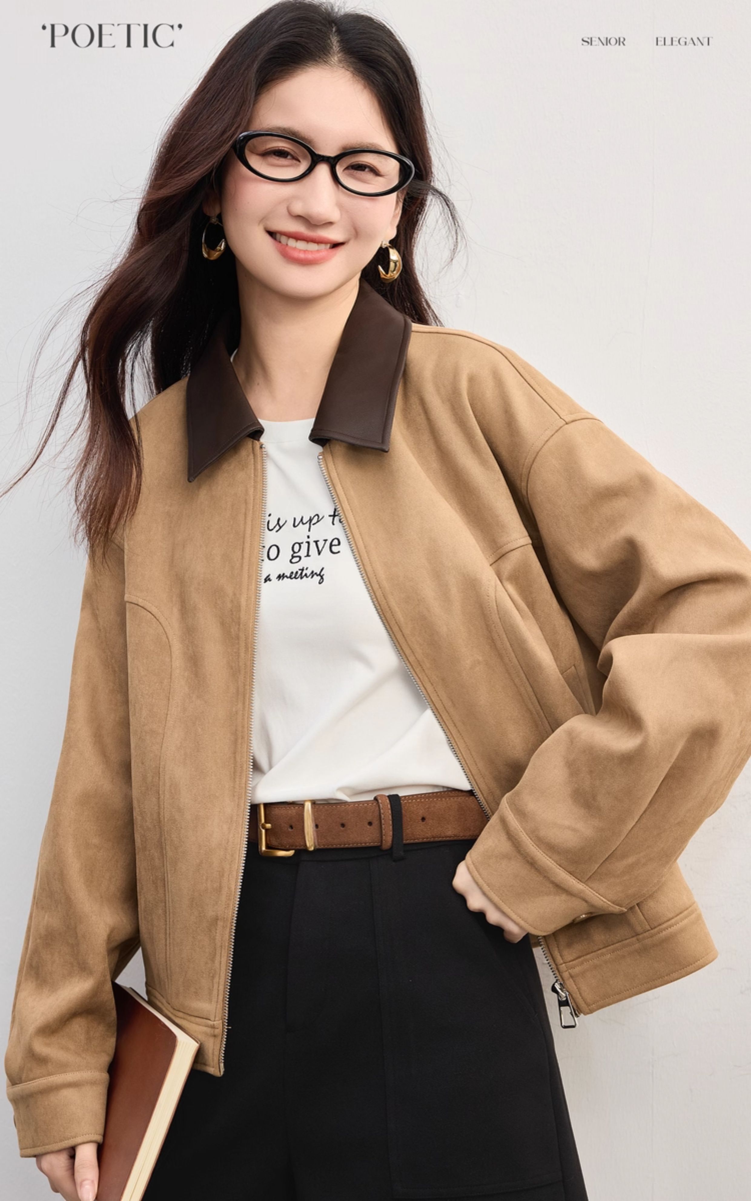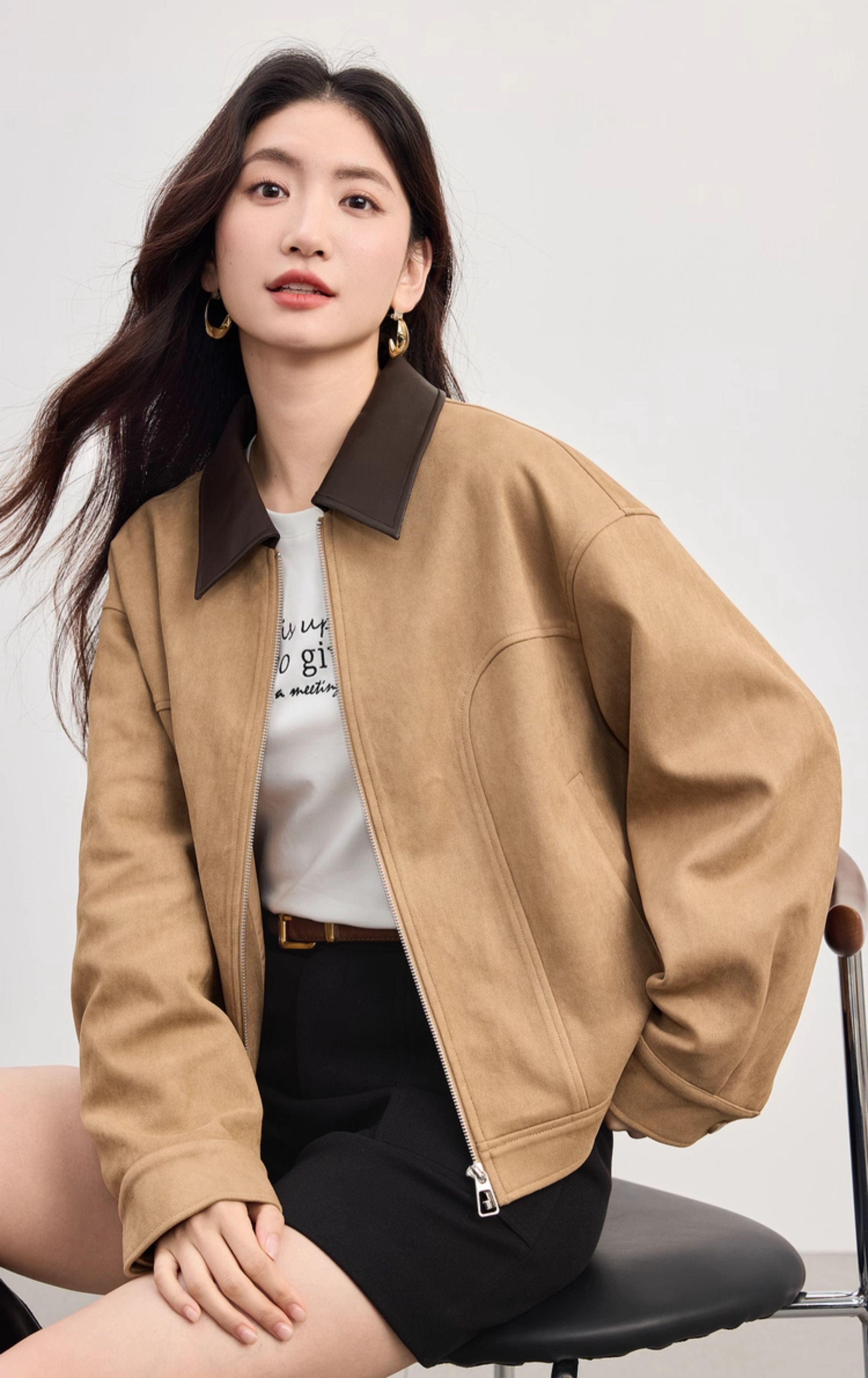 【年货节】熙世界环葆麂皮绒女士短外套秋季休闲复古撞色翻领夹克巴恩风上衣