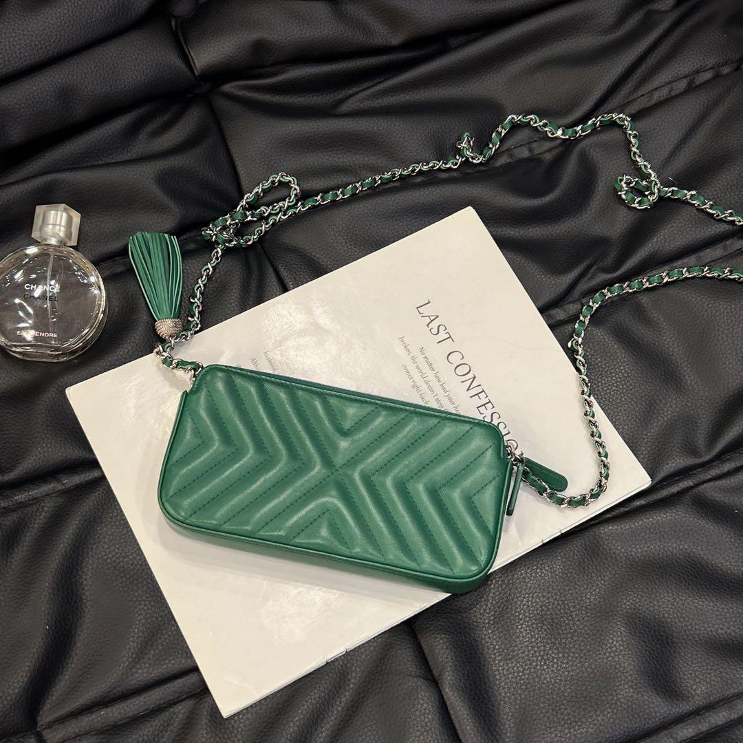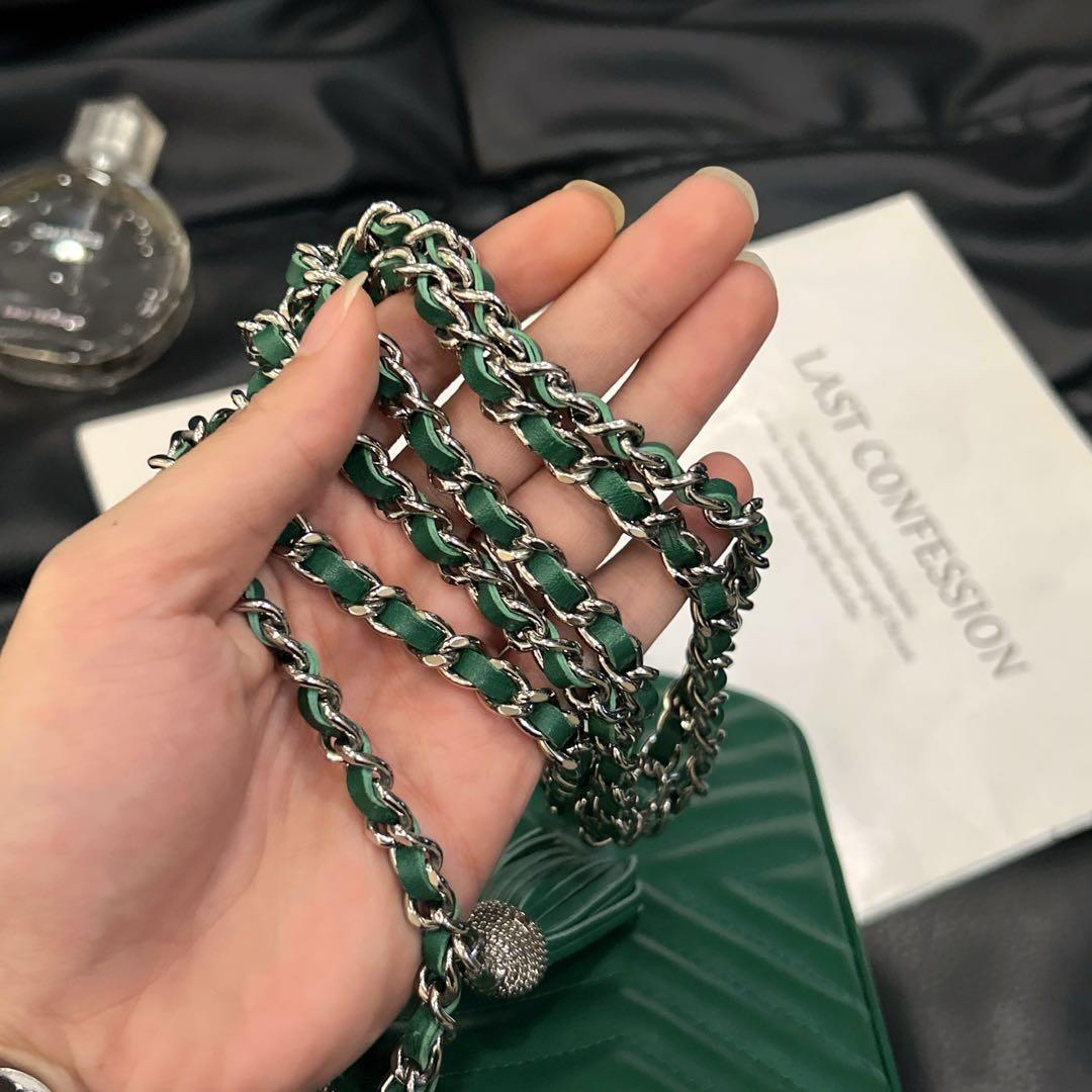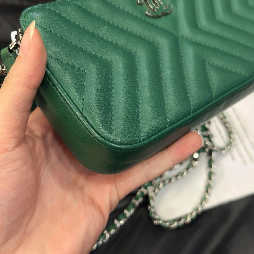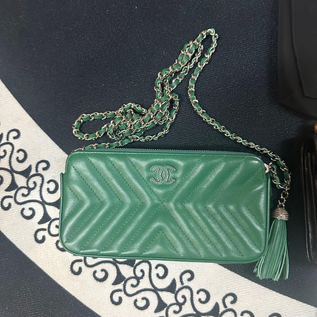【商品详情】正品二手 Chanel 绿色 v纹 牛皮 woc 流苏 相机包🧃97新 19*9 25开 配件:链条。包身有一处轻微摩擦感 内包口处有轻微使用痕迹。放的进手机精品小包