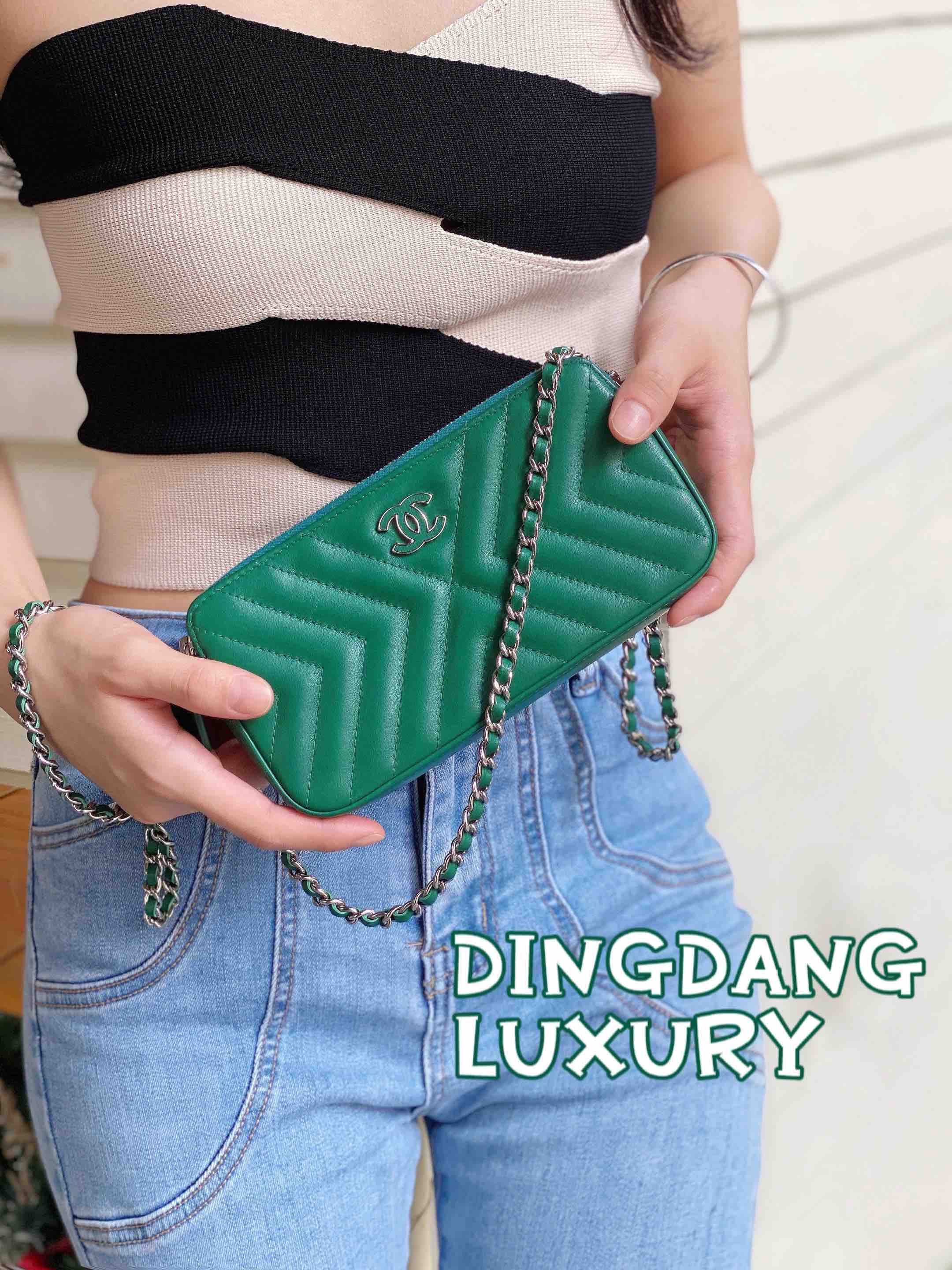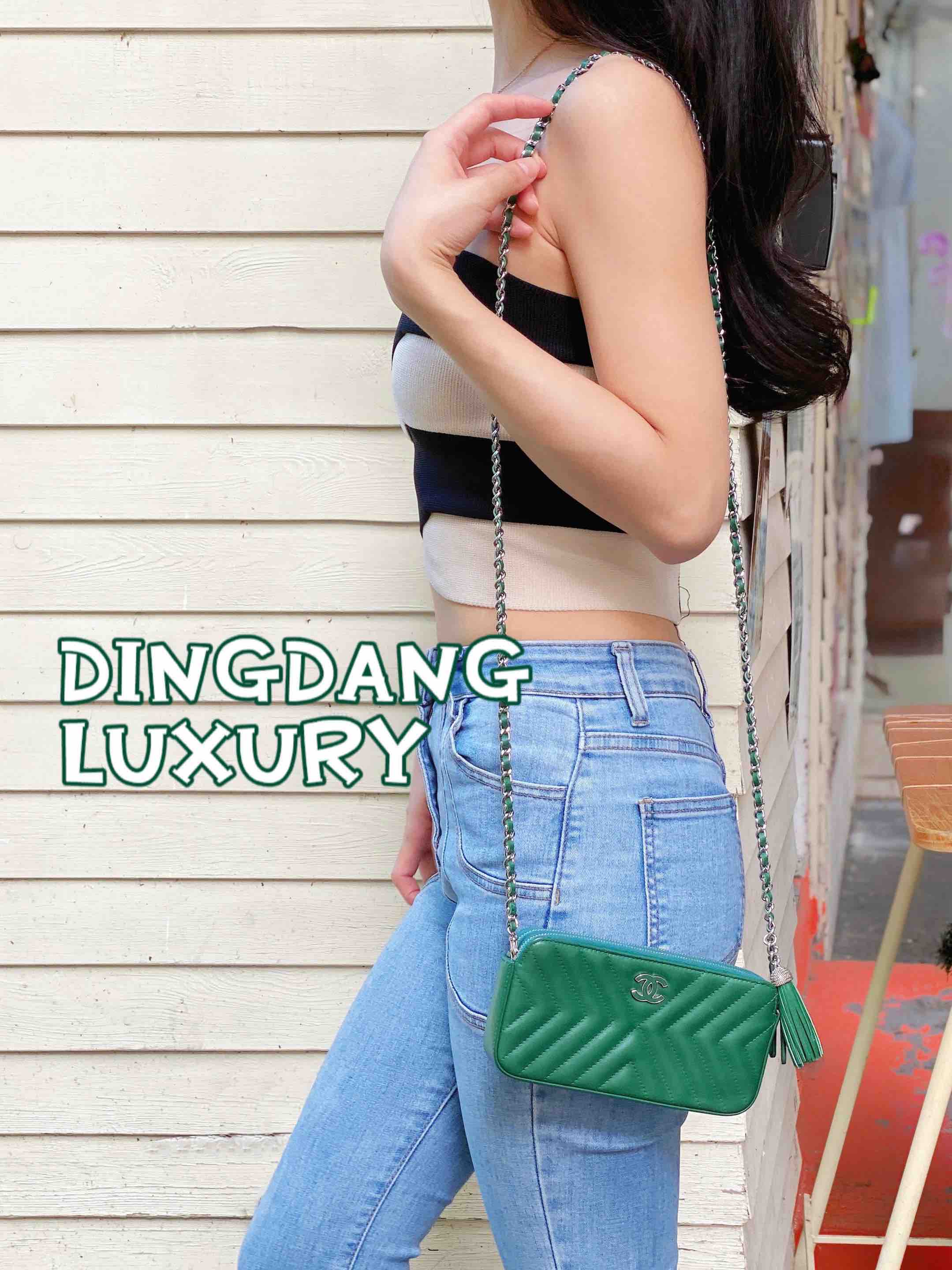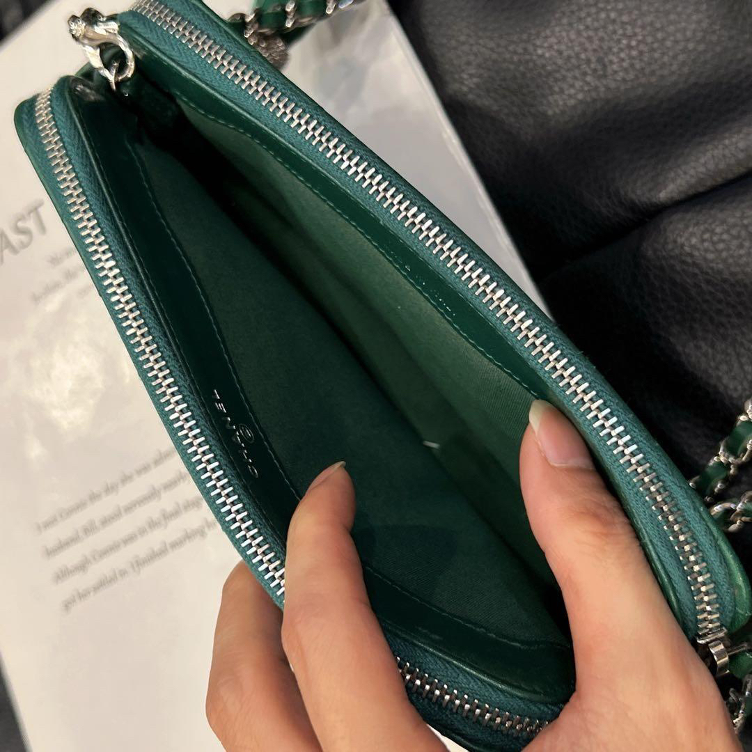 【商品详情】正品二手 Chanel 绿色 v纹 牛皮 woc 流苏 相机包🧃97新 19*9 25开 配件:链条。包身有一处轻微摩擦感 内包口处有轻微使用痕迹。放的进手机精品小包