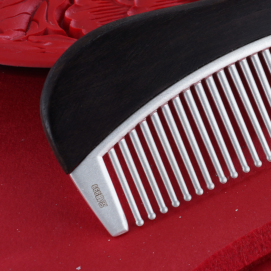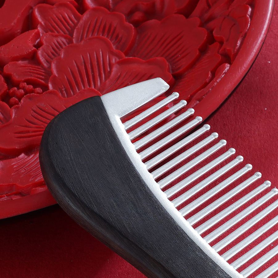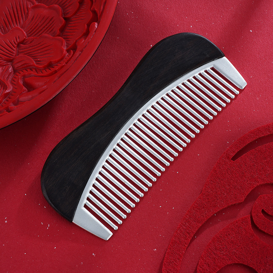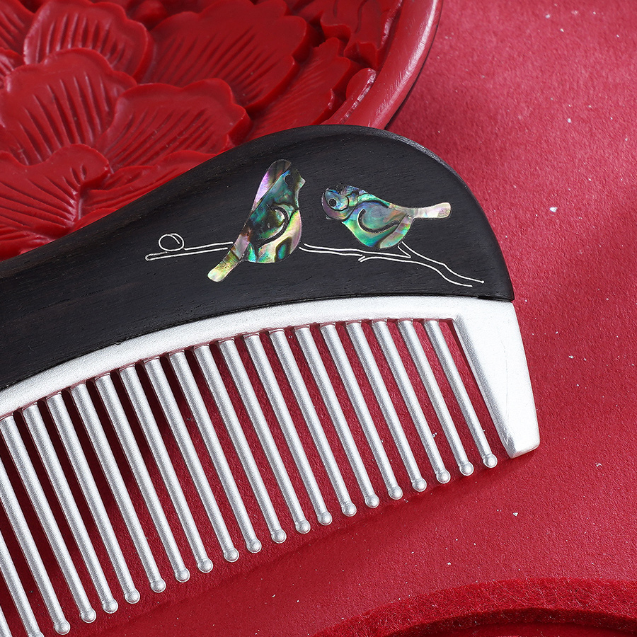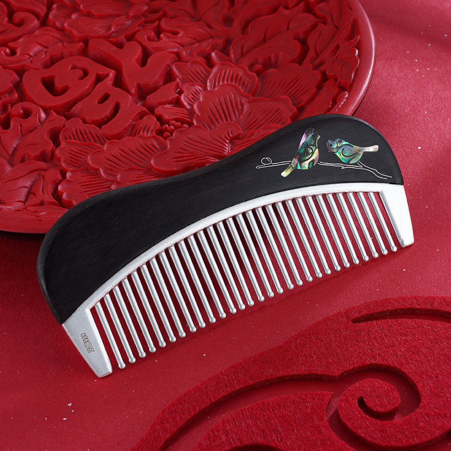 【寓意】:银梳以檀木为载体,镌刻双鸟图案。取名“比翼相思”,寓意比翼缠绕,思念绵长,夫妻恩爱。