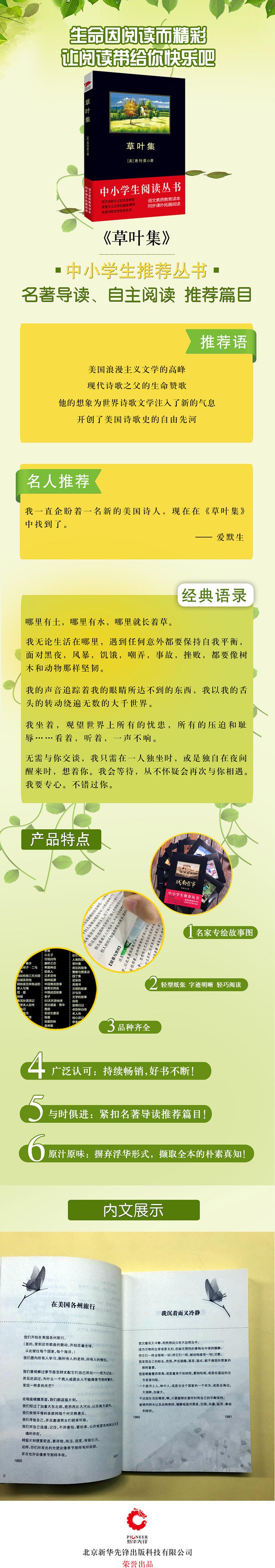 惠特曼编著的《丛书:草叶集》是十九世纪美国作家惠特曼的浪漫主义诗集,共收有诗歌三百余首。诗集得名于集中这样的一句诗:“哪里有土,哪里有水,哪里就长着草。”诗集中的诗歌便像是长满美国大地的芳草,生气蓬勃并散发着诱人的芳香。它们是世界闻名的佳作,开创了美国民族诗歌的新时代。作者在诗歌形式上有大胆的创新,创造了“自由体”的诗歌形式,打破了传统的诗歌格律。