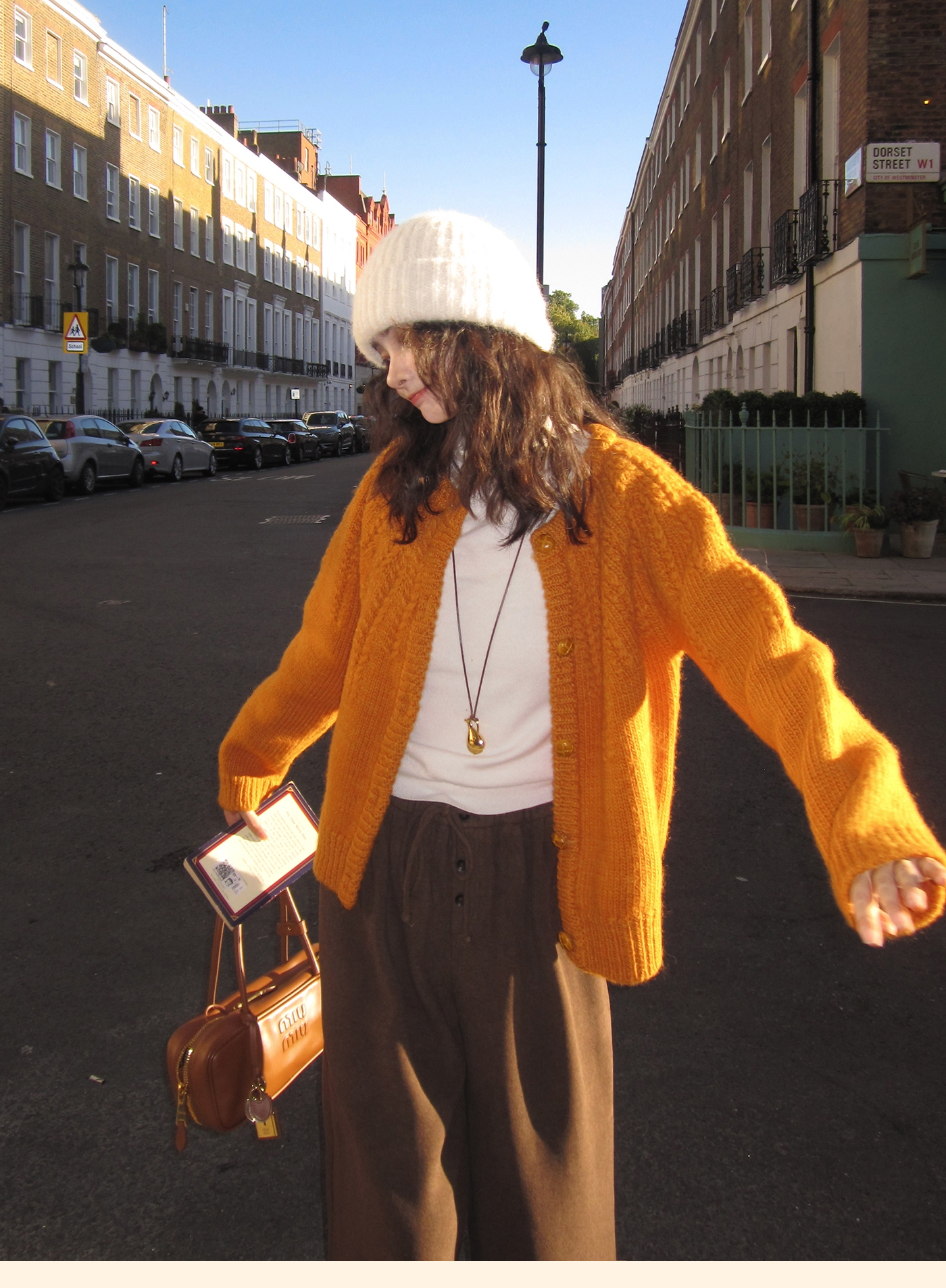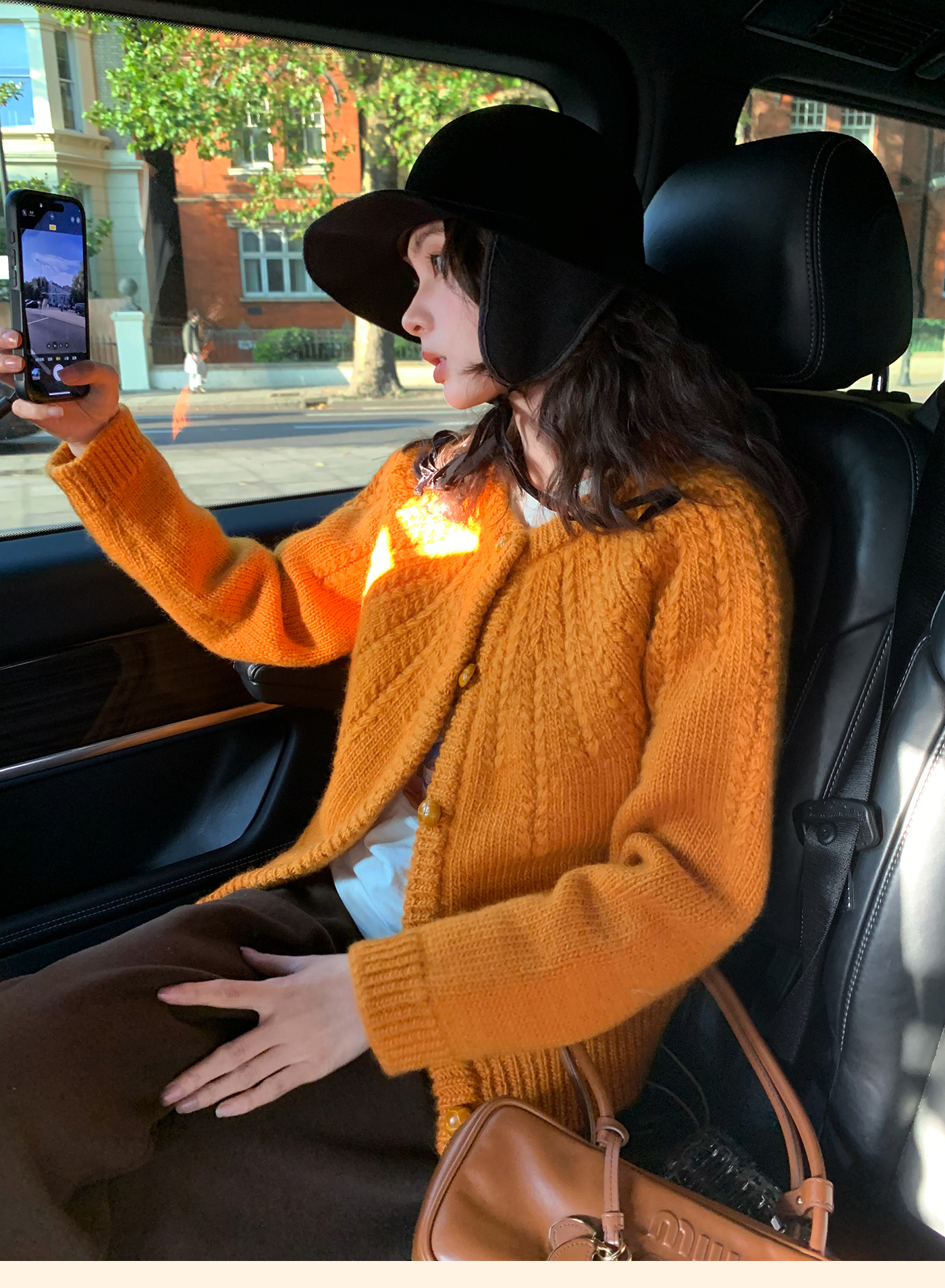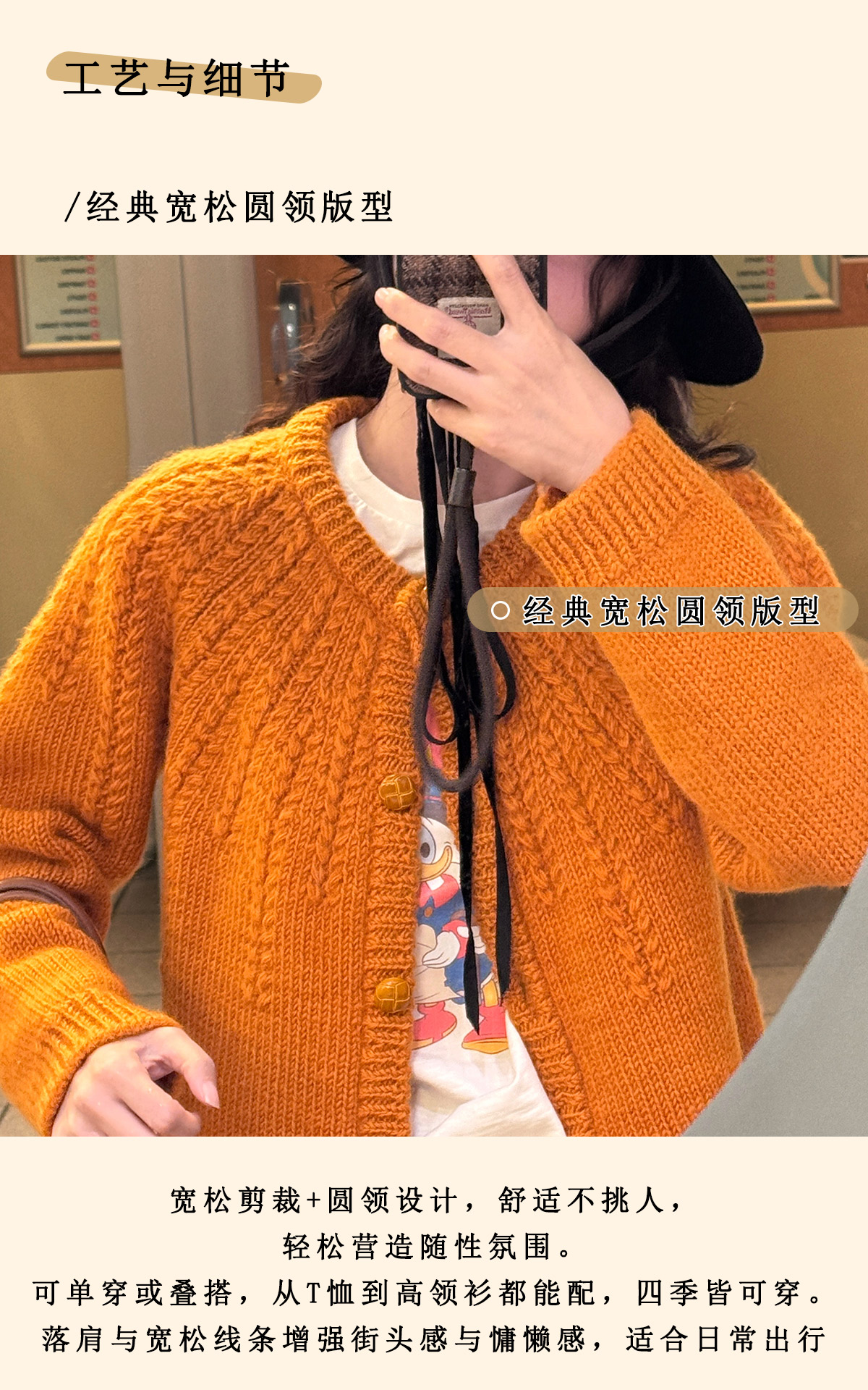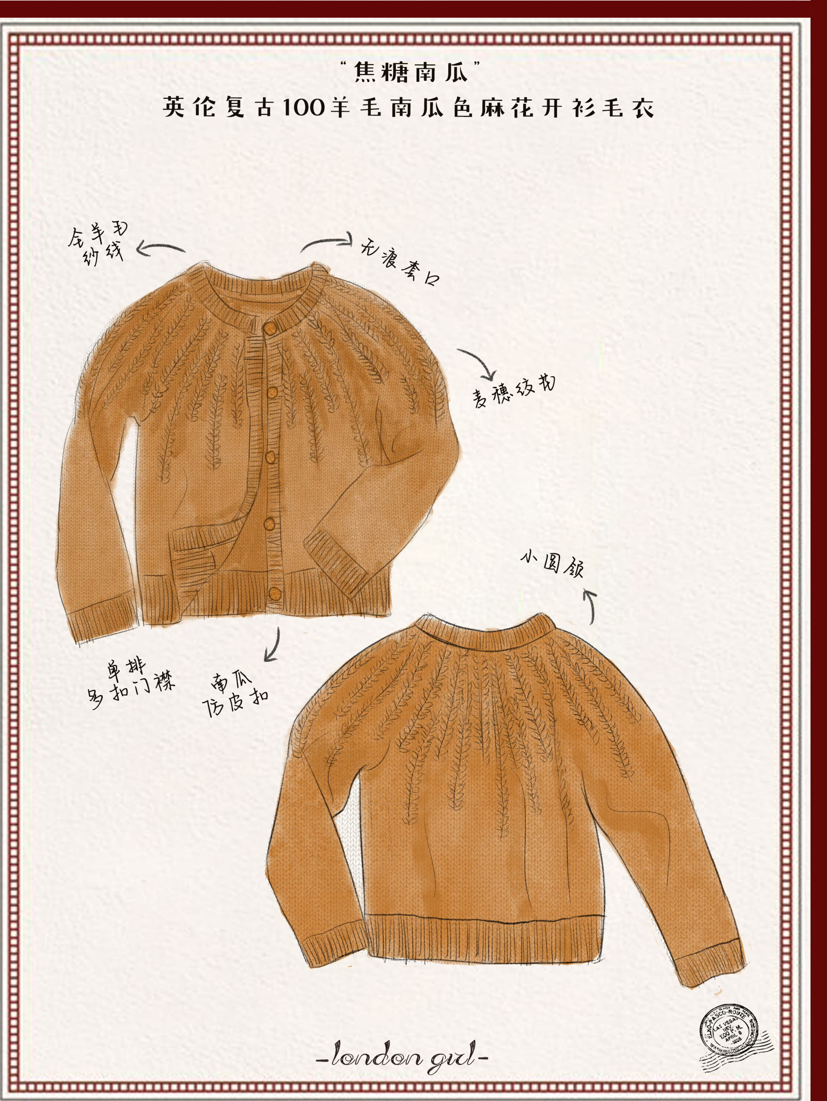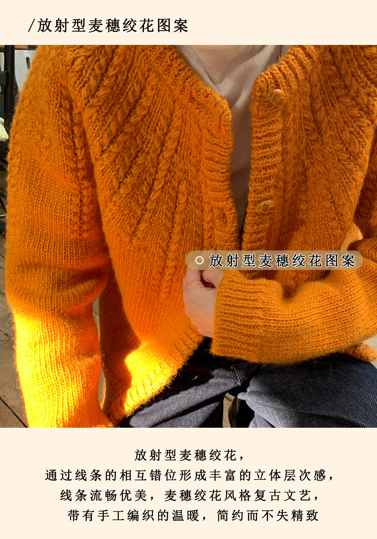 浮生八记/25C198/1OO羊毛南瓜色麻花开衫毛衣