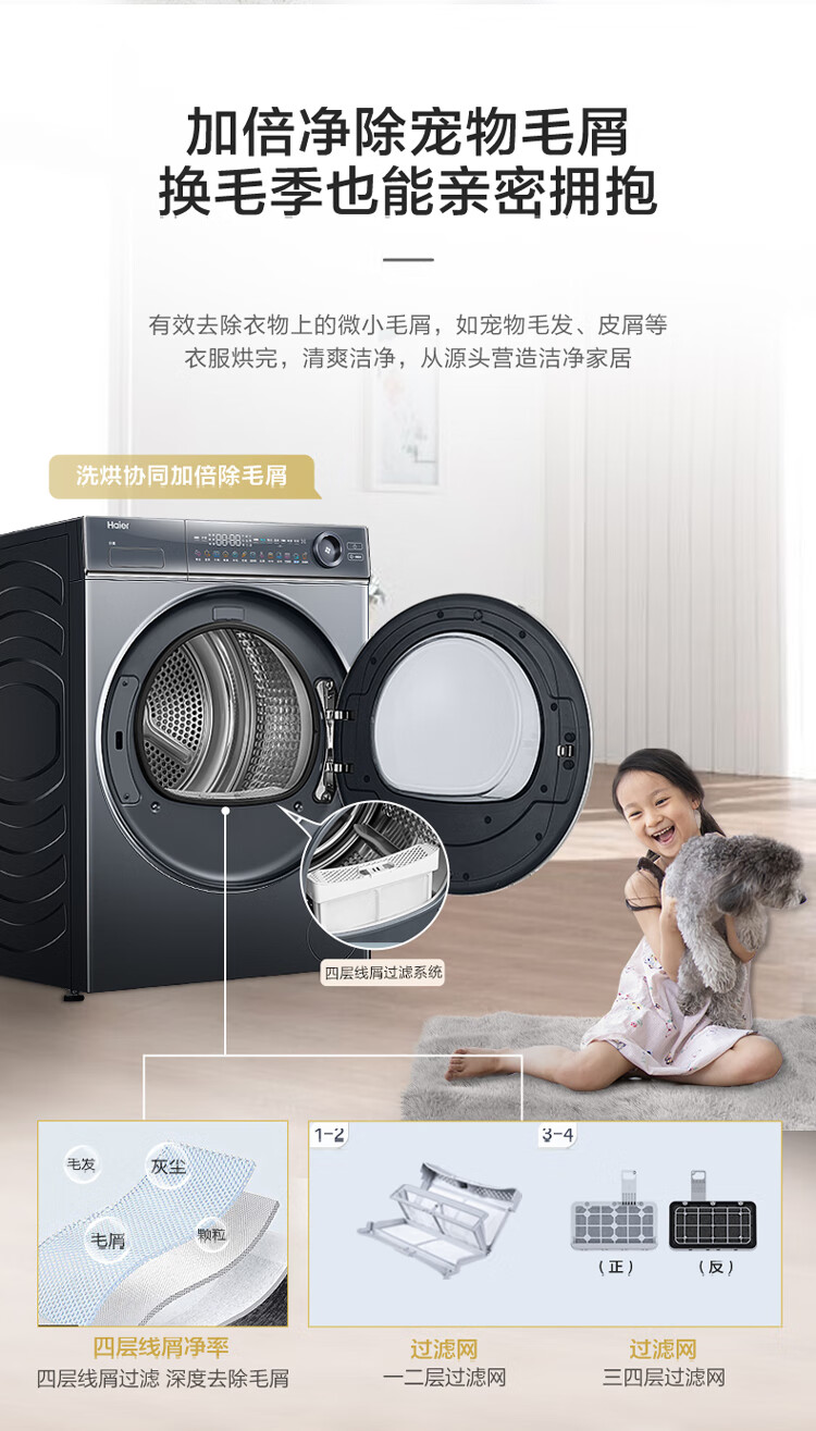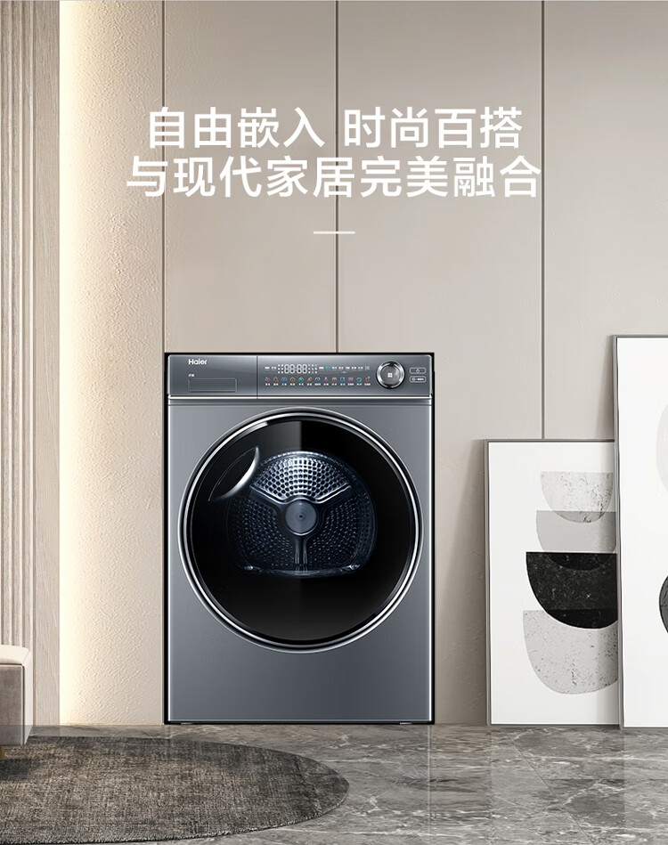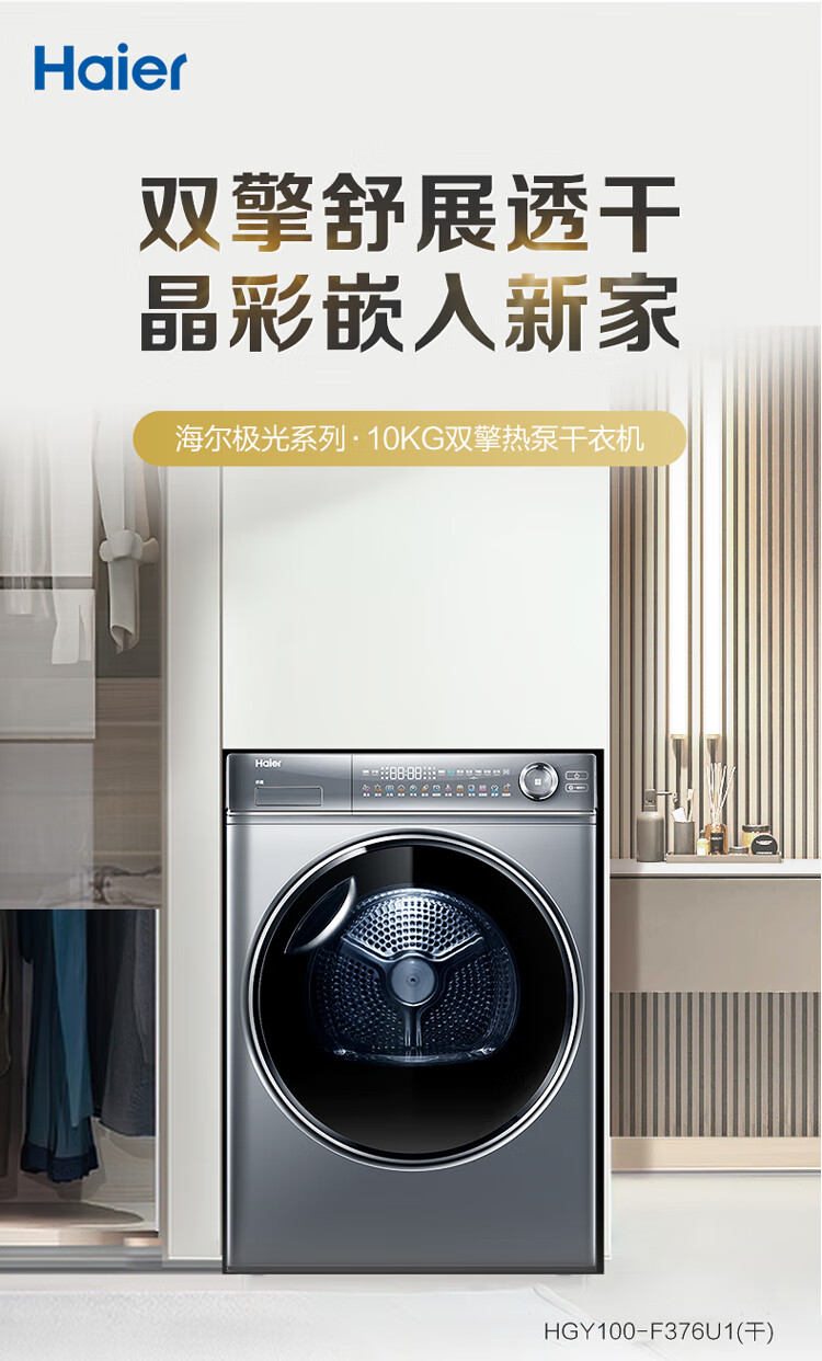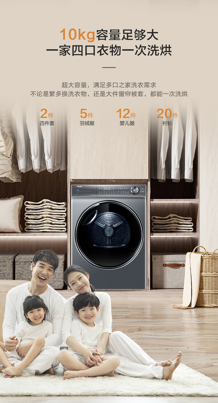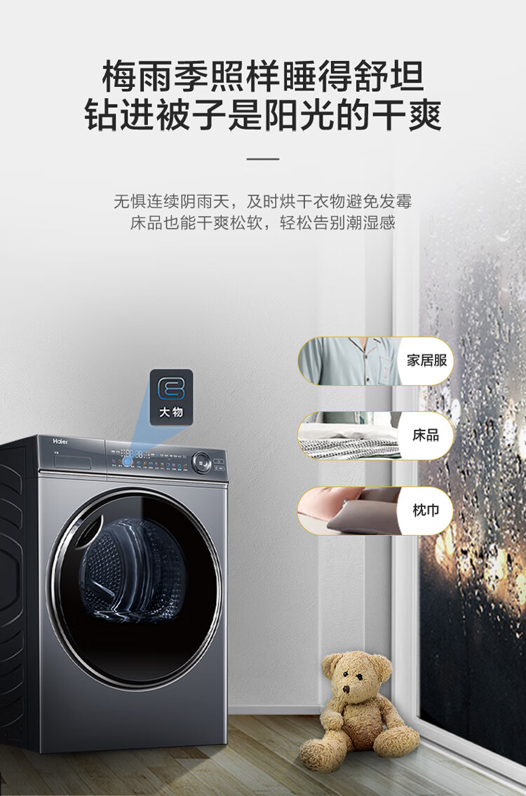 海尔(Haier)烘干机纤美平嵌双擎热泵式超声波雾化空气洗10公斤大容量滚筒家用衣物干衣机 HGY100-F376U1