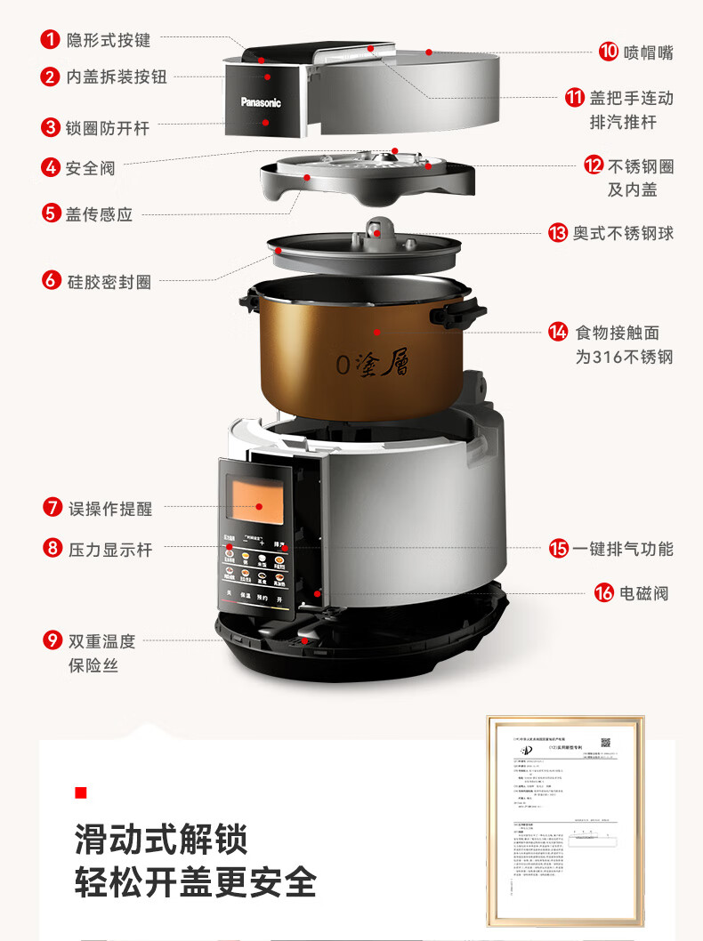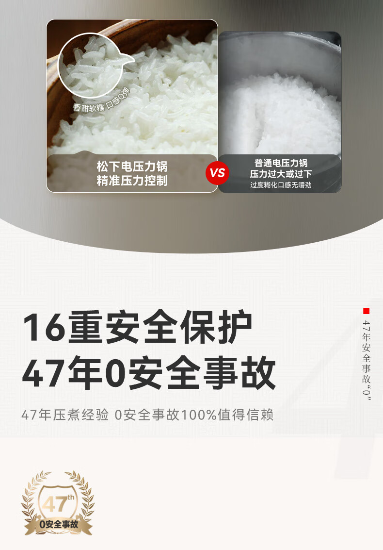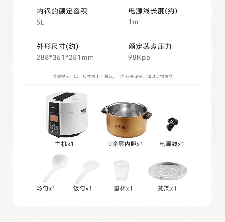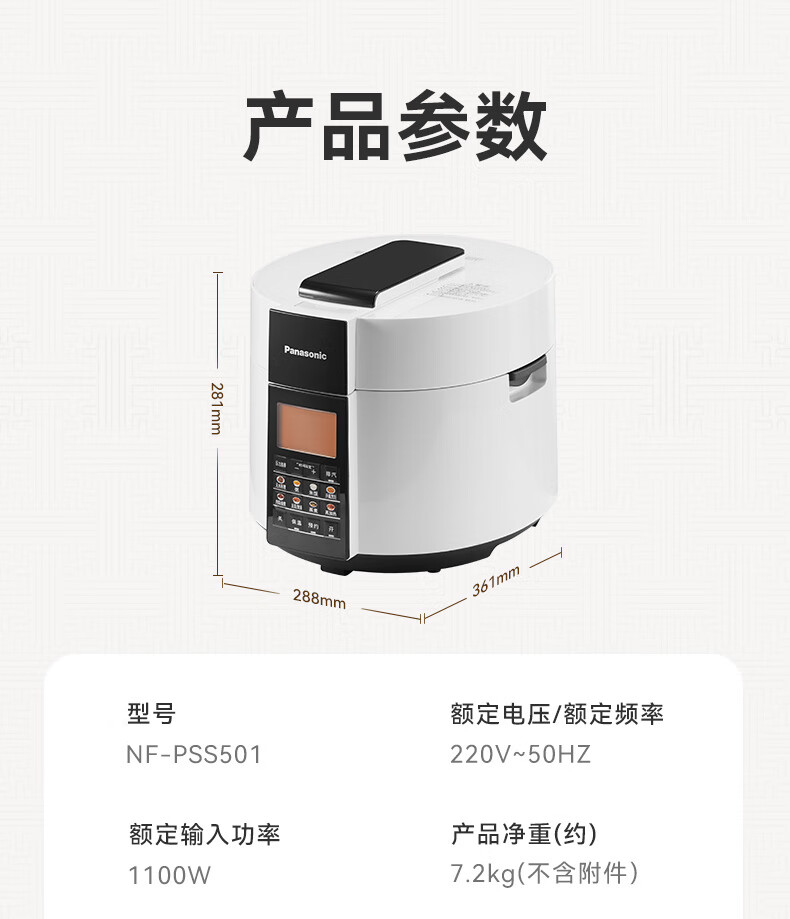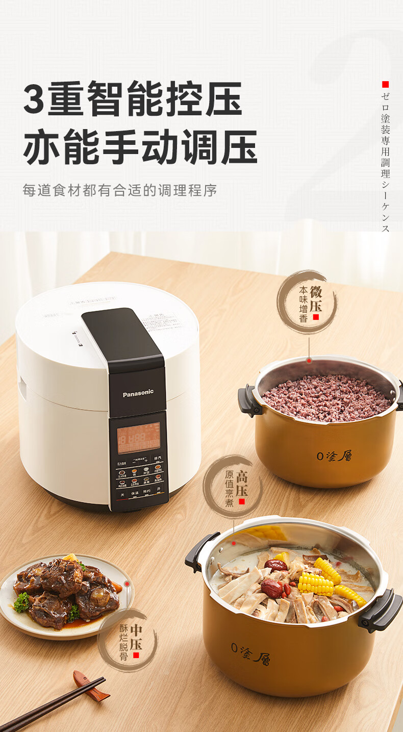 松下(Panasonic)电压力锅0涂层316不锈钢内胆高压锅5L家用智能电饭煲2.0倍高压煲汤煮饭 PSS501