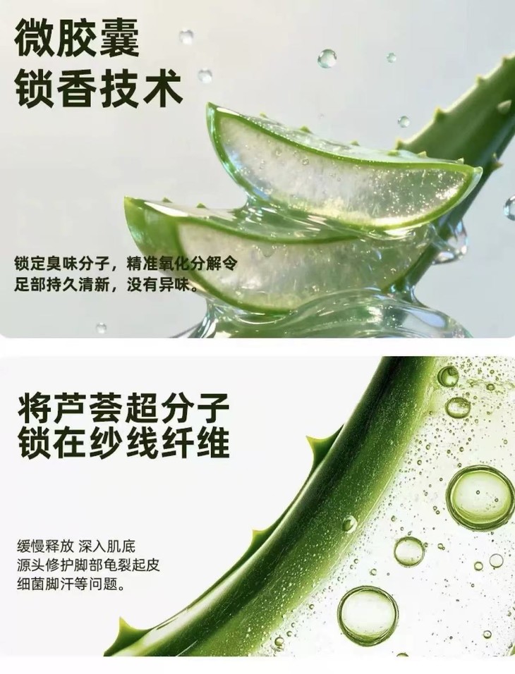 ✅天然芦荟精油 蕴含天然的芦荟苷等活性成分 拥有出色的亲肤性与保湿度 温柔贴合足部轮廓,持续滋润足底皮肤 缓解因干燥和摩擦带来的不适 ✅足部护理 尤其呵护脚跟、脚趾等易磨损部位 带给您近乎裸感的柔软包裹 极致柔滑,颠覆传统袜子的穿着体验 ✅微囊缓释 微胶囊技术锁住分子活性 穿着行走间缓慢释放精油分子 带来从清晨到夜晚的长效护理