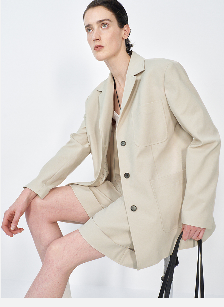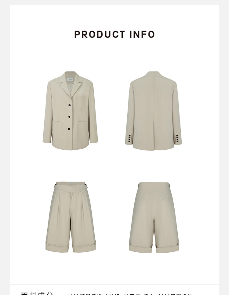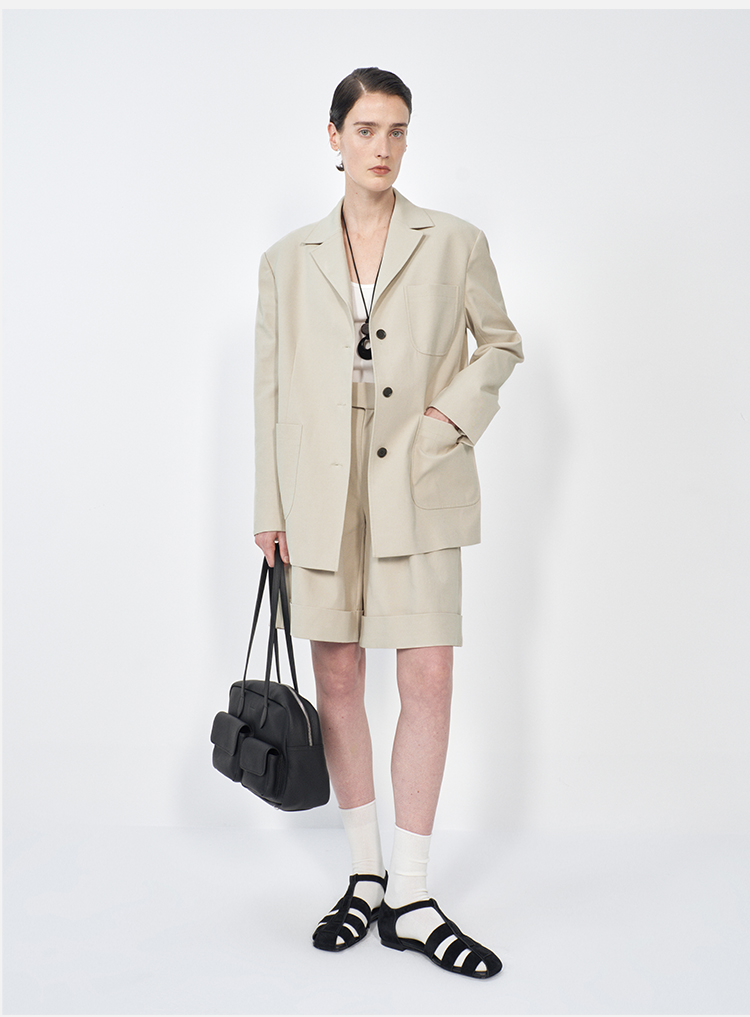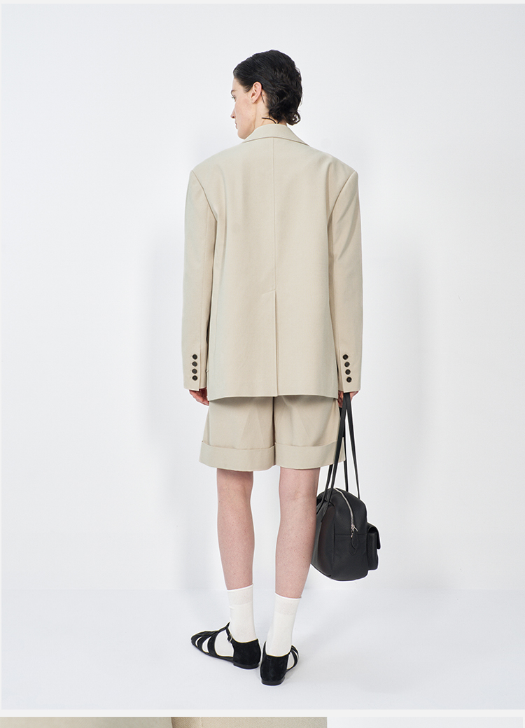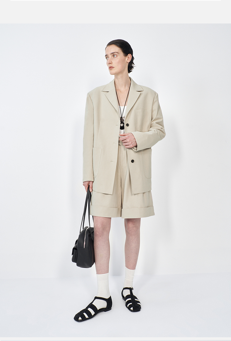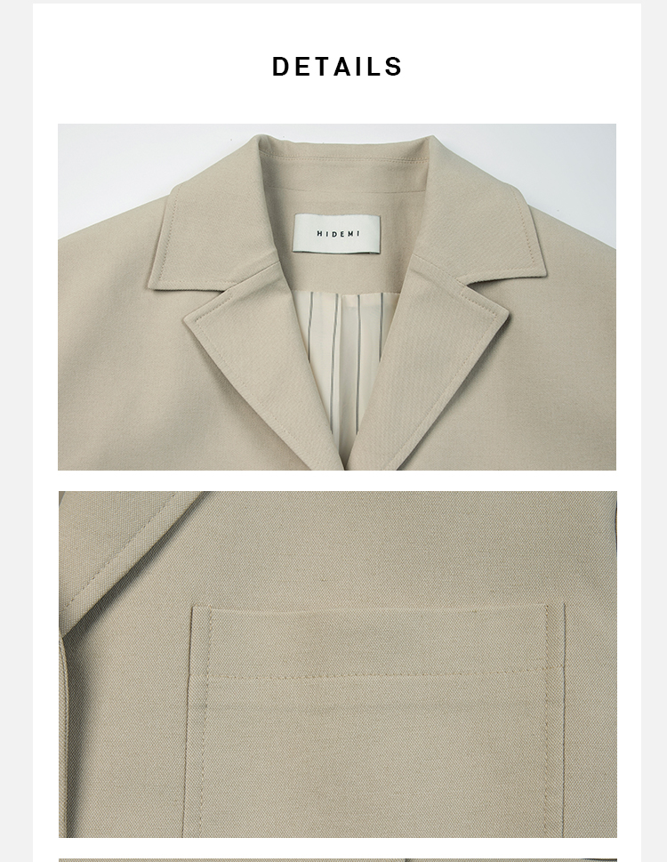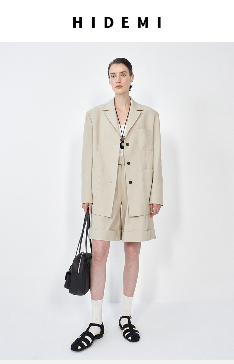 HIDEMI 米色轻盈亚麻设计感翻领贴袋大廓形西装中裤套装