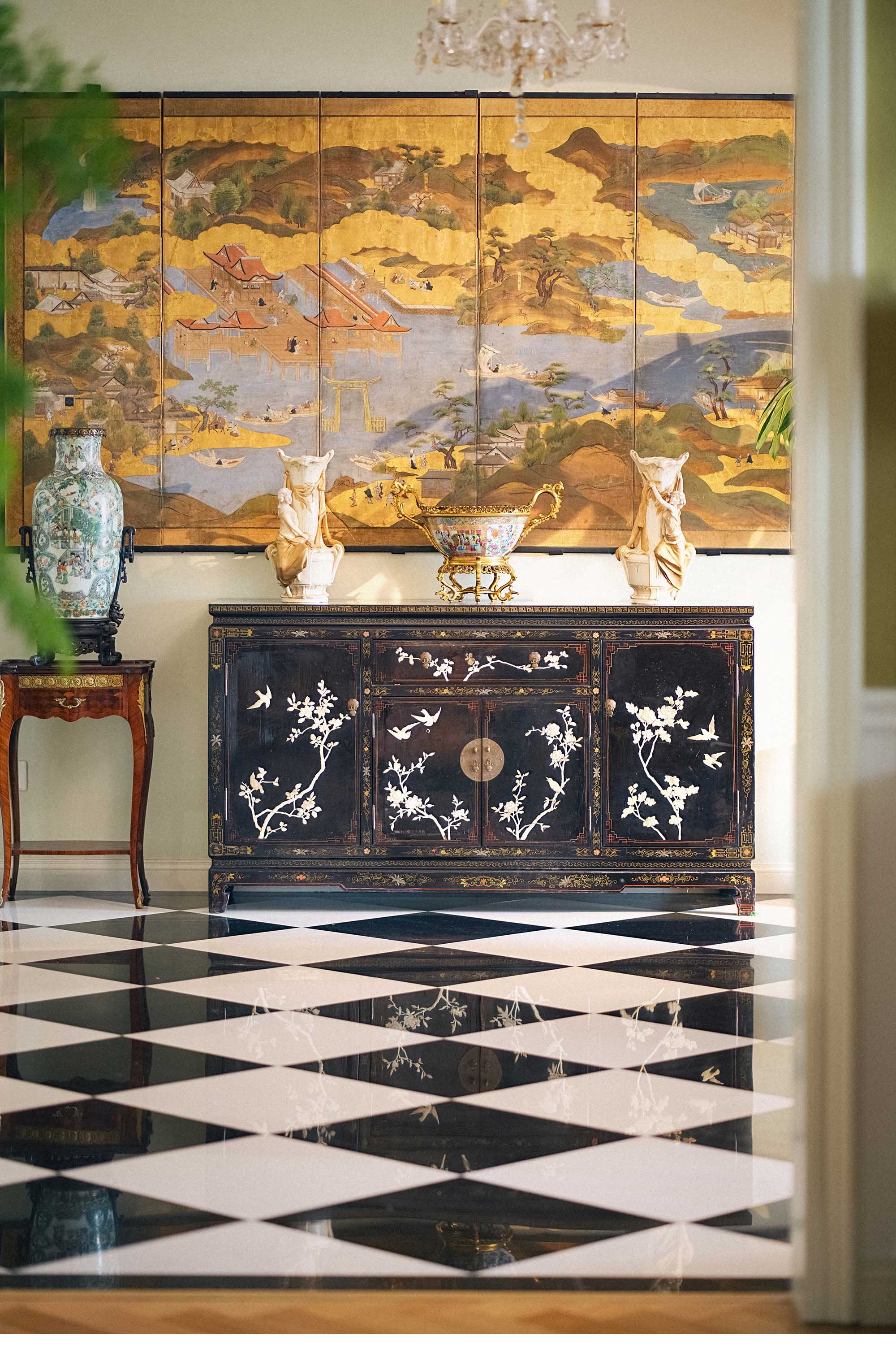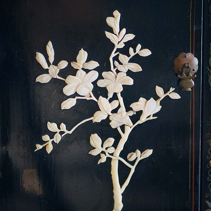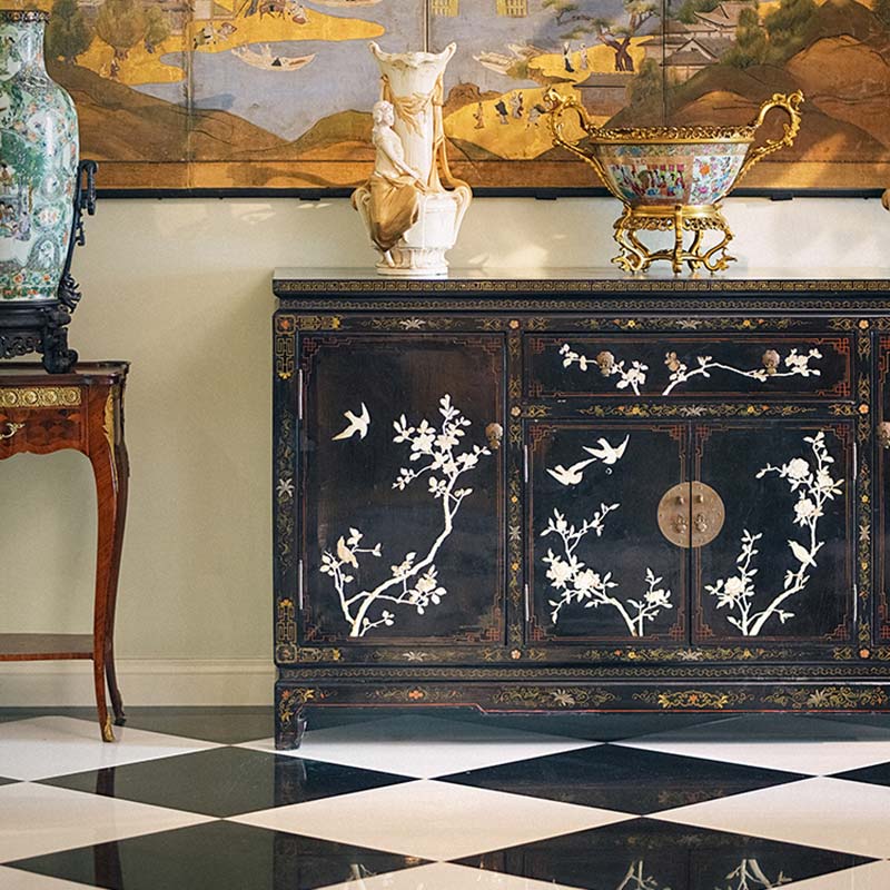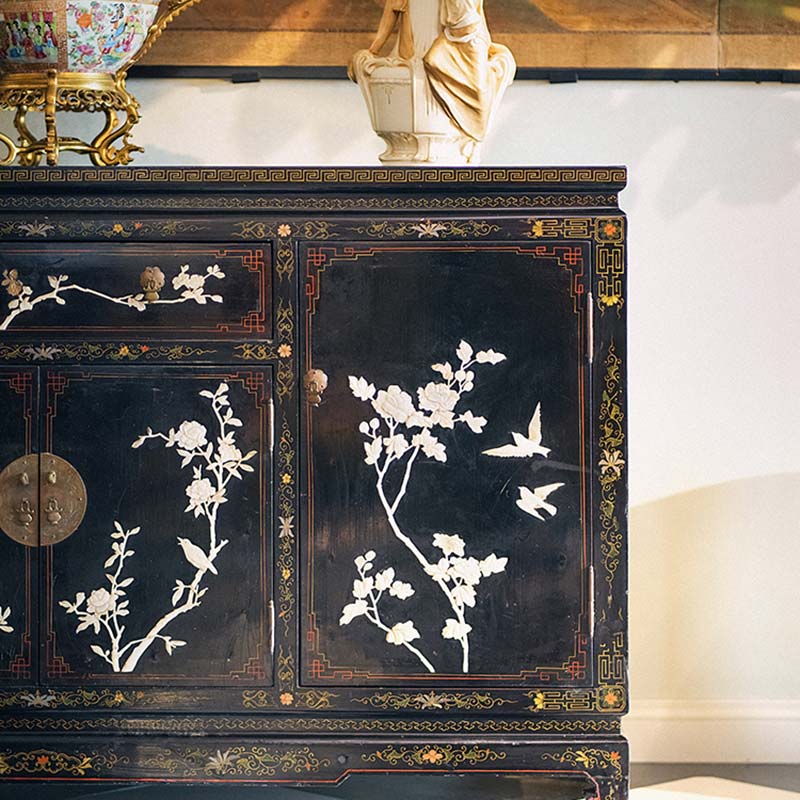 20世纪中国创汇时期出品「玉堂富贵」主题黑漆描金百宝嵌角柜