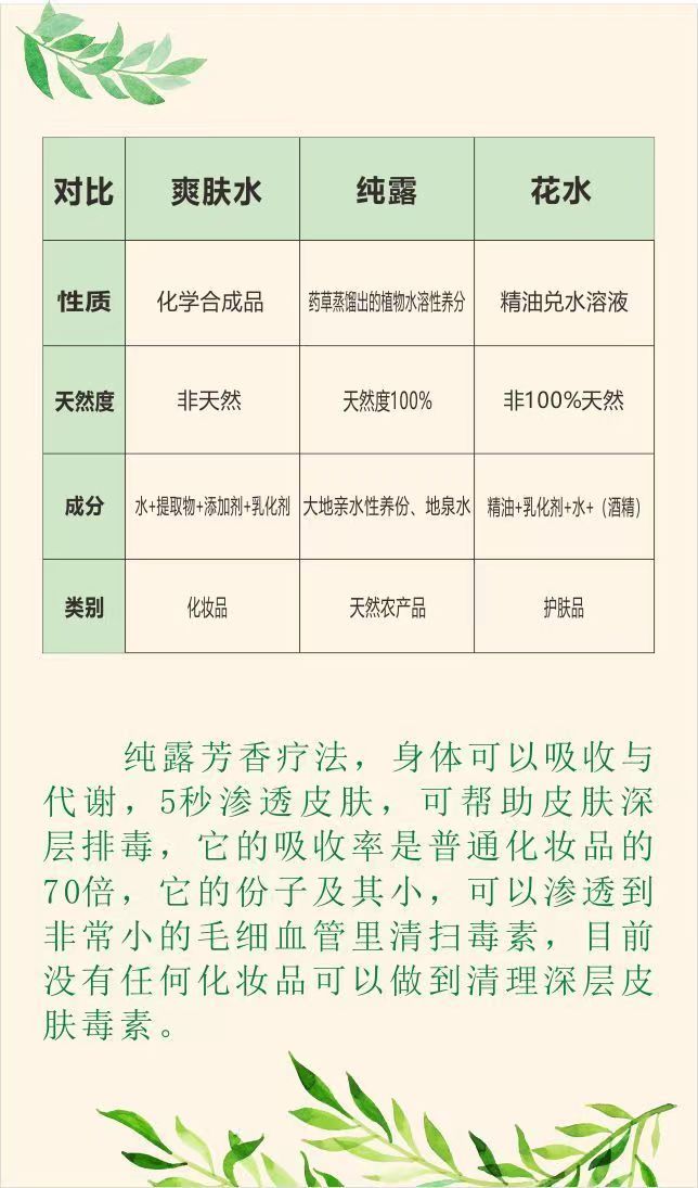 所有的纯露都可以净化、排毒、消炎,不同植物的纯露侧重点不同。因为品种众多,为方便大家选购合适这个季节用做个简洁介绍,最美妙的还是来体验,去感受!