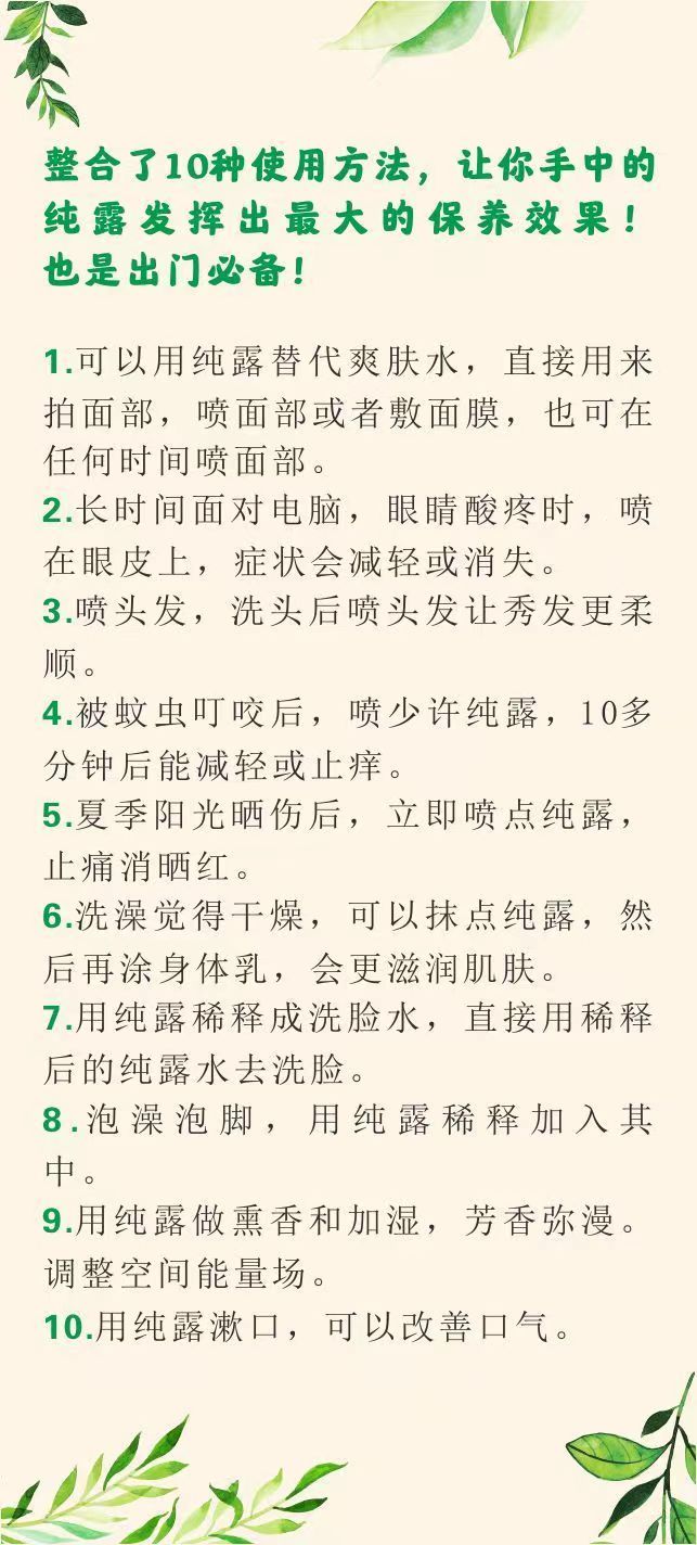 纯露只是用来当爽肤水拍拍脸,喷喷脸的仙女们,觉得效果无功无过,尤其是觉得皮肤很干,湿敷它,每次三分钟或以上,就能让皮肤喝饱水,不要等面膜纸太干哦!水双向挥发!坚持践行,才能体验到纯露的润物细无声!