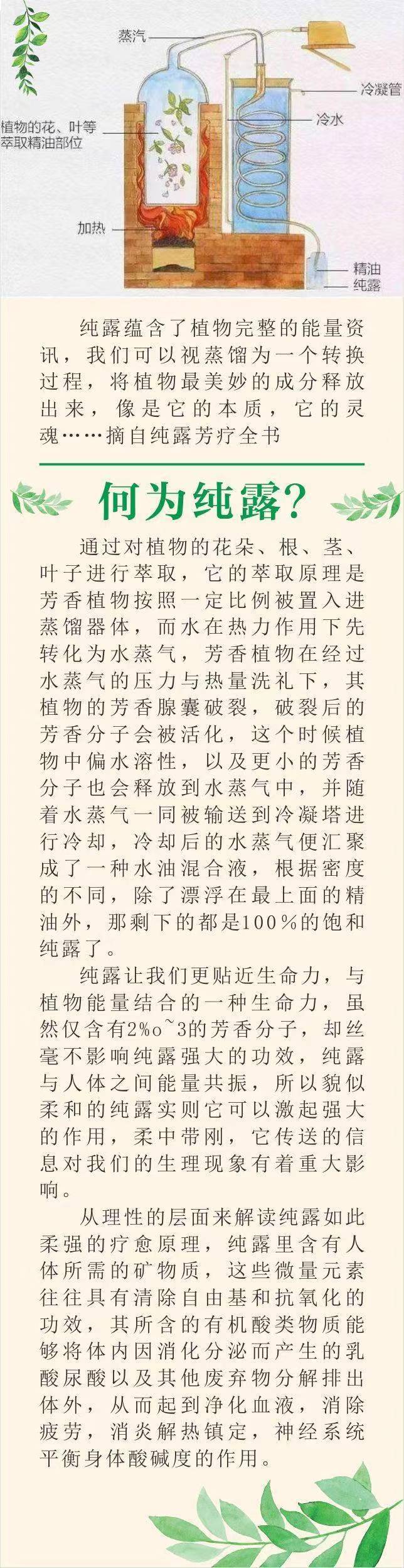 纯露是植物通过蒸馏所得,包含植物中几乎所有水溶性的营养物质,被称做生命疗愈之水。