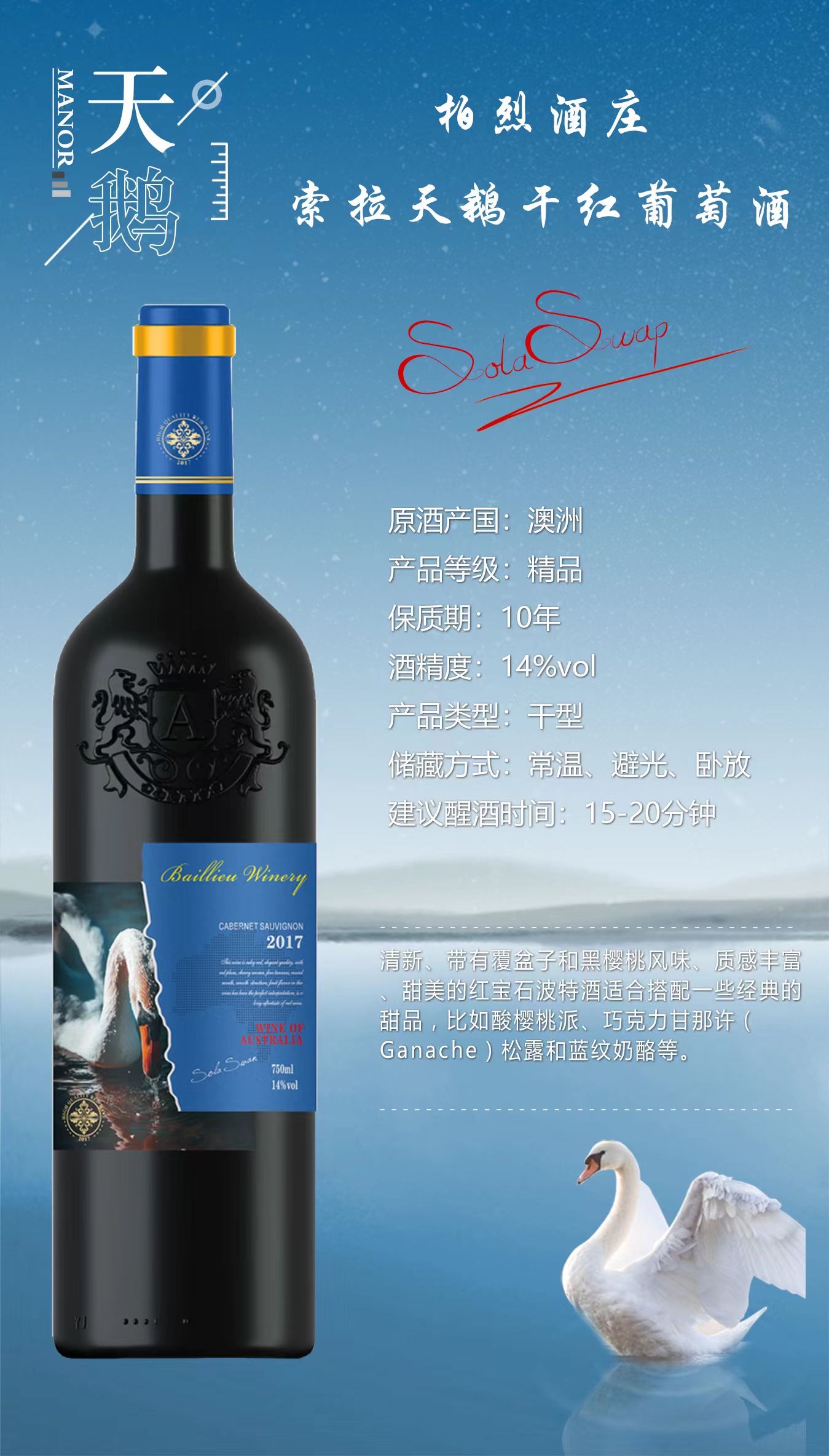 柏烈酒庄 澳洲索拉天鹅干红葡萄酒 酒精度14%【72小时内发货】