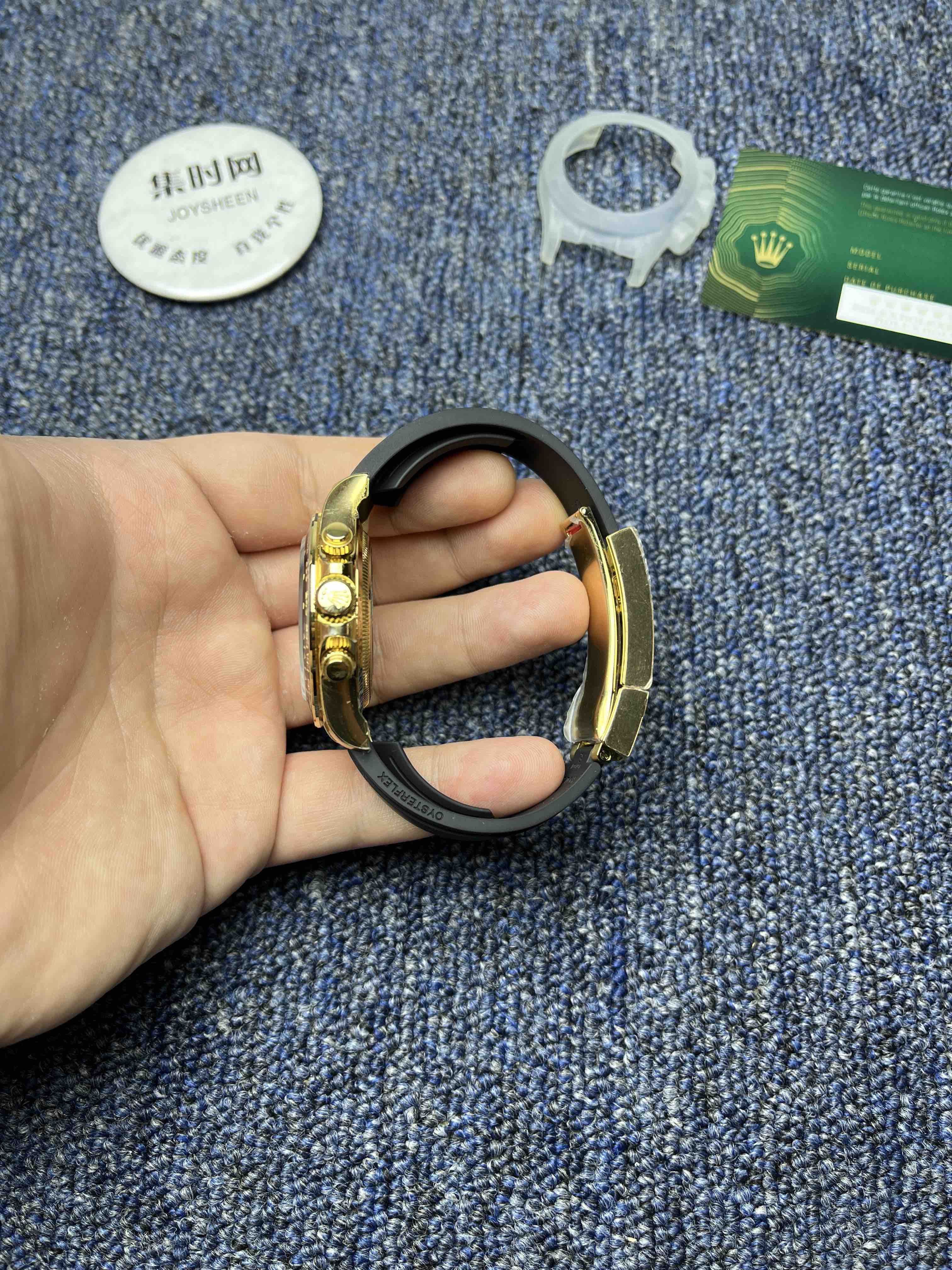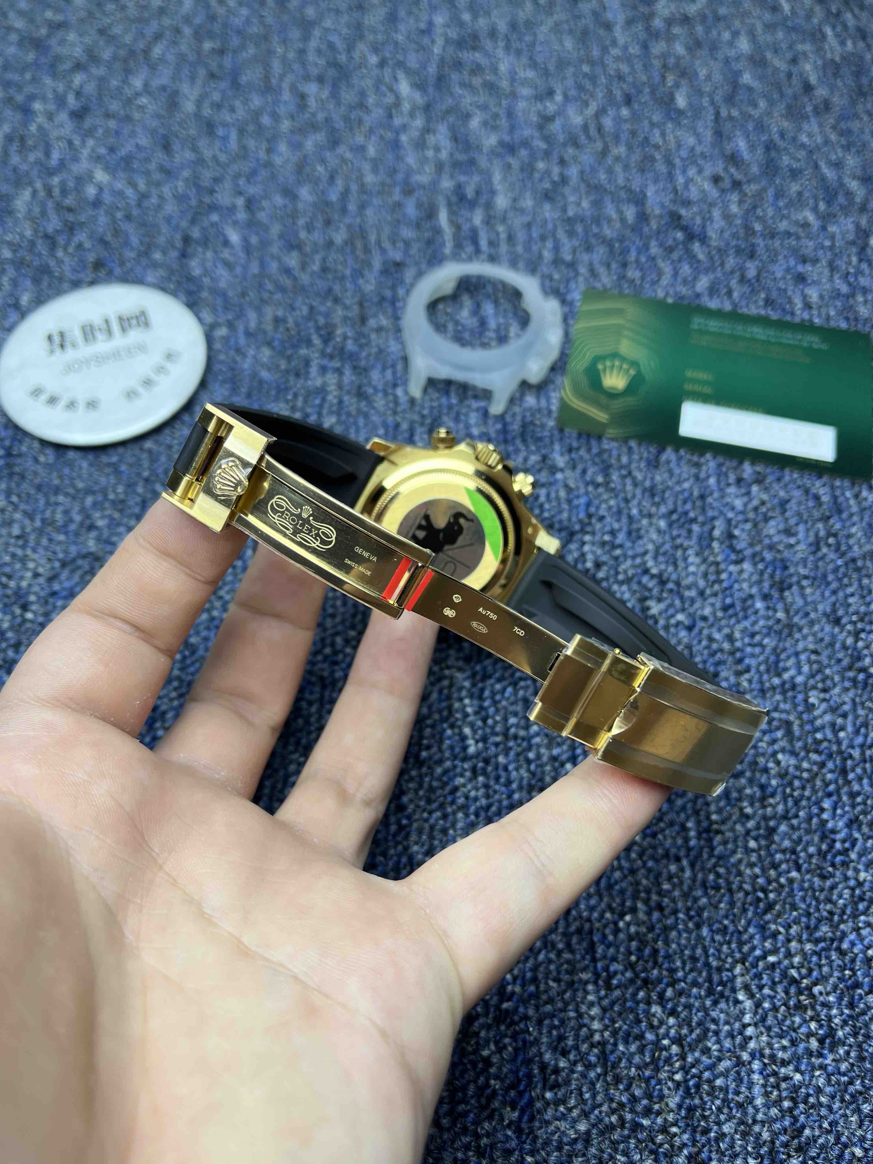 2. 采用天然氟橡胶胶带,胶带内置记忆钢片,生耳孔也加装防断钢通,对标正品的高耐用性与佩戴体验,类似正品游艇名仕系列的材质选择!