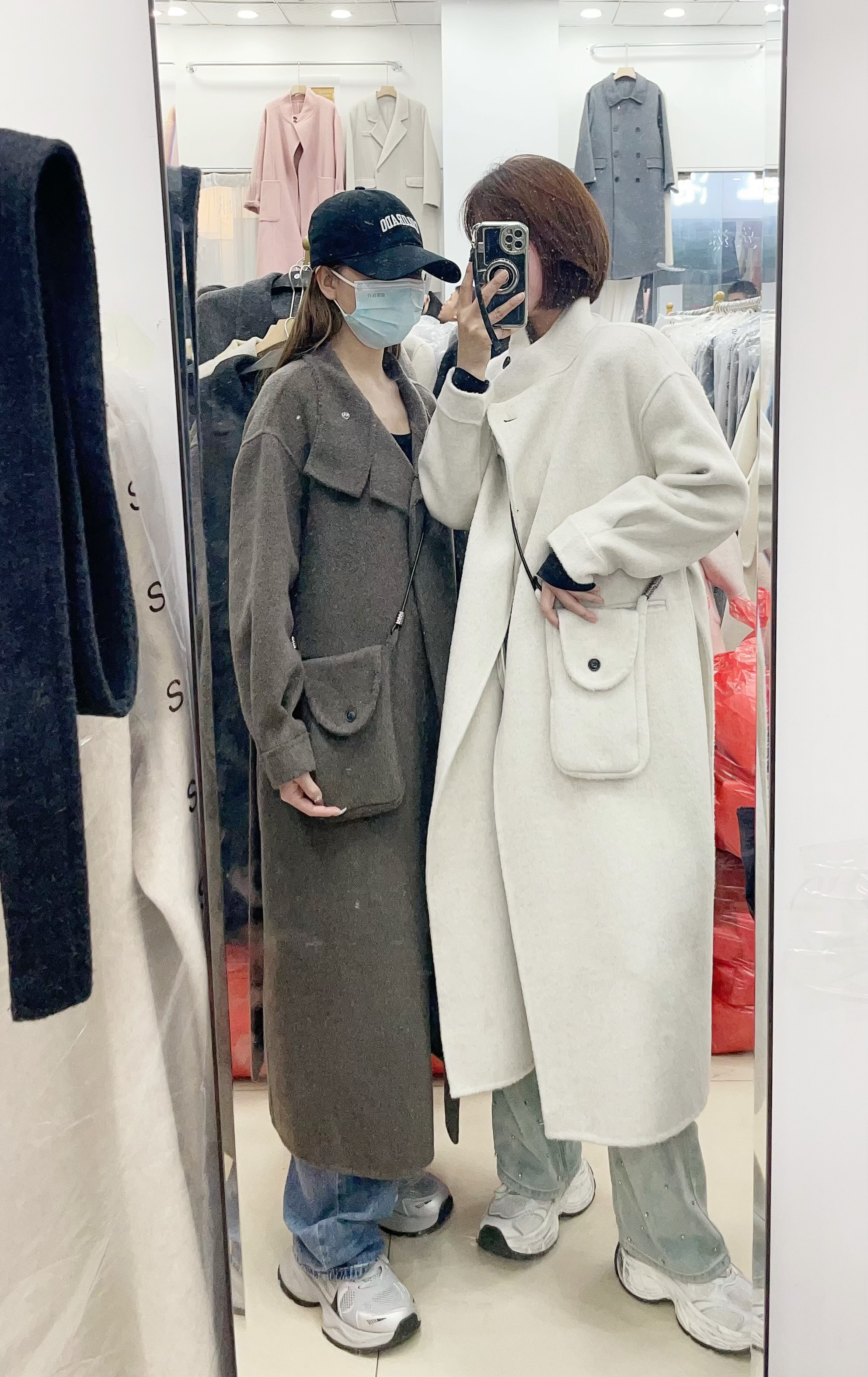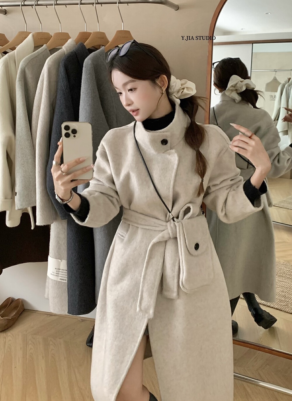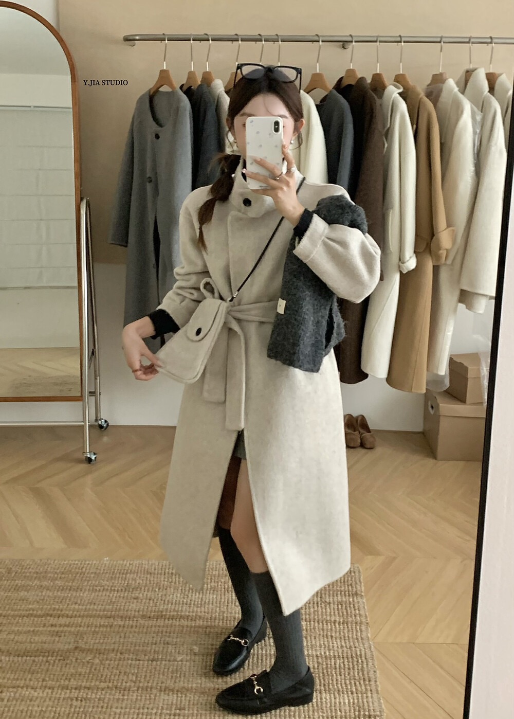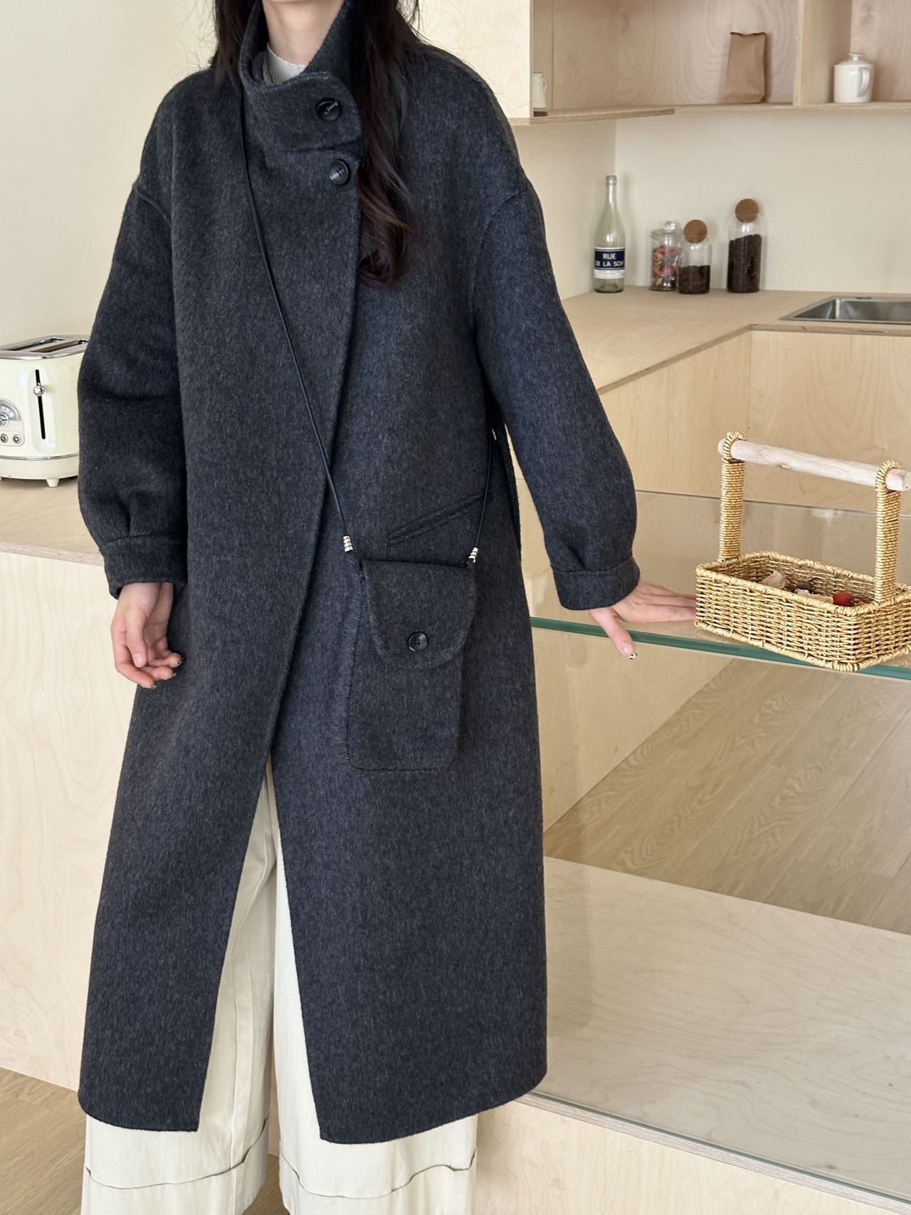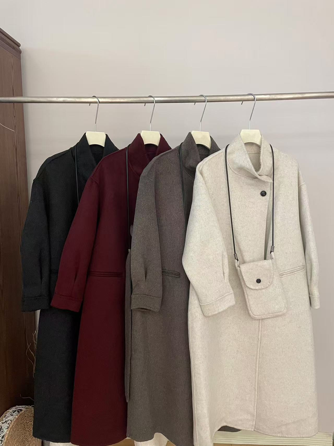 【YW】无忧购韩系休闲简约立领宽松中长款双面羊毛大衣(含斜挎包腰带)(截单后7天发货)25年清仓捡漏