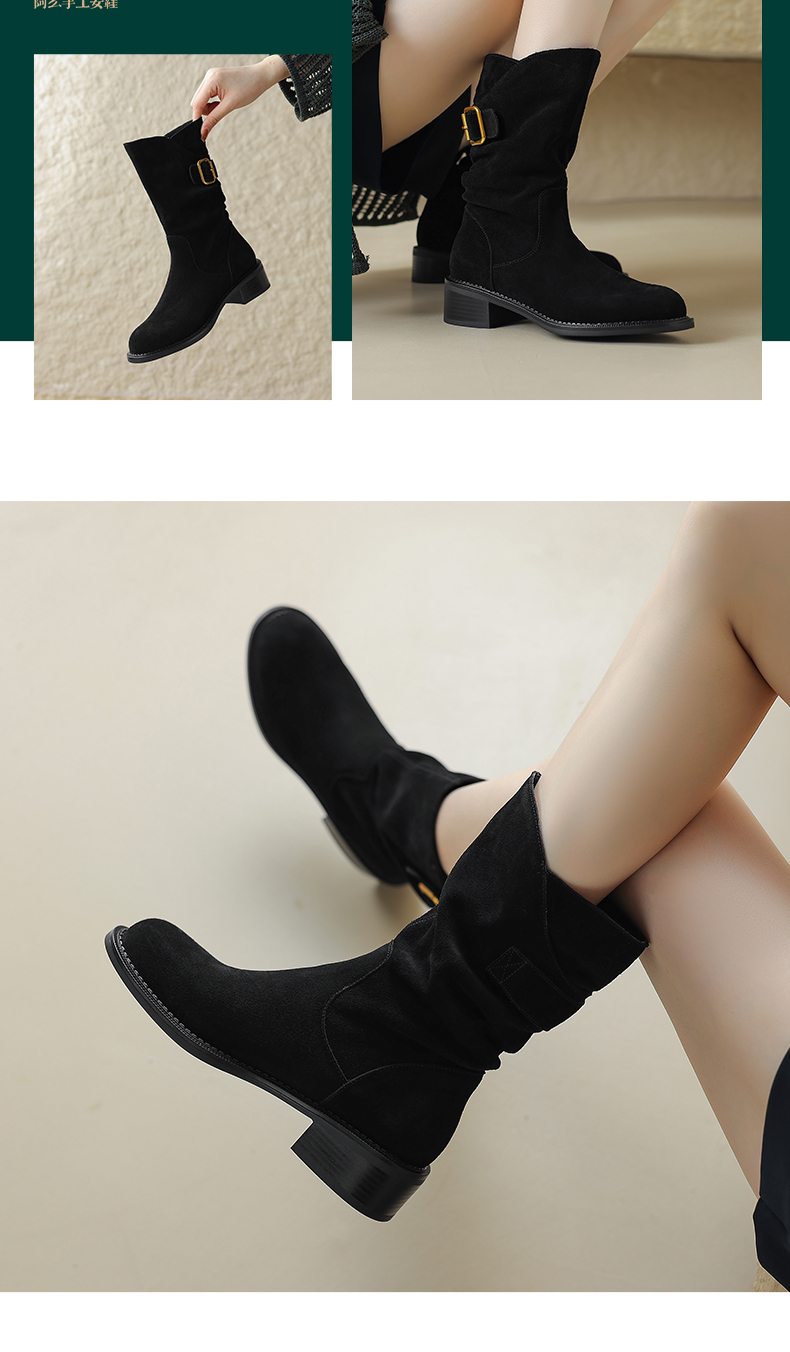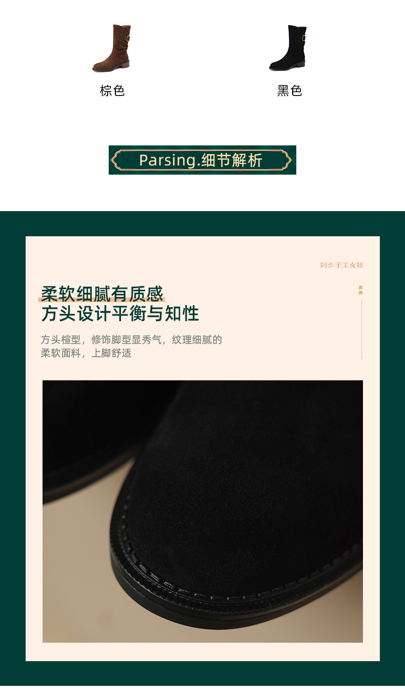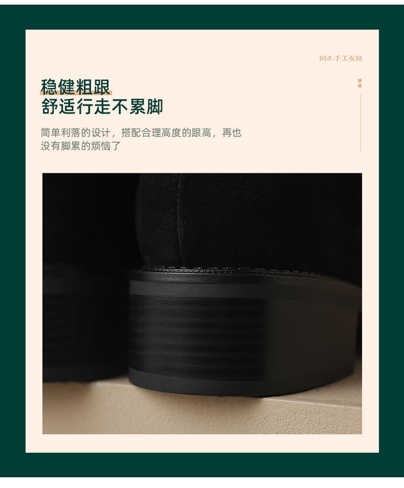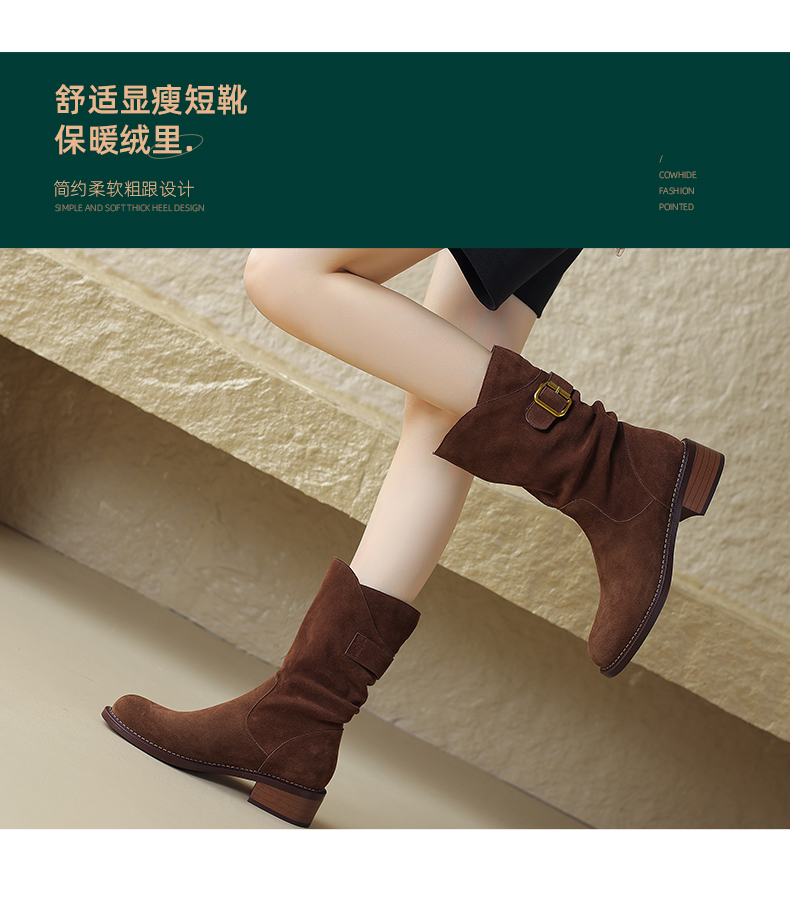 阿么手工女鞋复古粗跟秋冬厚底加绒堆堆靴5CM皮扣短靴西部靴百搭