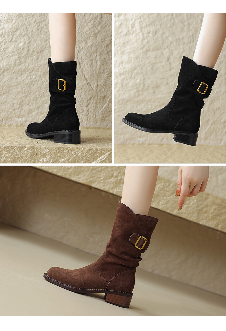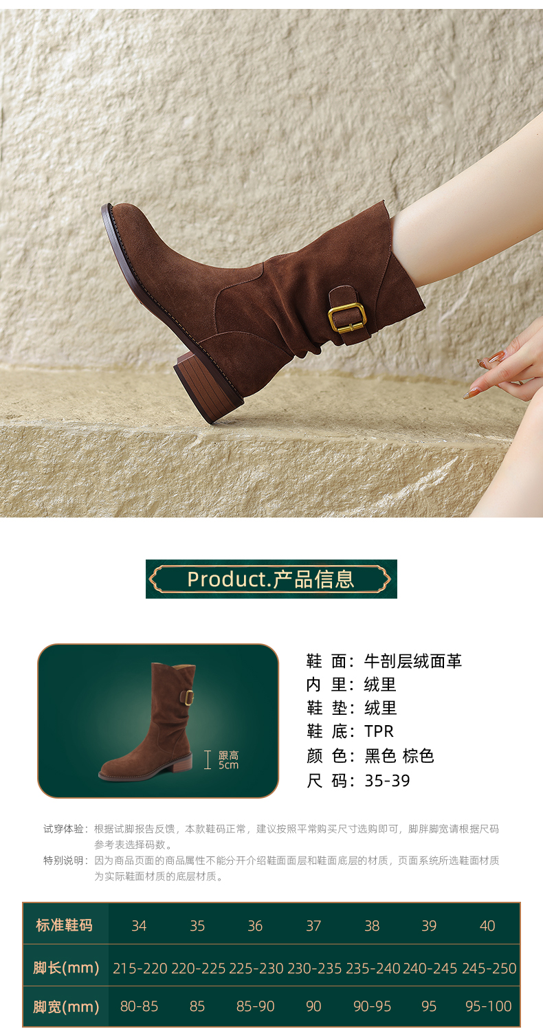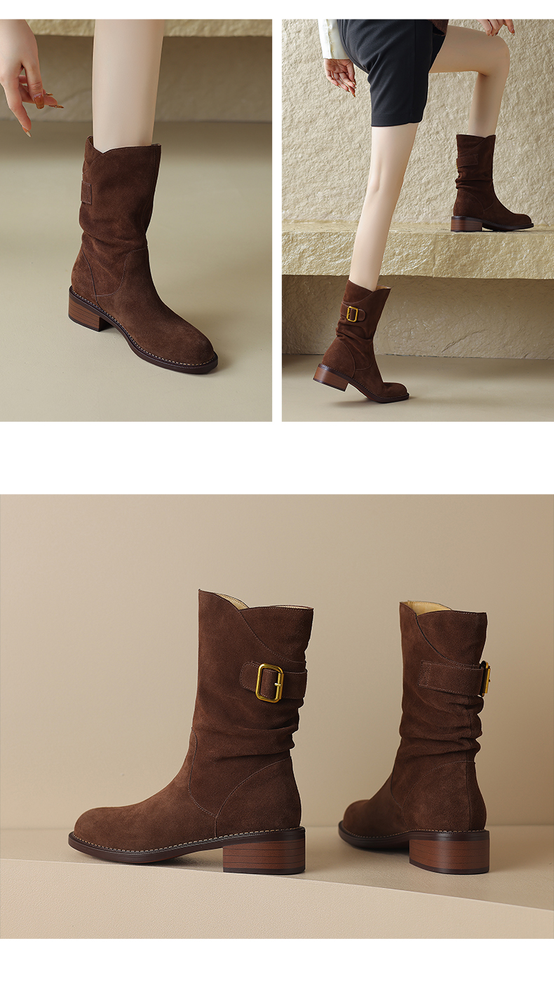 阿么手工女鞋复古粗跟秋冬厚底加绒堆堆靴5CM皮扣短靴西部靴百搭