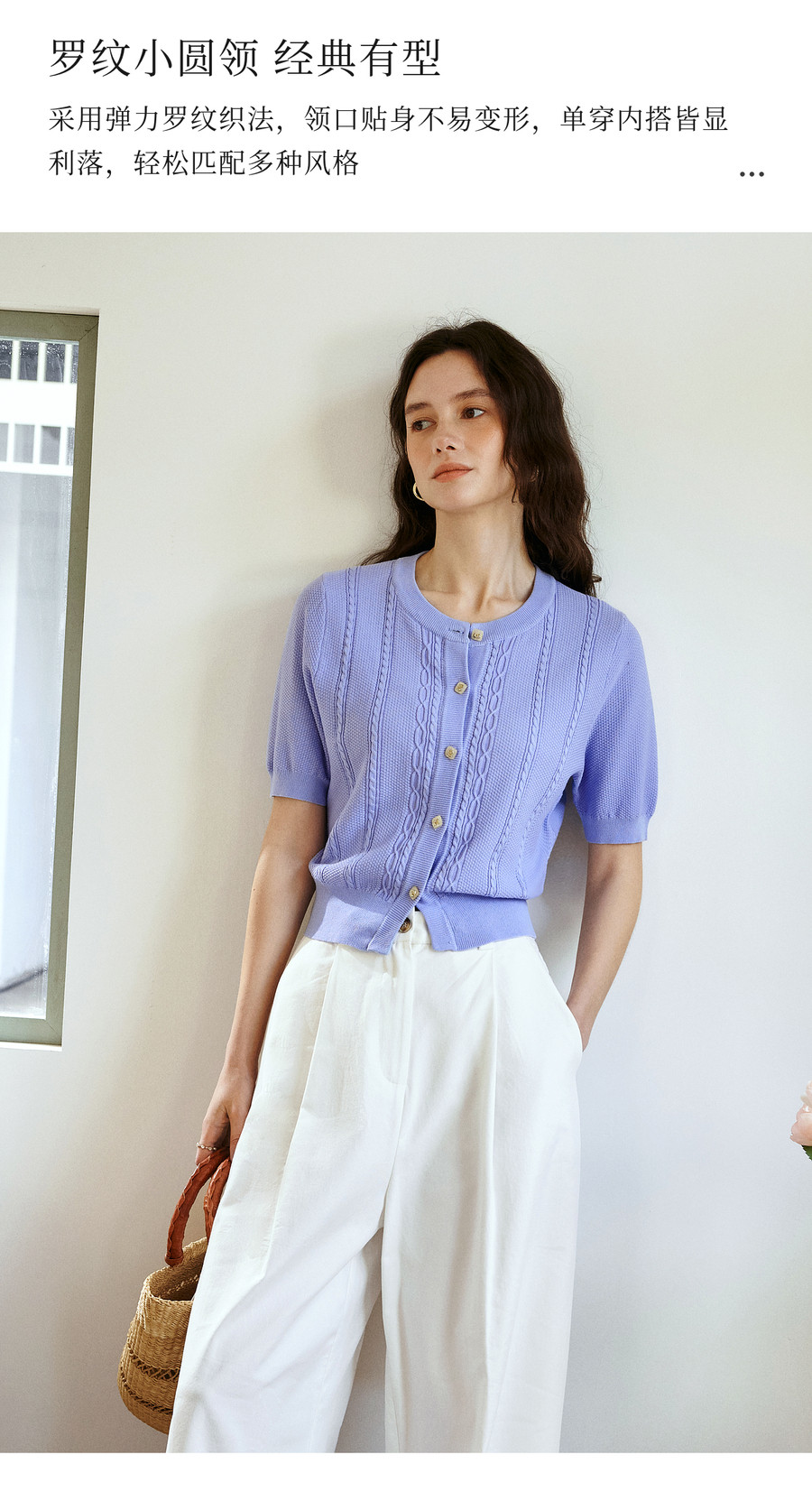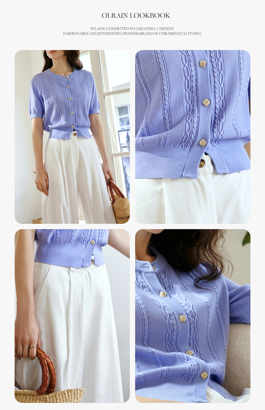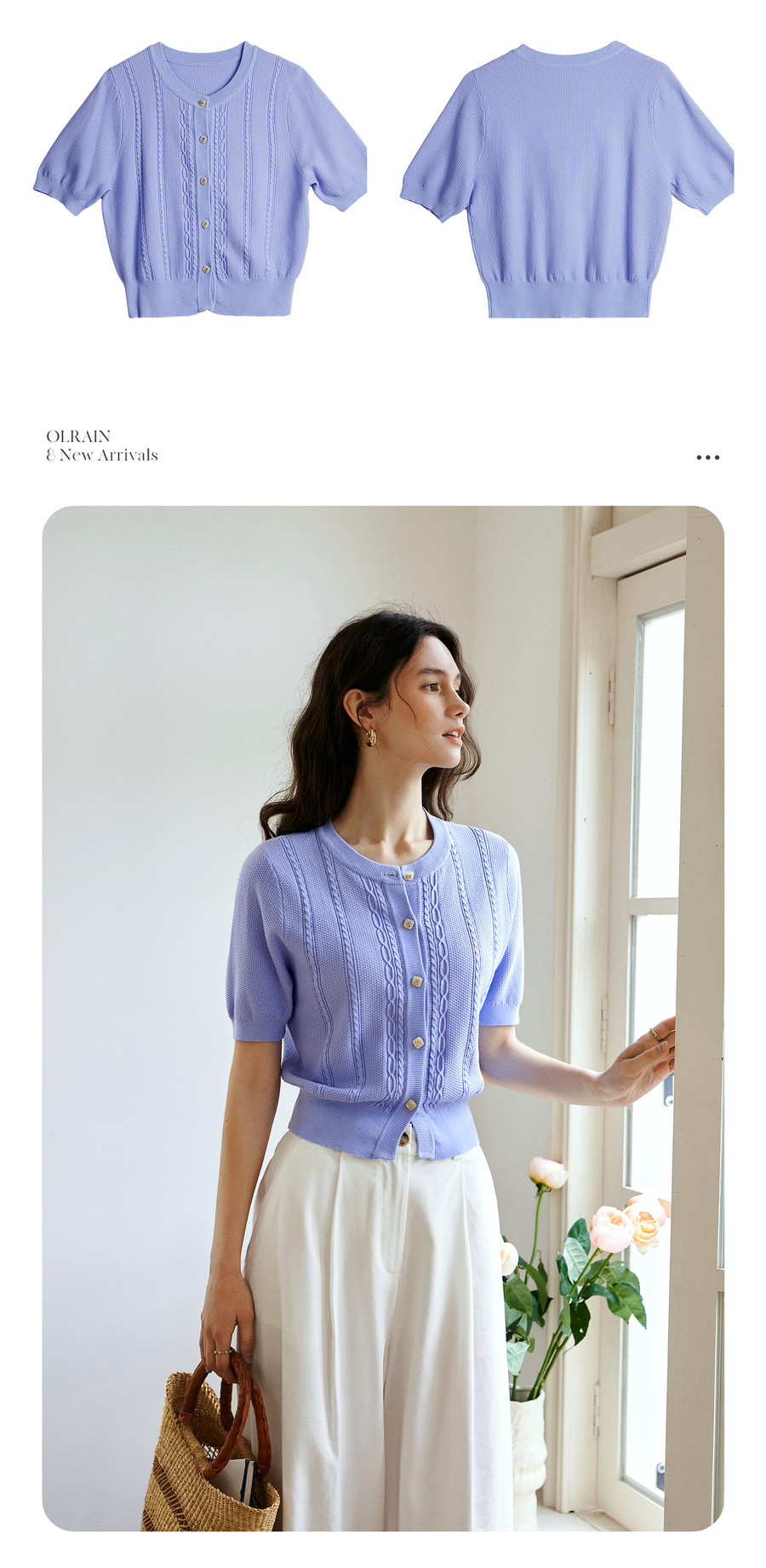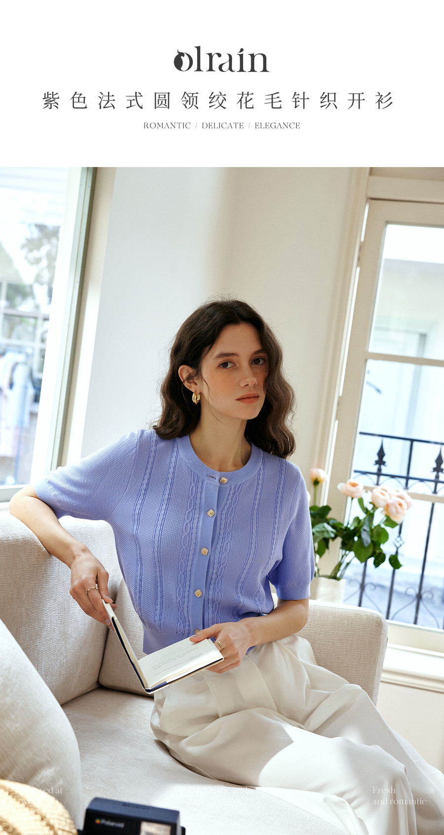 OLrain欧芮儿2026新款女夏季紫色法式圆领绞花毛针织开衫短袖上衣