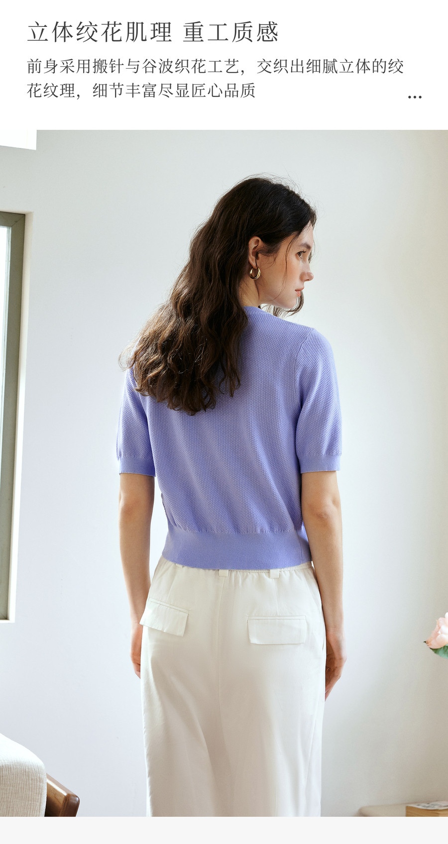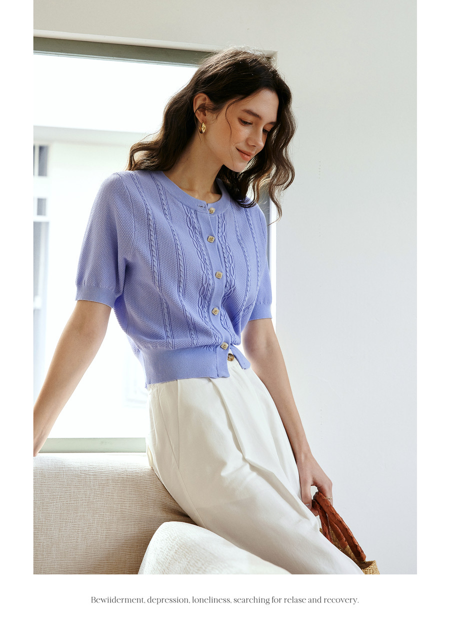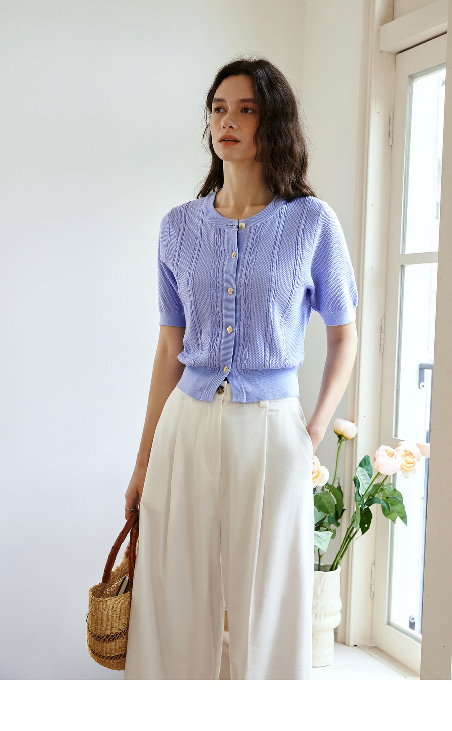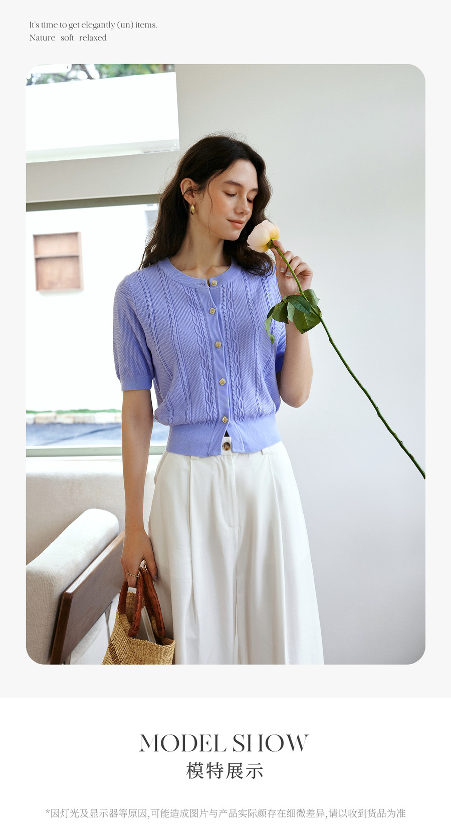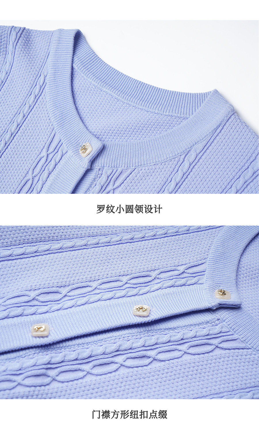 OLrain欧芮儿2026新款女夏季紫色法式圆领绞花毛针织开衫短袖上衣