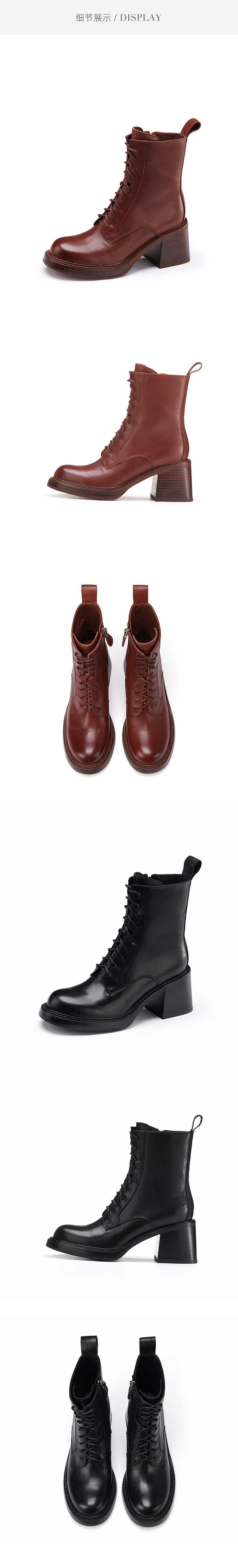 westory秋冬小个子英伦风真皮粗跟圆头绑带马丁靴女82071