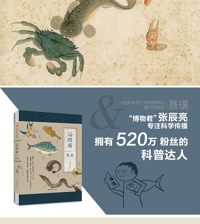 ※聂璜,一位具有现代博物精神的清代手绘师。《海错图》一本面世不久即被皇家珍藏的清代海洋生物图谱。张辰亮,一位专注科学传播,拥有520万粉丝的“博物君”。30篇精彩的海洋生物探查笔记,50余张清代古书原版图,200余张物种照片,共成一场跨越时空的科普“对谈”,一次详解清代海洋生物的博物之旅。