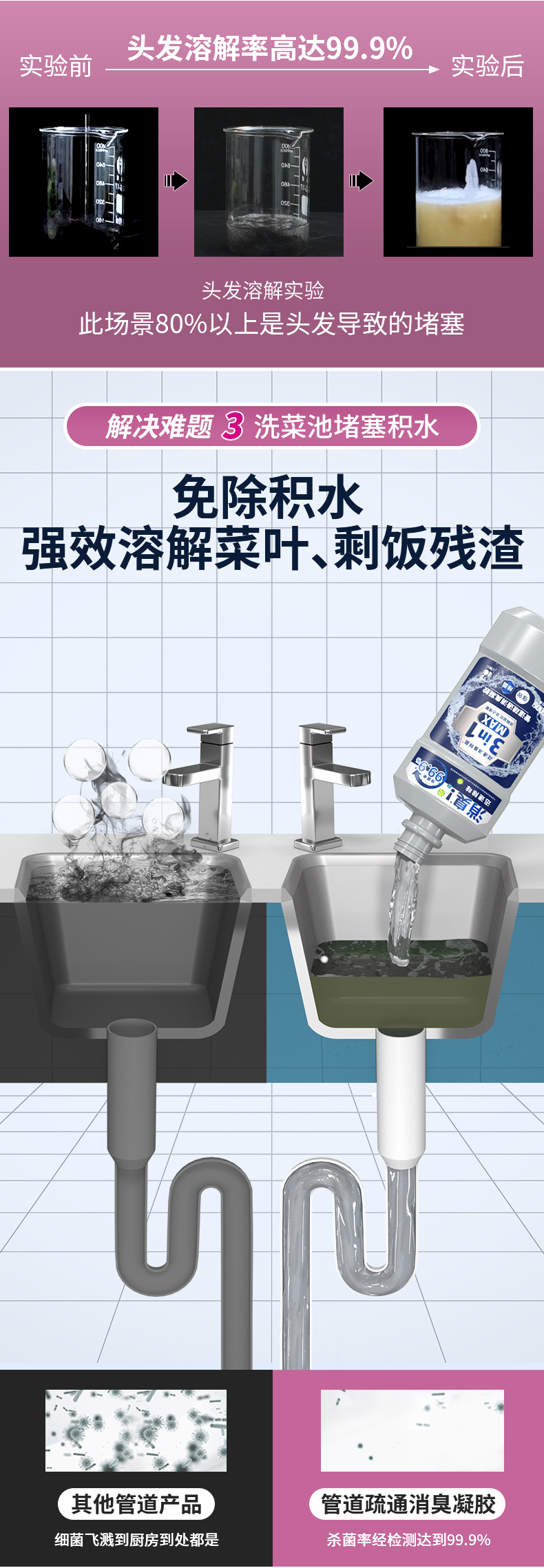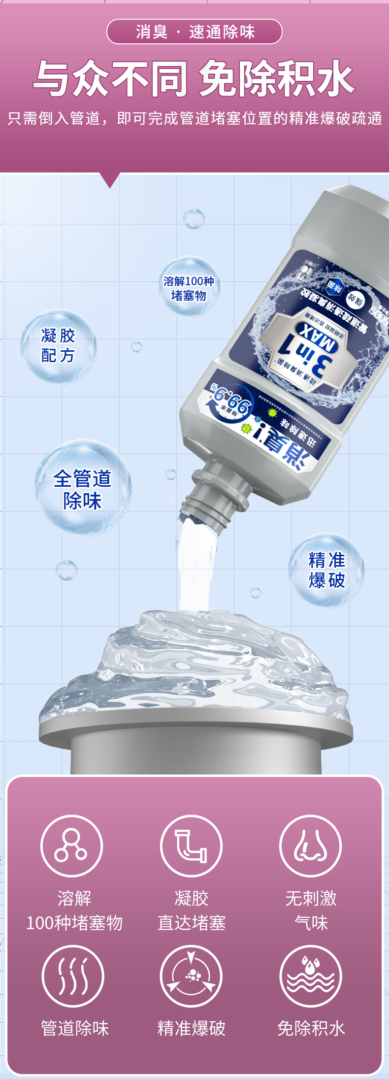 疏通+消臭+杀菌+防虫,一瓶搞定全家管道问题,没有异味,不刺鼻,抑菌率99%;