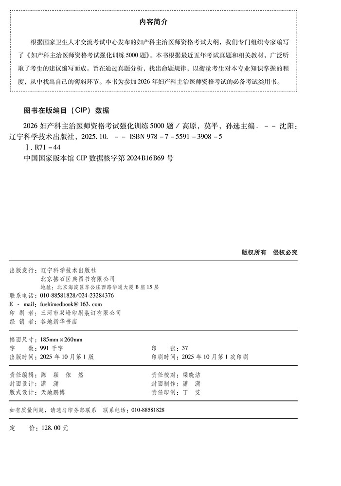 2026妇产科主治医师资格考试强化训练5000题 全国初中级卫生专业技术资格考试辅导丛书 高原 莫平 孙选 主编 辽宁科学技术出版社
