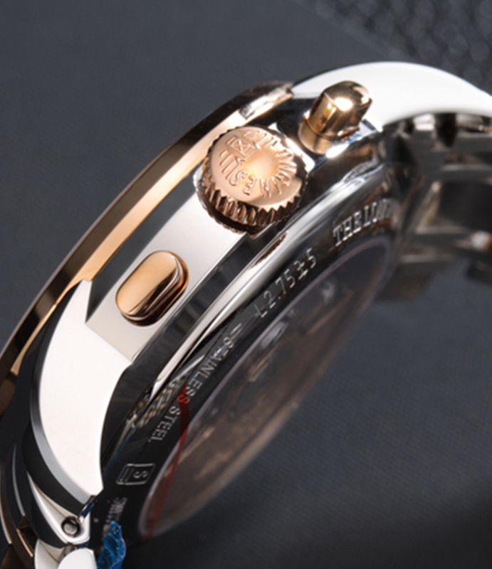 镜面 材质 | 蓝宝石水晶玻璃 | 表盘 | 精钢 PVD镀玫瑰金表壳 白色表盘 计时码表 日期显示 透底 |