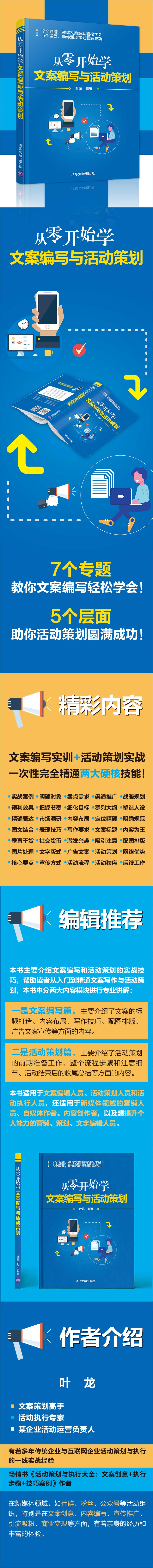 "《从零开始学文案编写与活动策划》旨在从文案创作与活动策划这两个方面给大家提供系统的知识学习。本书内容全面,结构清晰,语言简洁,内容知识点框架如下。 (1) 文案创作篇。文案创作篇的知识内容分布在本书第1 ~ 7 章,主要的知识要点包括:文案的写作建议和经验、文案方向的掌握和定位的方法、内容布局和表现技巧、标题的写作技巧和案例分析、优质内容的写作方法、文案的配图和排版,以及广告文案的特点讲解等,基本上涵盖了文案创作所有的知识技能内容。 (2) 活动策划篇。活动策划篇的知识内容分布在本书的第8 ~ 12 章,主要的知识要点包括:活动策划的优势作用以及网络对活动策划的帮助和影响、活动前期准备工作的核心要点、活动的整个流程步骤和活动进行时要把握的细节、活动结束后的清场收尾和总结复盘等。 当然,活动策划篇的“压轴大戏”——活动策划实战案例,安排到了末章来详细地讲解,也不负广大读者的殷切期望。第12 章列举了10 个典型、热门的活动策划类型案例讲解和实操模拟,可以帮助对于活动运作不是很熟练的策划新手迅速掌握其中的精髓。 通过本书的学习,你不仅可以掌握文案编写的写作技巧,让自己成为一个“妙笔生花” 的人,还可以轻松搞定各种类型的活动策划,帮助你提升自己的价值和竞争力,让你成为职场上耀眼的那颗星。希望大家通过学习各种技能和知识,不断地充实和提升自己,在未来遇见更好的自己!"