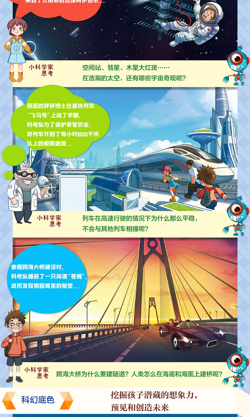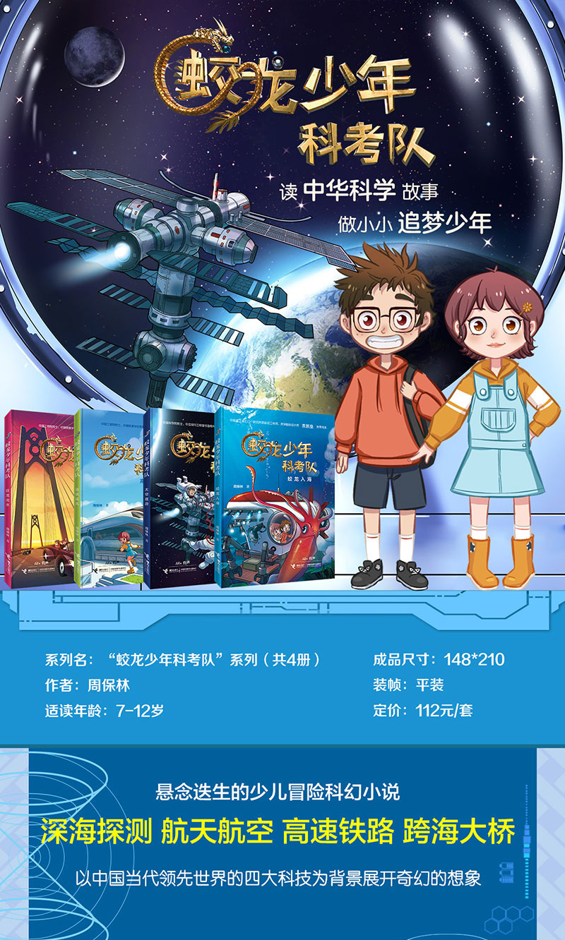 这是一套适合7-12岁孩子阅读的冒险科幻小说,它以中国前沿的科学技术成果为背景,内容涵盖我国取得举世瞩目成就的航天航空、深海探测、高速铁路、跨海大桥等科技领域,故事惊险,悬念迭生,充满基于尖端科技理论的奇异幻想,书中涉及的科学原理与知识,全部经国内著名科学家团队审订。作品儿童情趣浓郁,放飞少年儿童幻想,满足读者惊奇之心,在读者心灵中播撒科学和幻想的种子,滋养民族自信心。