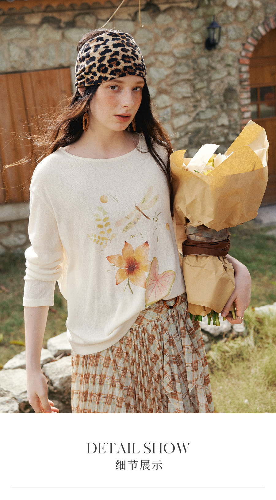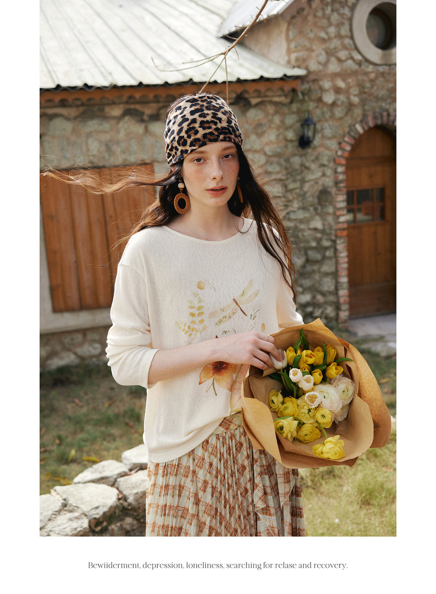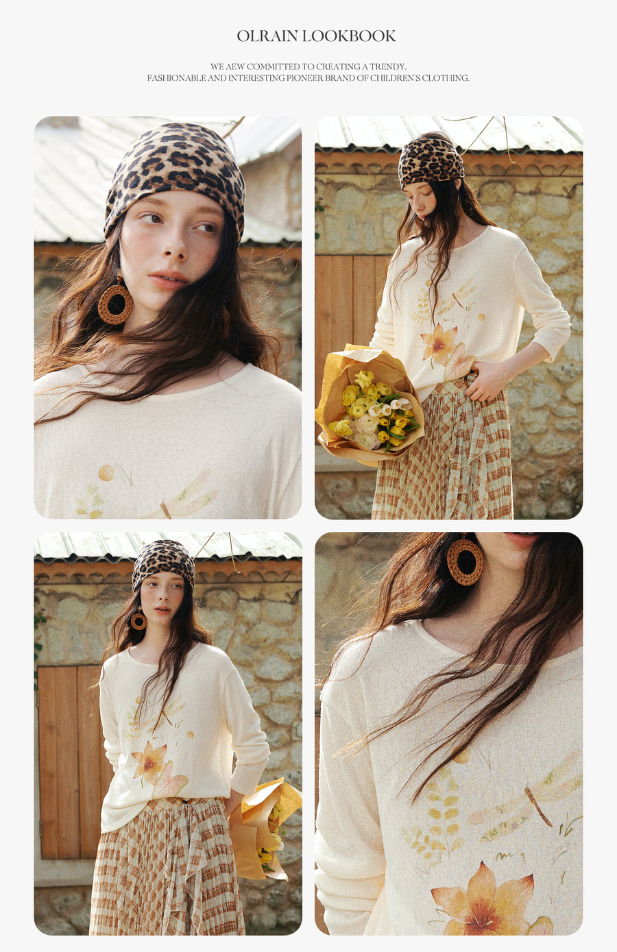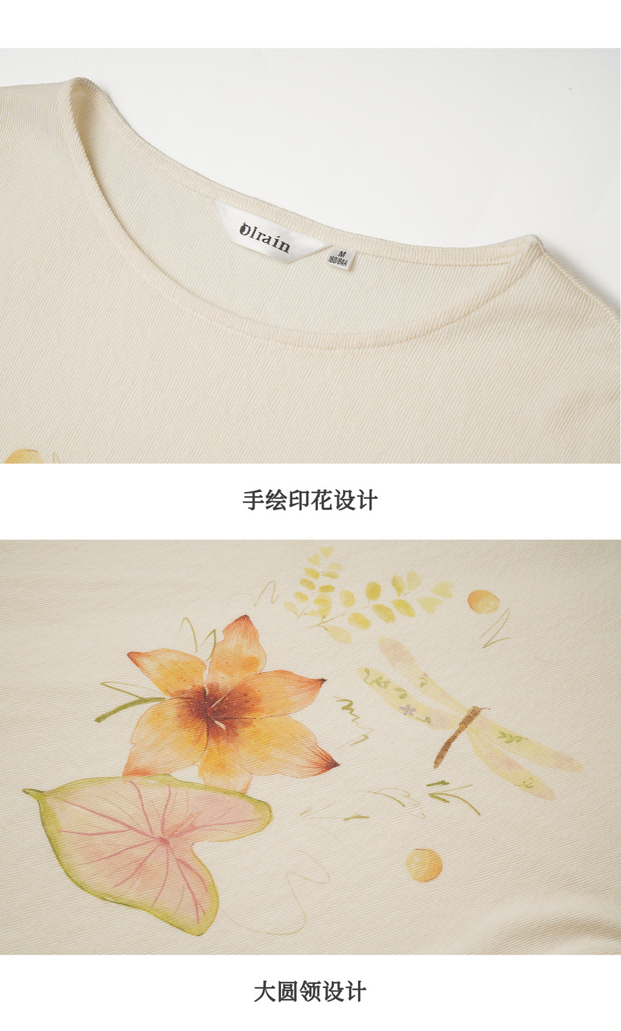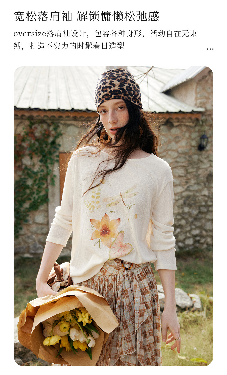 欧芮儿2026春新款莱赛尔手绘印花长袖T恤女慵懒风落肩袖宽松上衣
