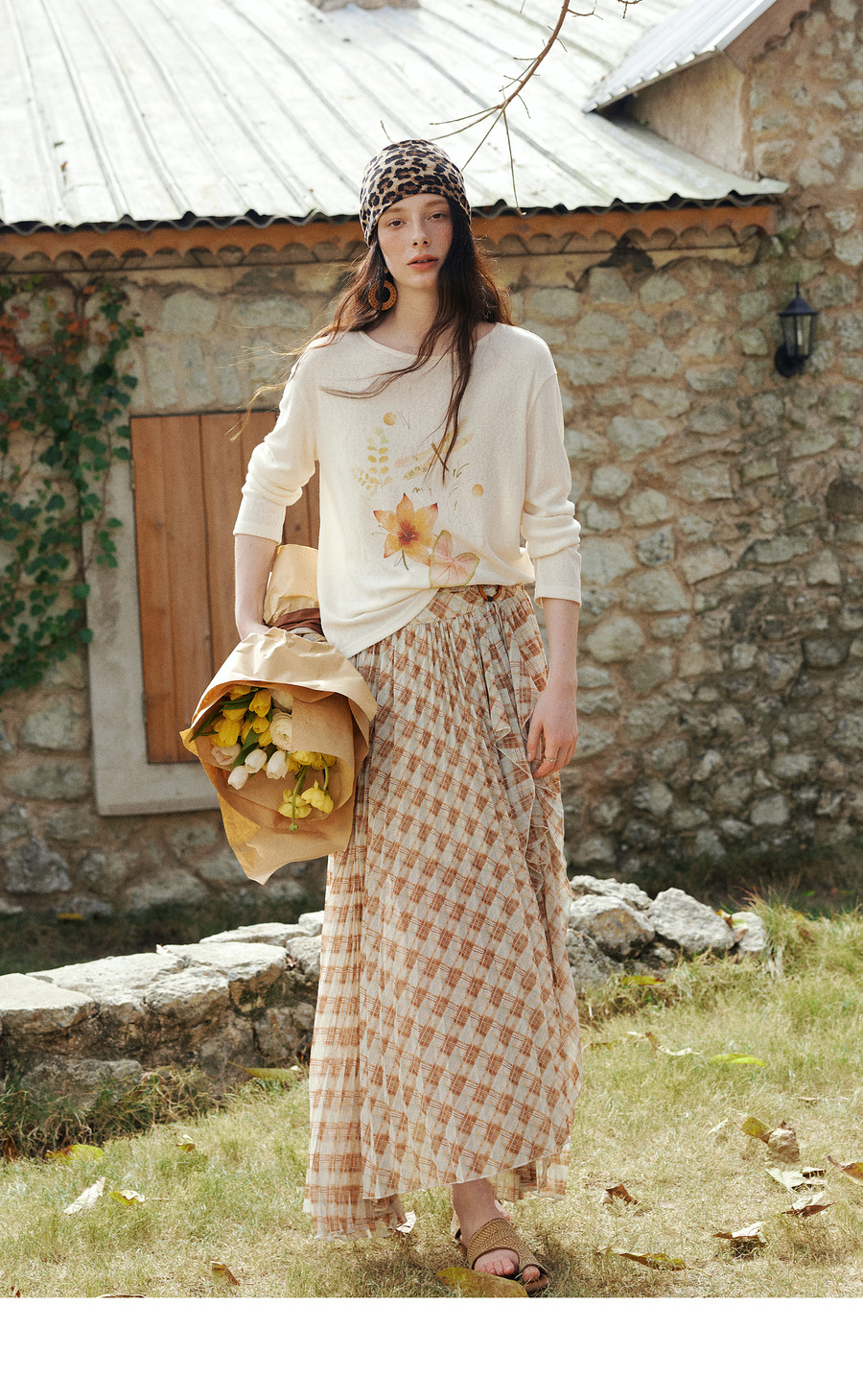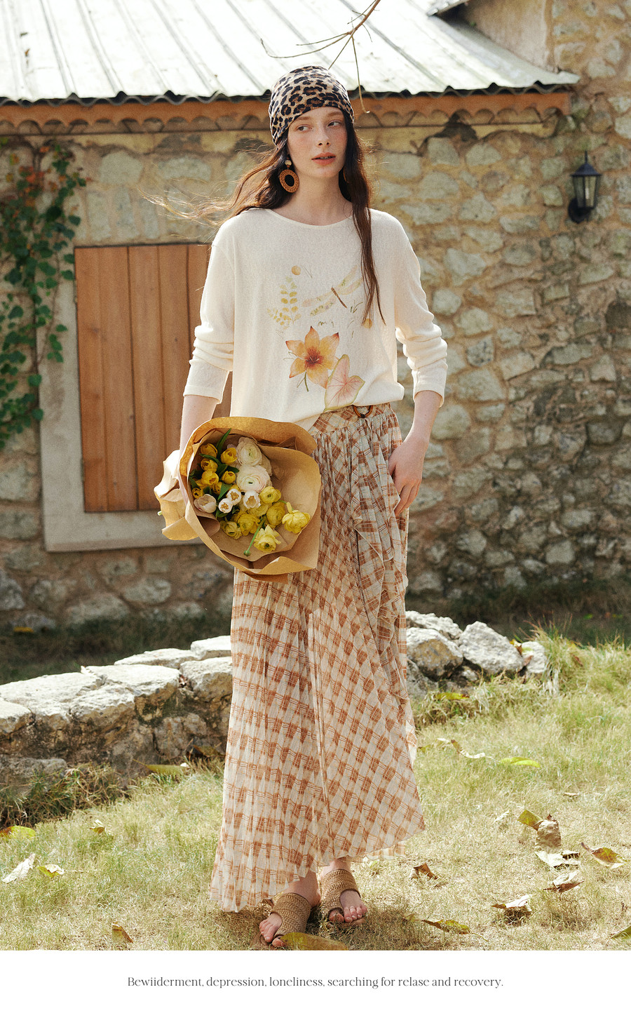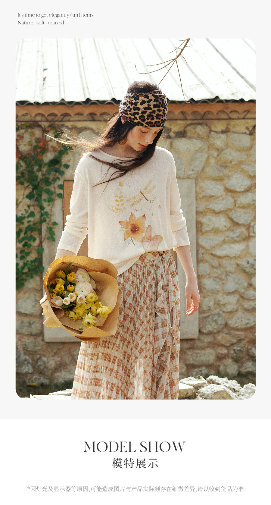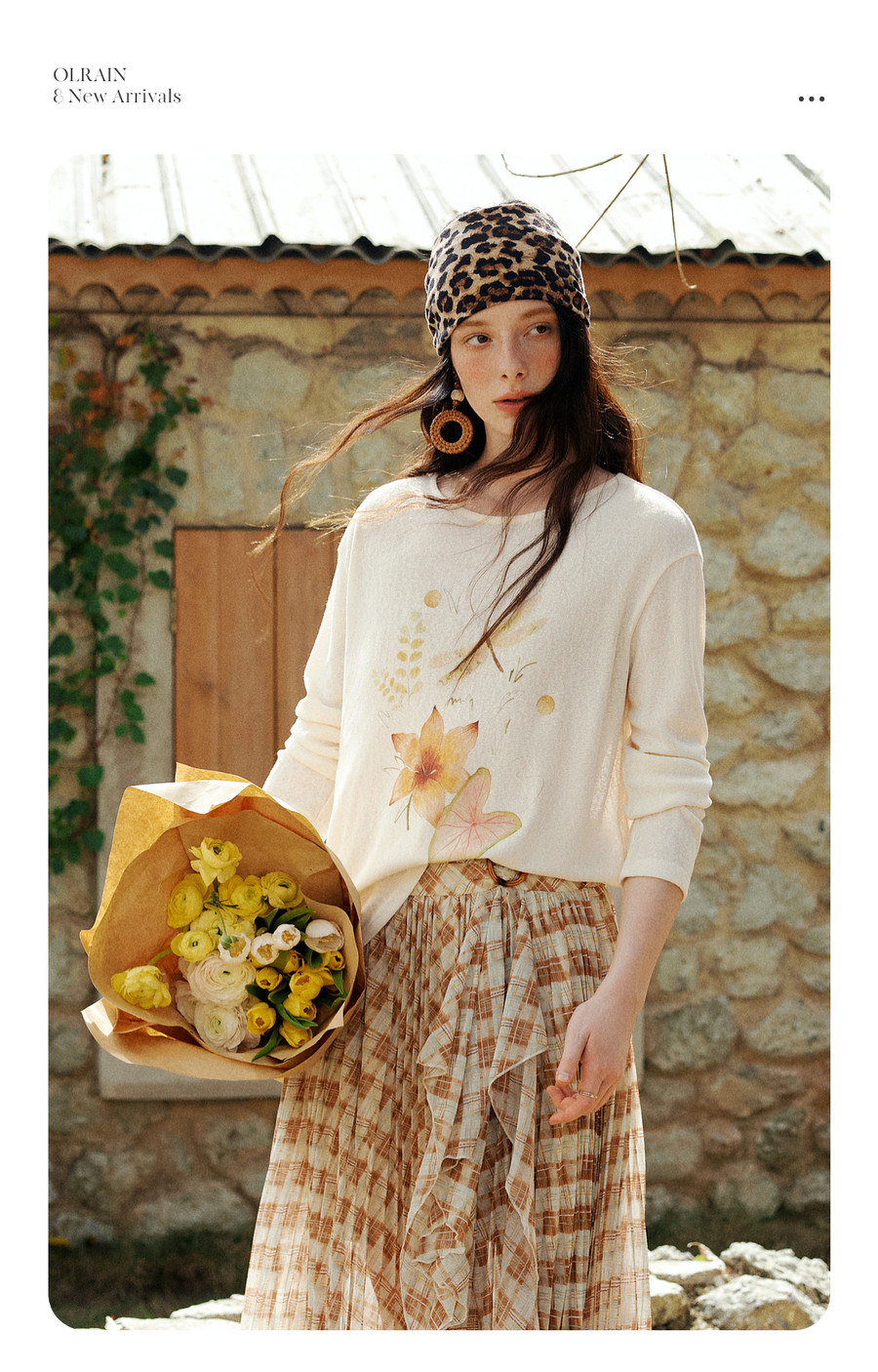 欧芮儿2026春新款莱赛尔手绘印花长袖T恤女慵懒风落肩袖宽松上衣