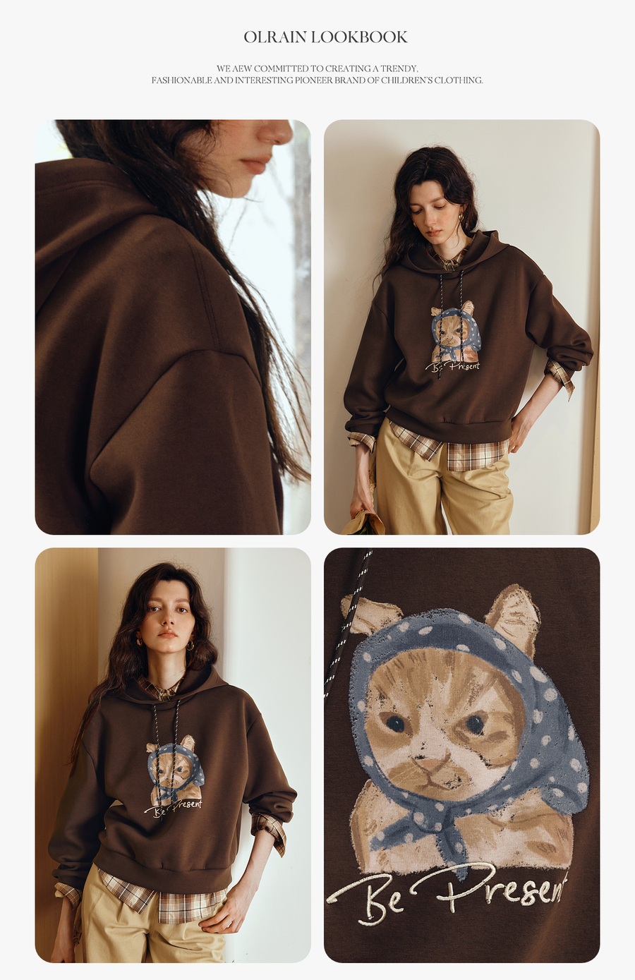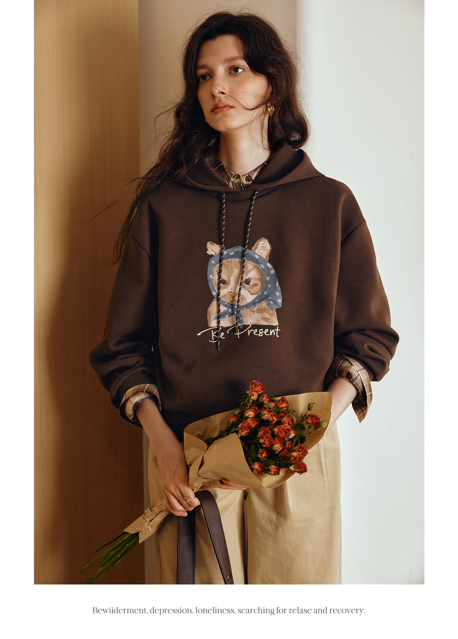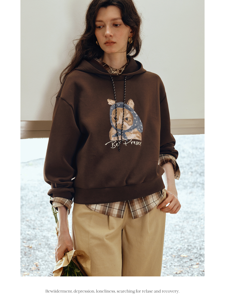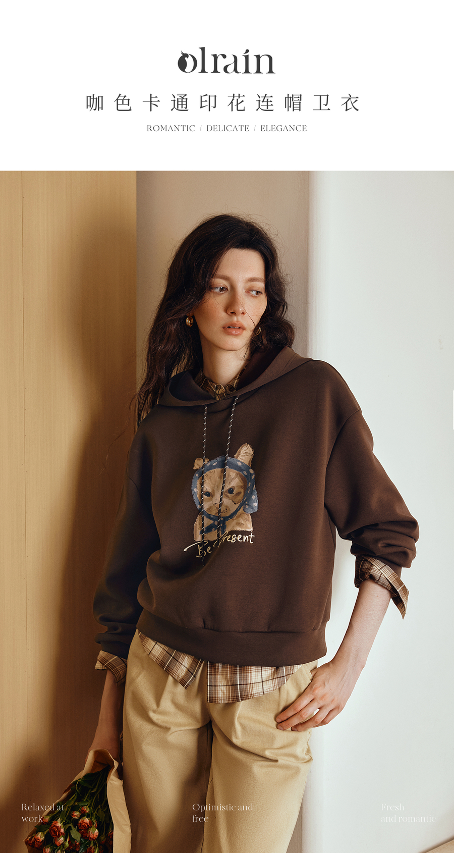 OLrain欧芮儿2025新款女秋季慵懒风咖色上衣卡通印花宽松连帽卫衣
