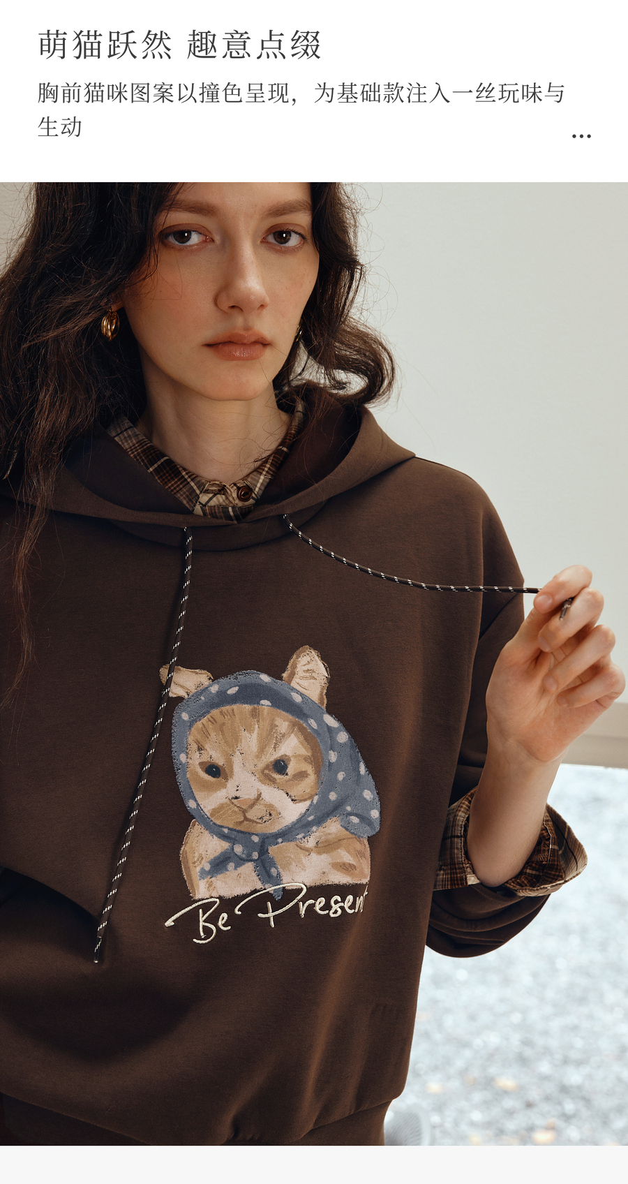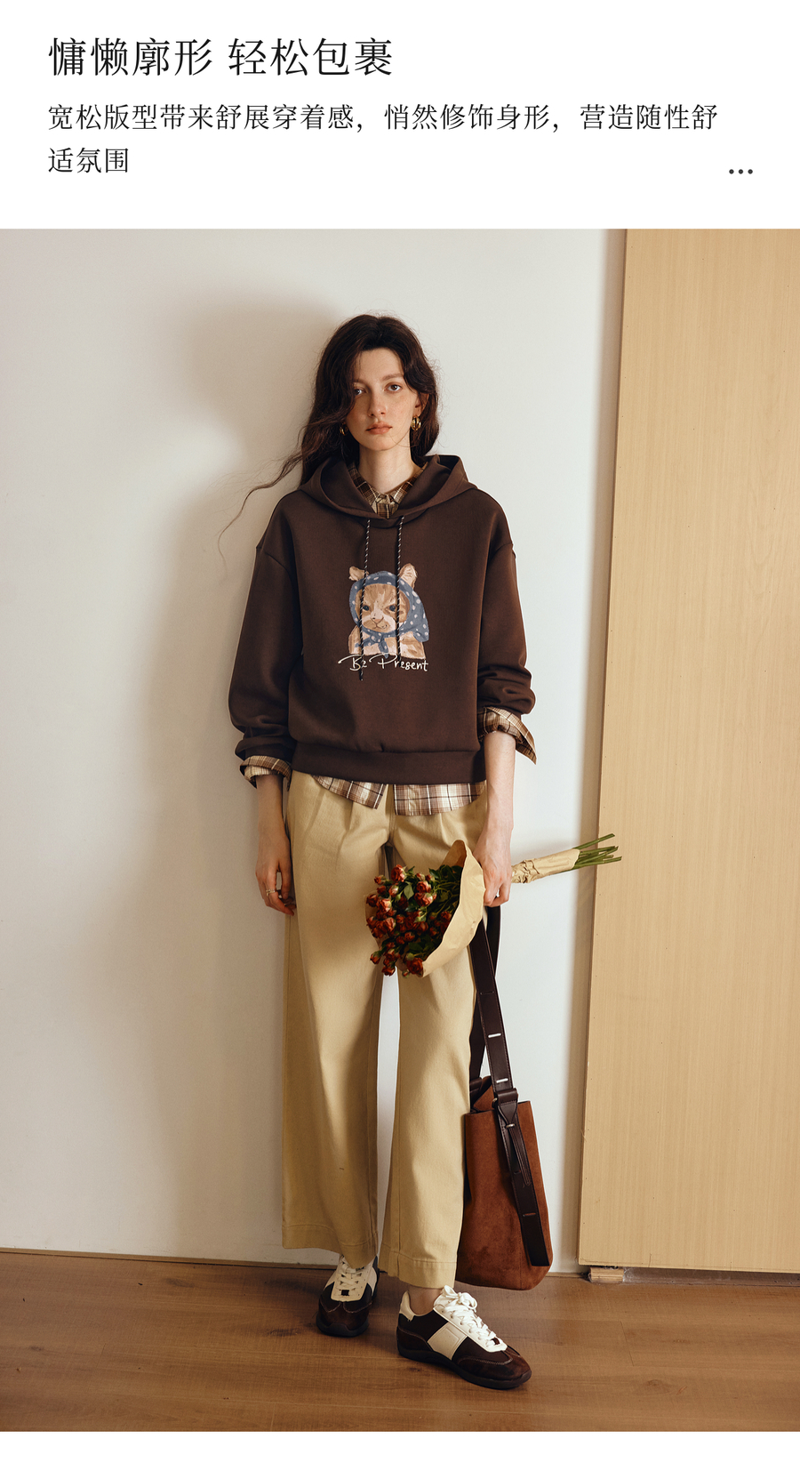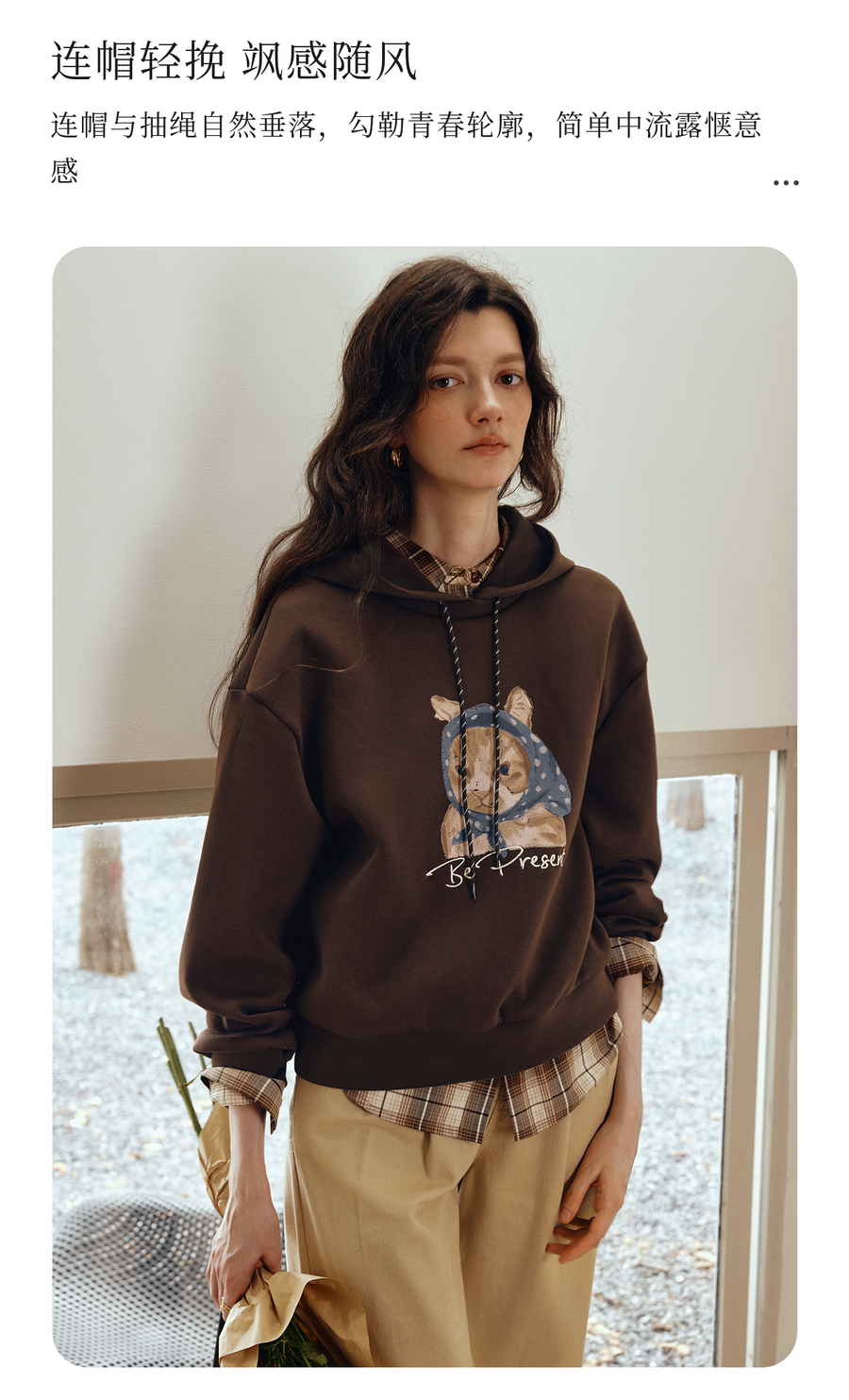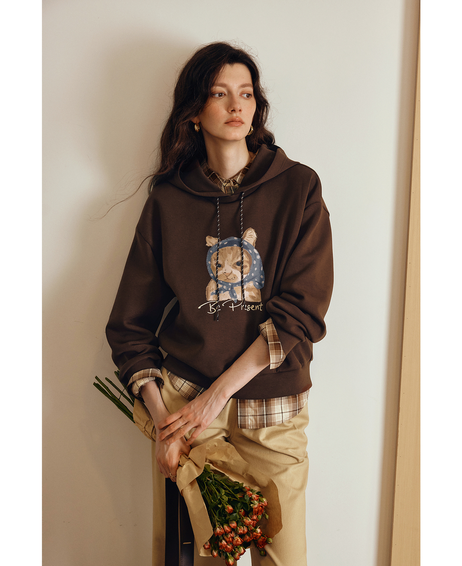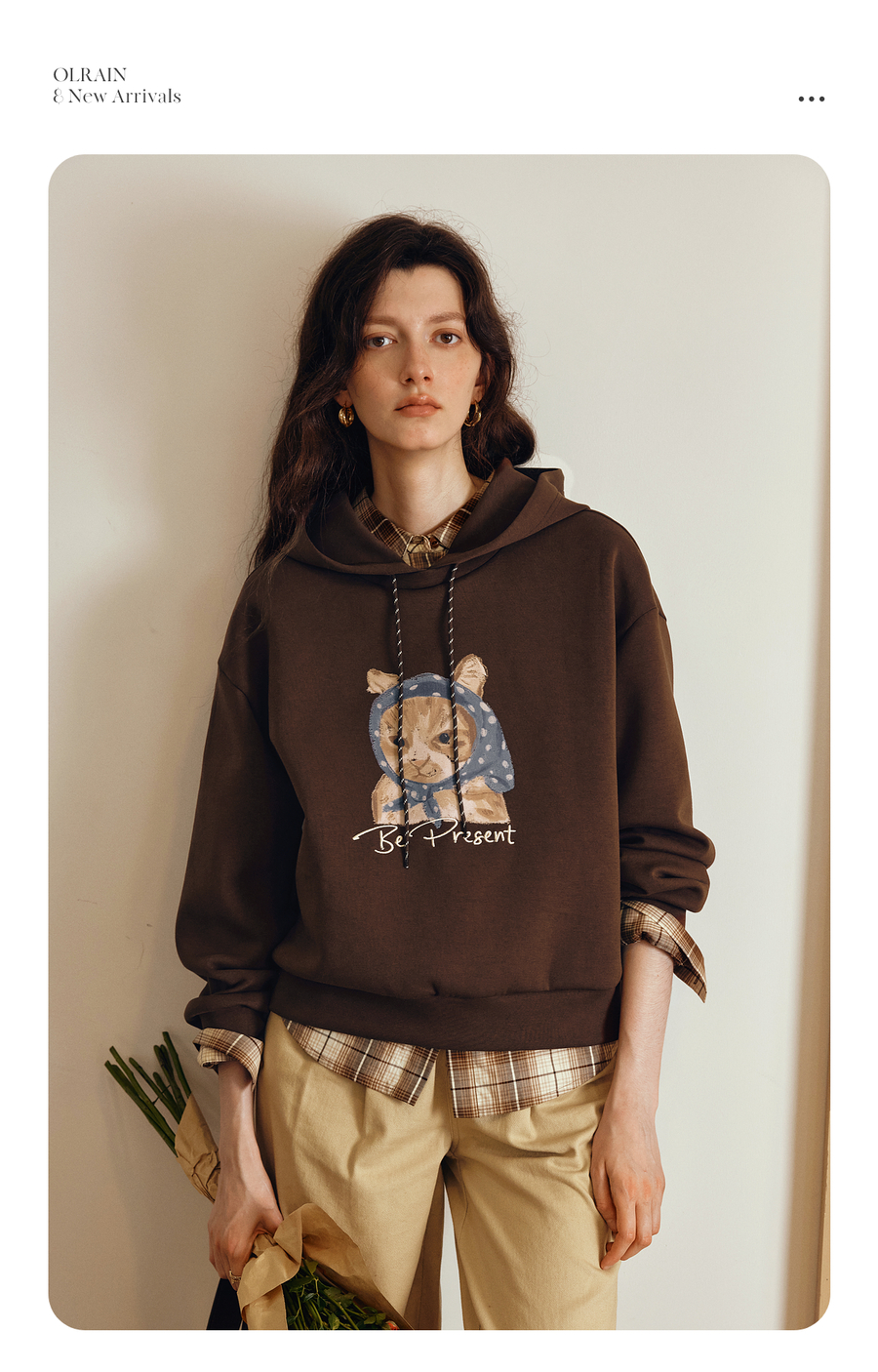OLrain欧芮儿2025新款女秋季慵懒风咖色上衣卡通印花宽松连帽卫衣