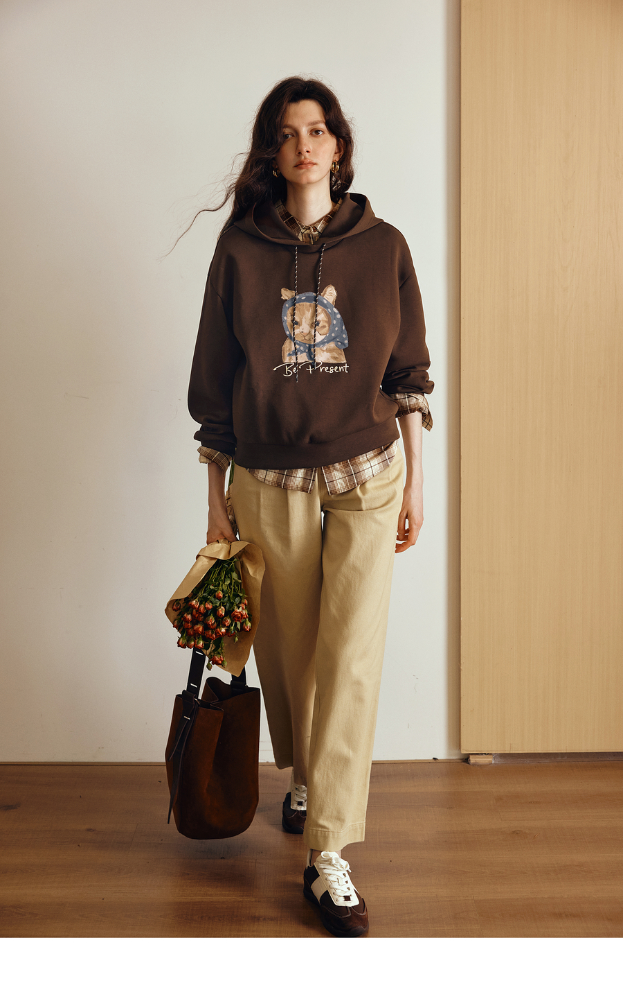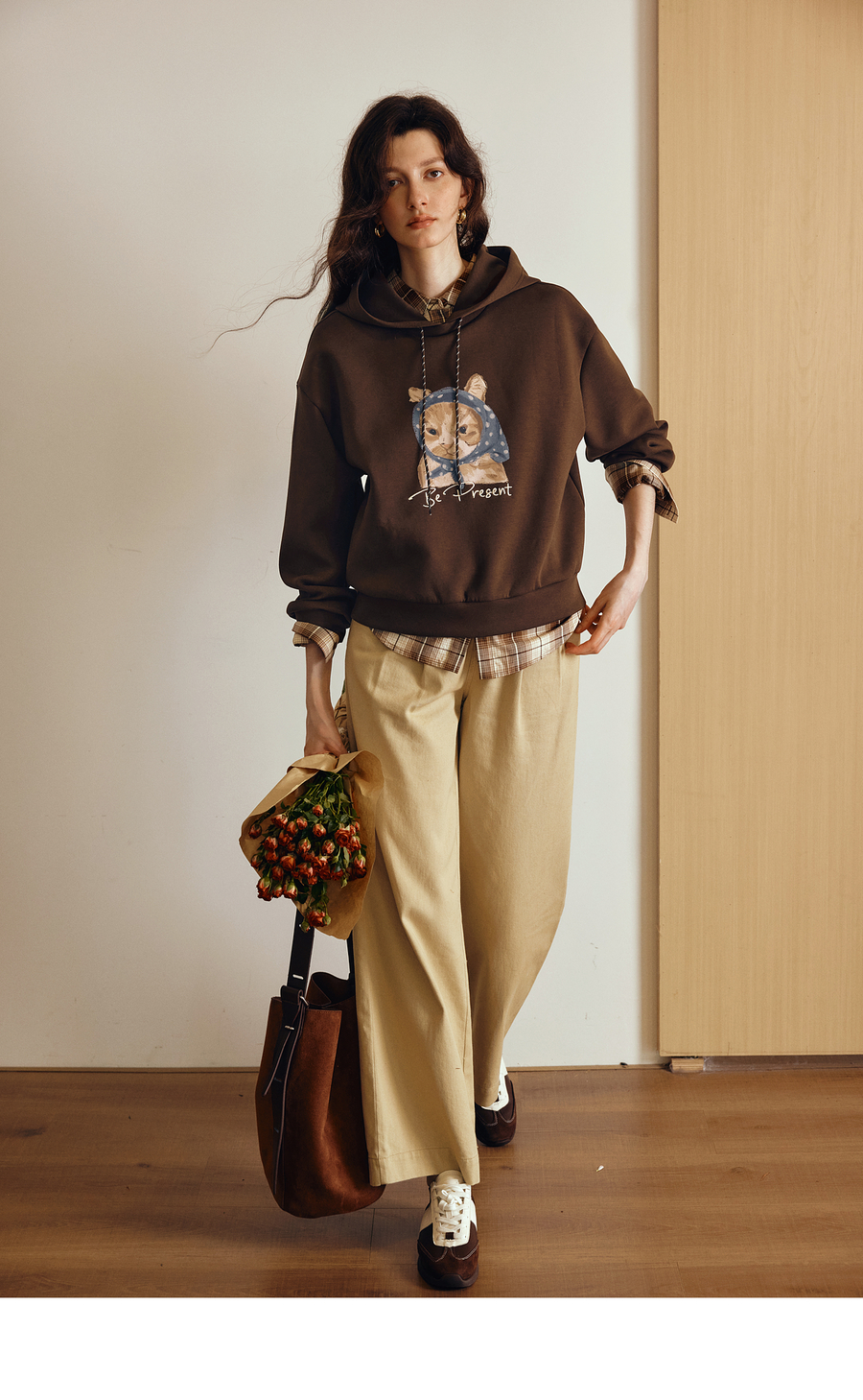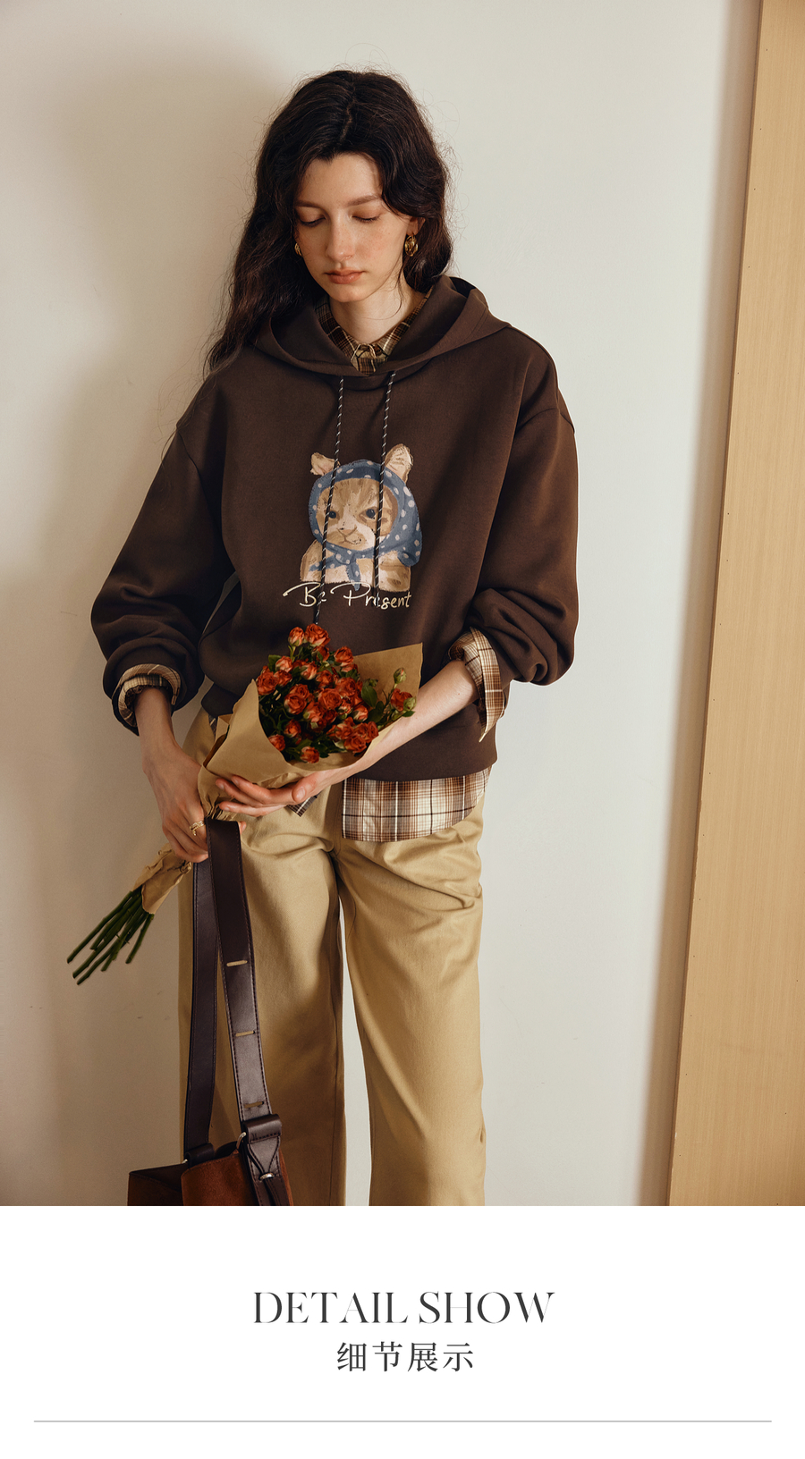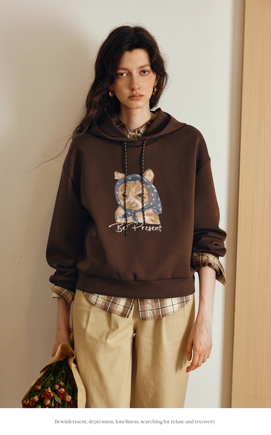 OLrain欧芮儿2025新款女秋季慵懒风咖色上衣卡通印花宽松连帽卫衣