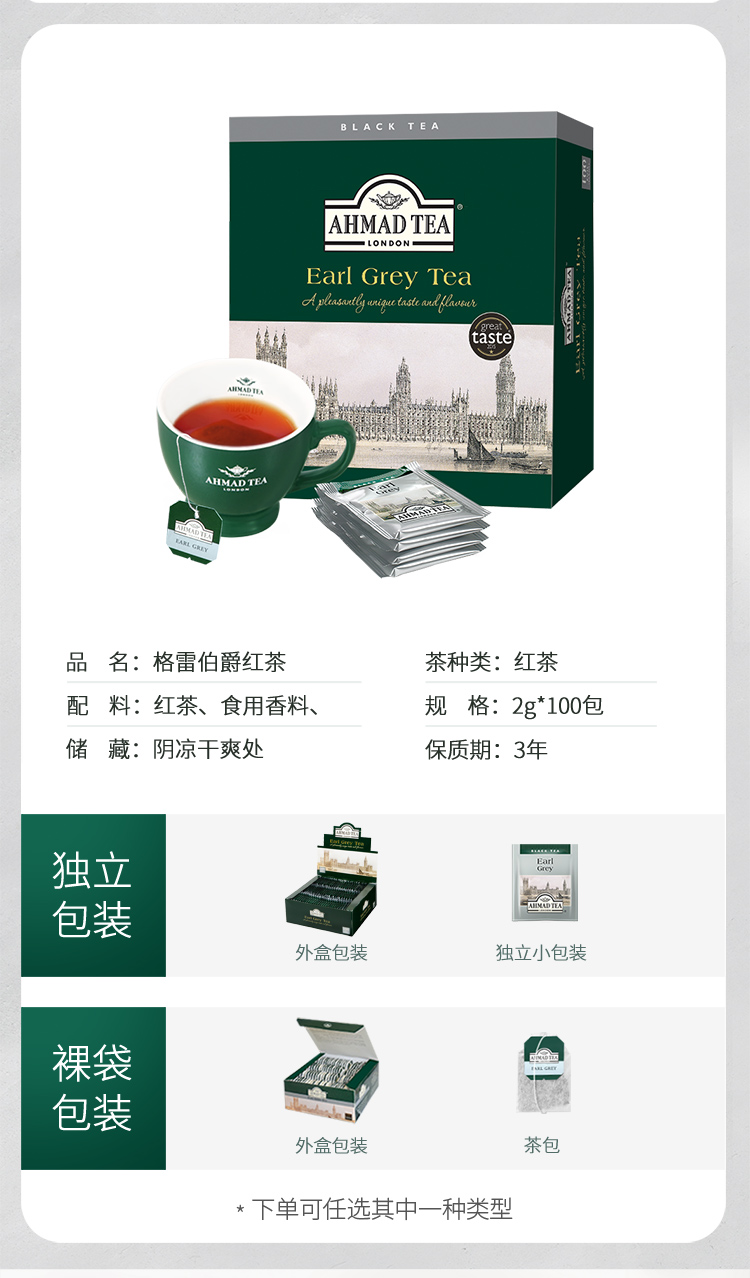 AHMADTEA 英国亚曼茶 伯爵红茶烘焙100包 奶茶必备伴侣 英国进口